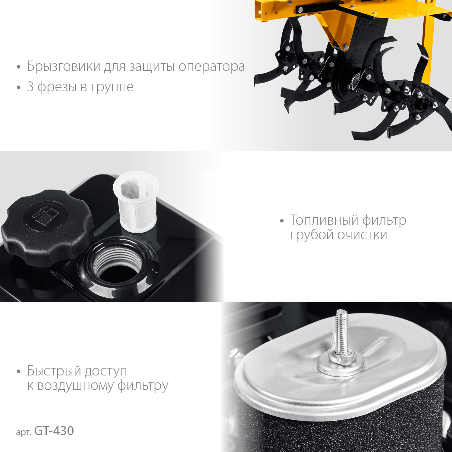 - Универсальная сцепка позволяет использовать различное навесное оборудование
