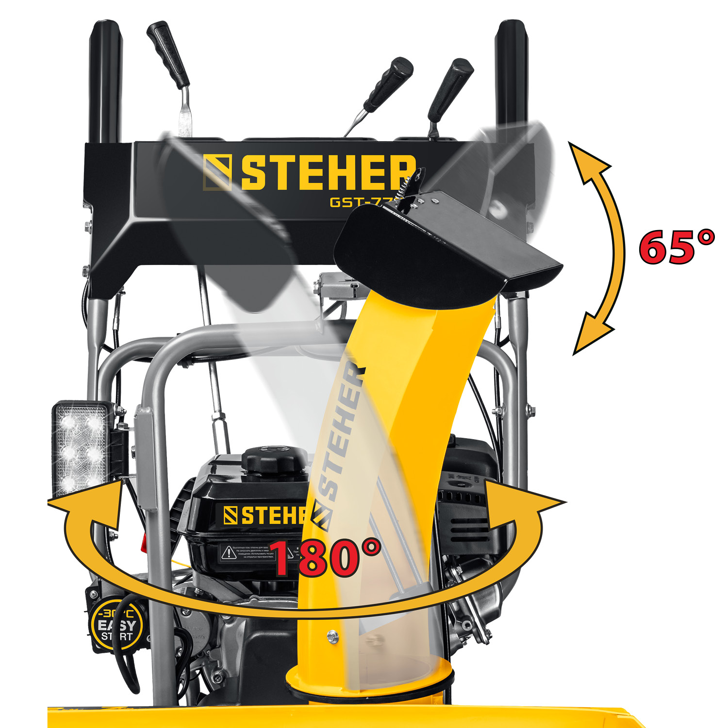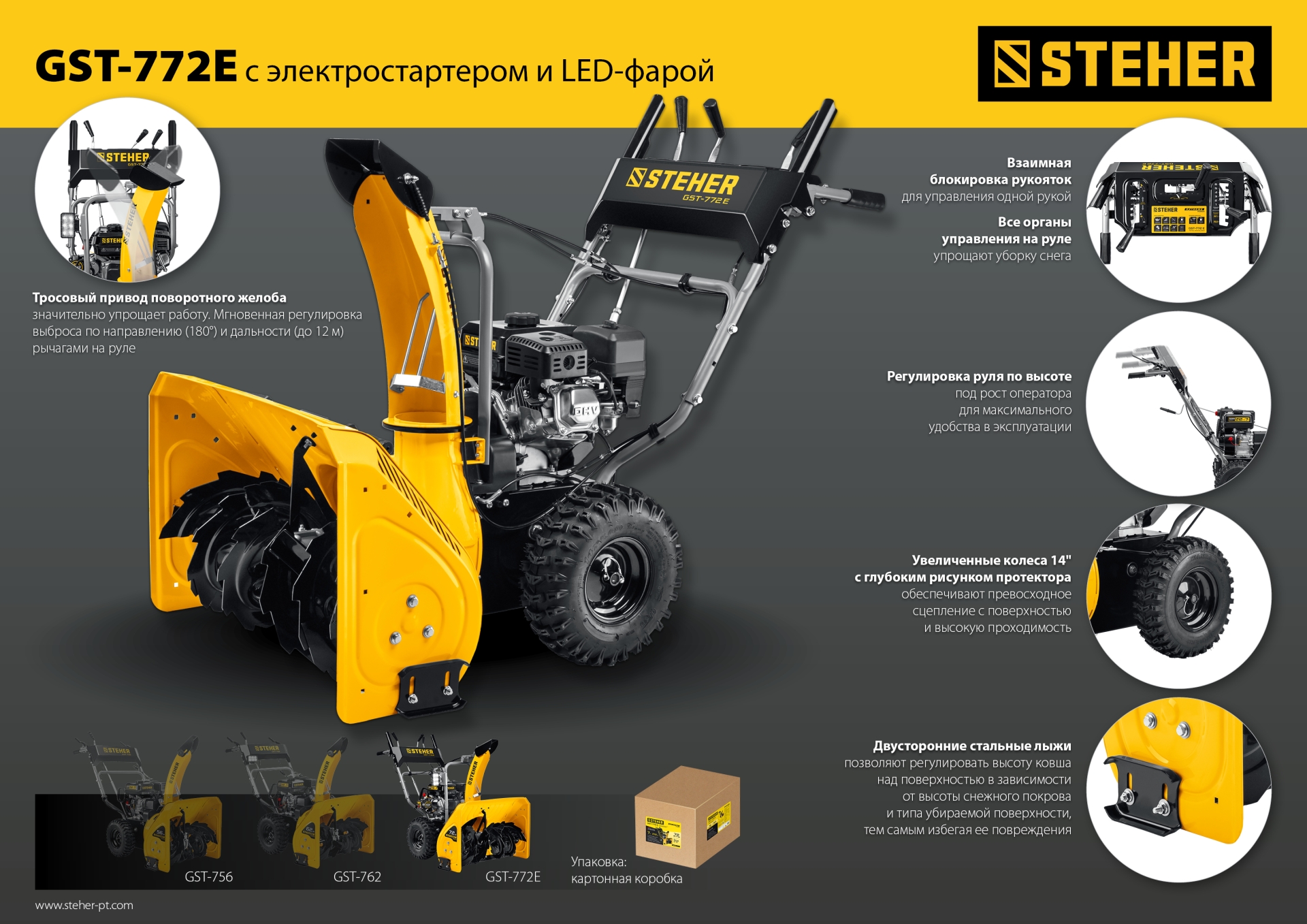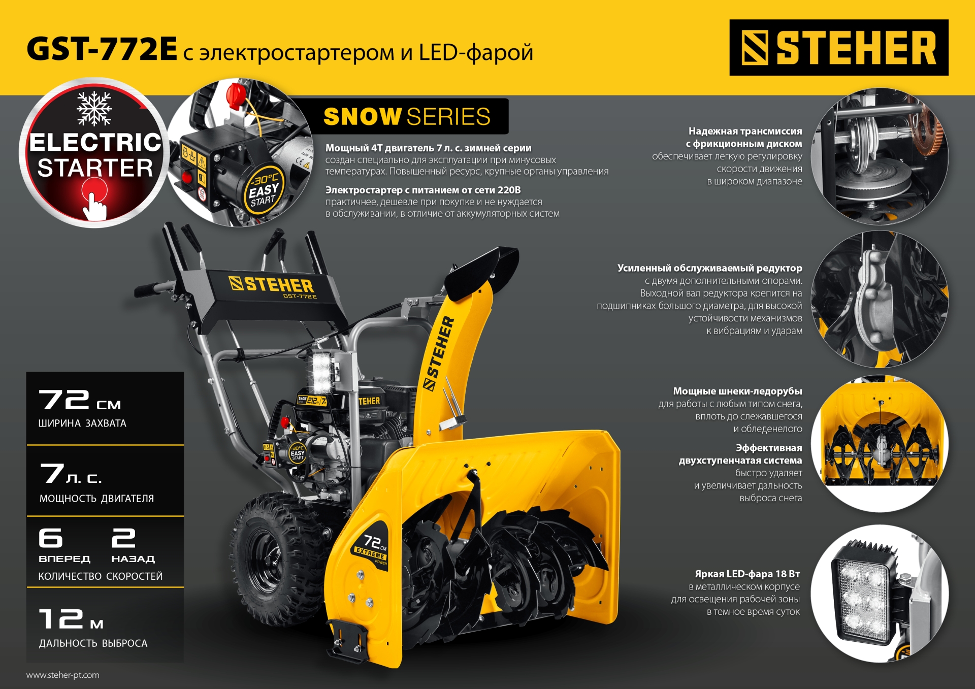 Высокопроизводительный, надежный снегоуборщик STEHER для очистки больших территорий от снега. Оборудован зимним четырехтактным двигателем SNOW series созданным для эксплуатации в суровых зимних условиях.