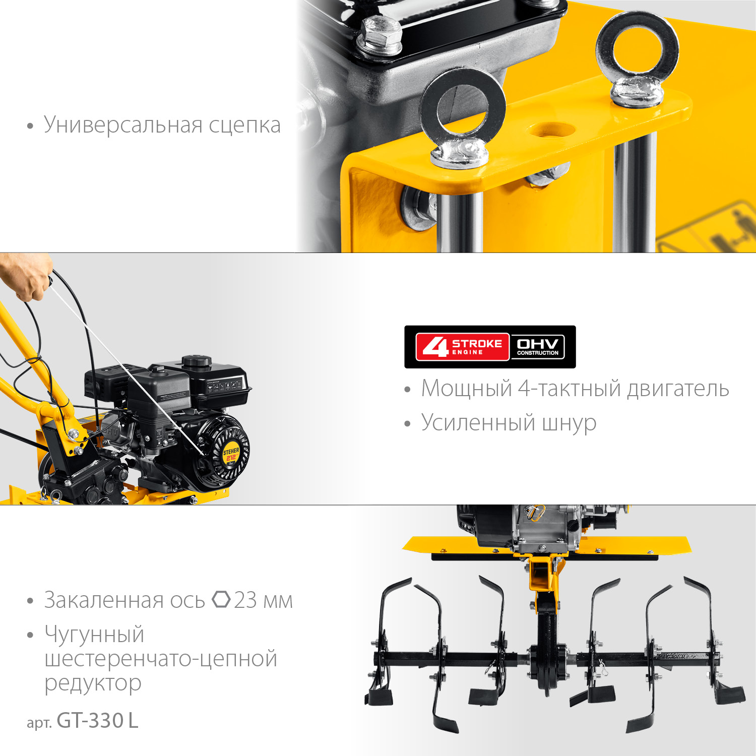 - Универсальная сцепка позволяет использовать различное навесное оборудование