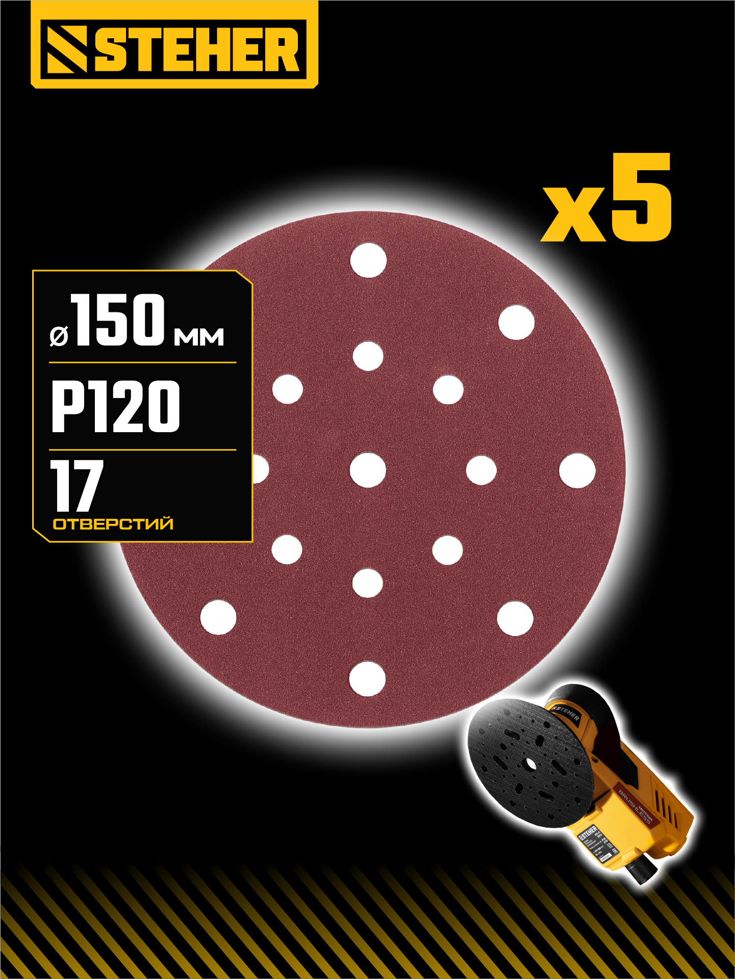 STEHER BOS-150-S 150 мм, Р120, шлифовальный круг на липучке, 17 отв., 5 шт. (35684-120)
