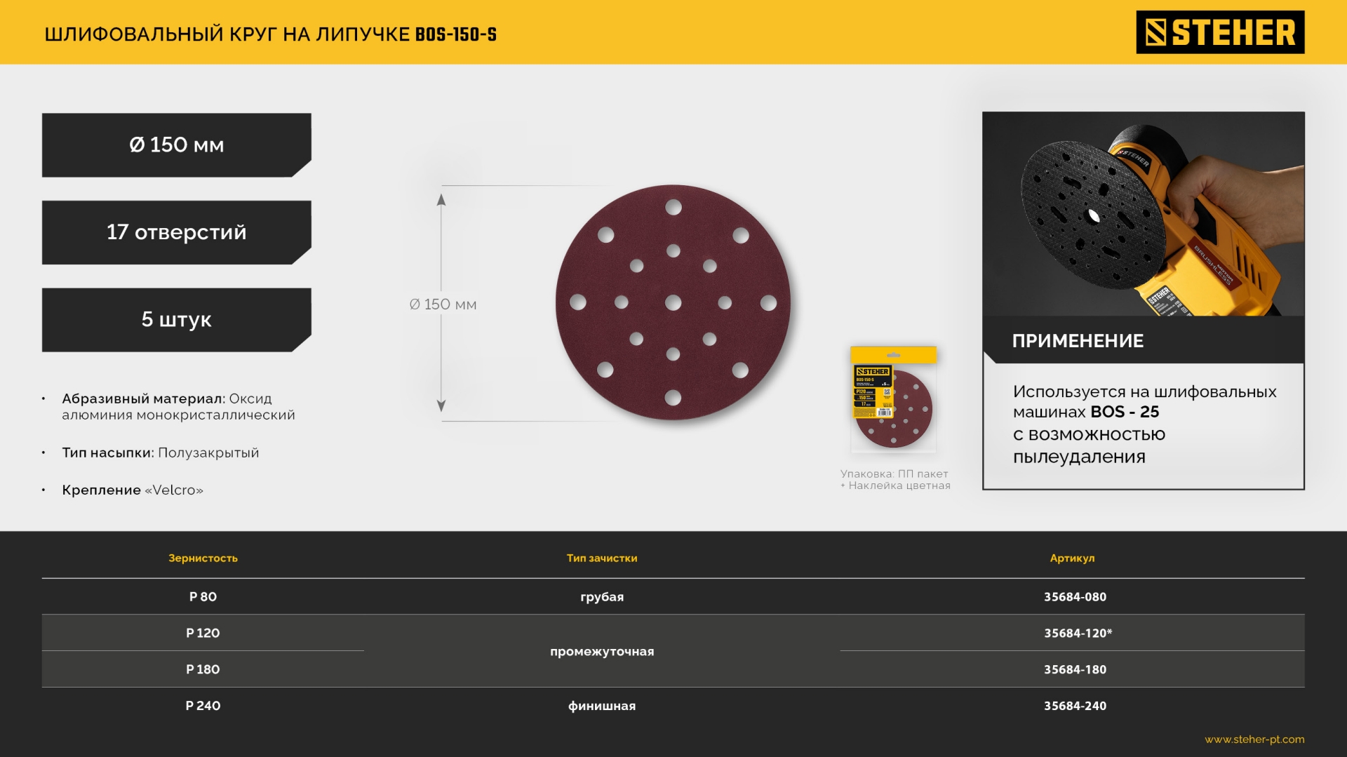 Преимуществами шлифовальных кругов ″DOS-150-S″ является простота и удобство их применения, а также высокая производительность при обработке древесины, грунтовок, шпатлёвок, ЛКП и композитных строительных материалов.