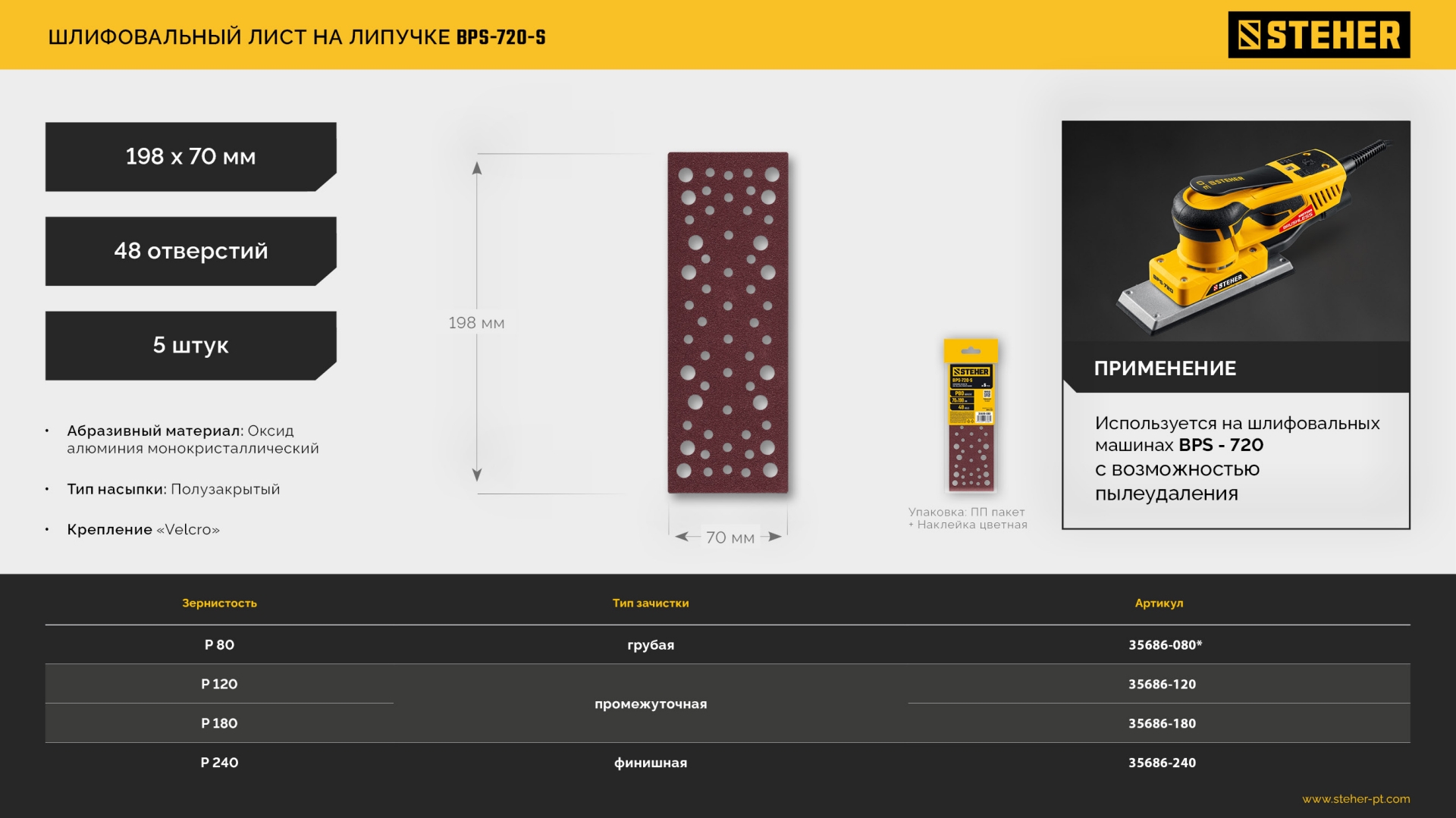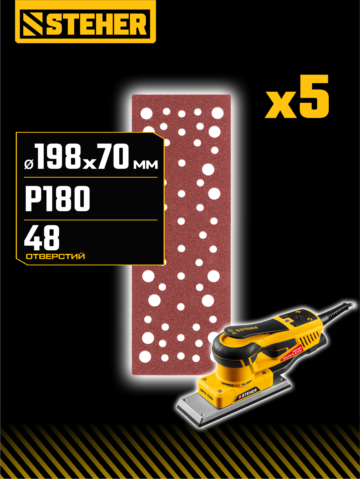 STEHER BPS-720-S 70х198 мм, Р180, шлифовальный лист на липучке, 56 отв., 5 шт. (35686-180)