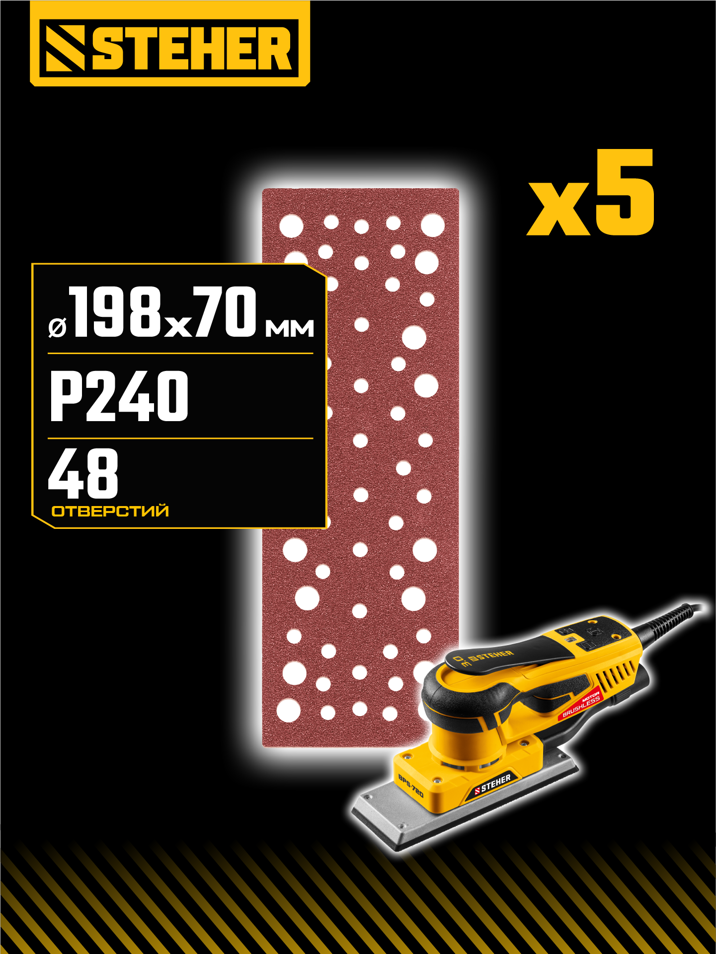 STEHER BPS-720-S 70х198 мм, Р240, шлифовальный лист на липучке, 56 отв., 5 шт. (35686-240)