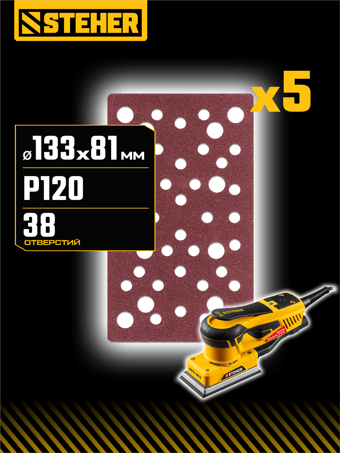 STEHER BPS-813-S 81х133 мм, Р120, шлифовальный лист на липучке, 46 отв., 5 шт. (35687-120)