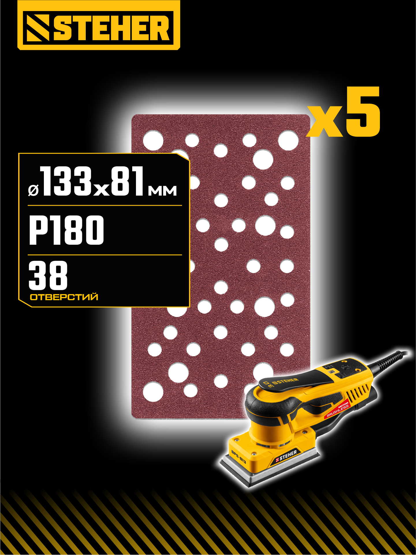 STEHER BPS-813-S 81х133 мм, Р180, шлифовальный лист на липучке, 46 отв., 5 шт. (35687-180)