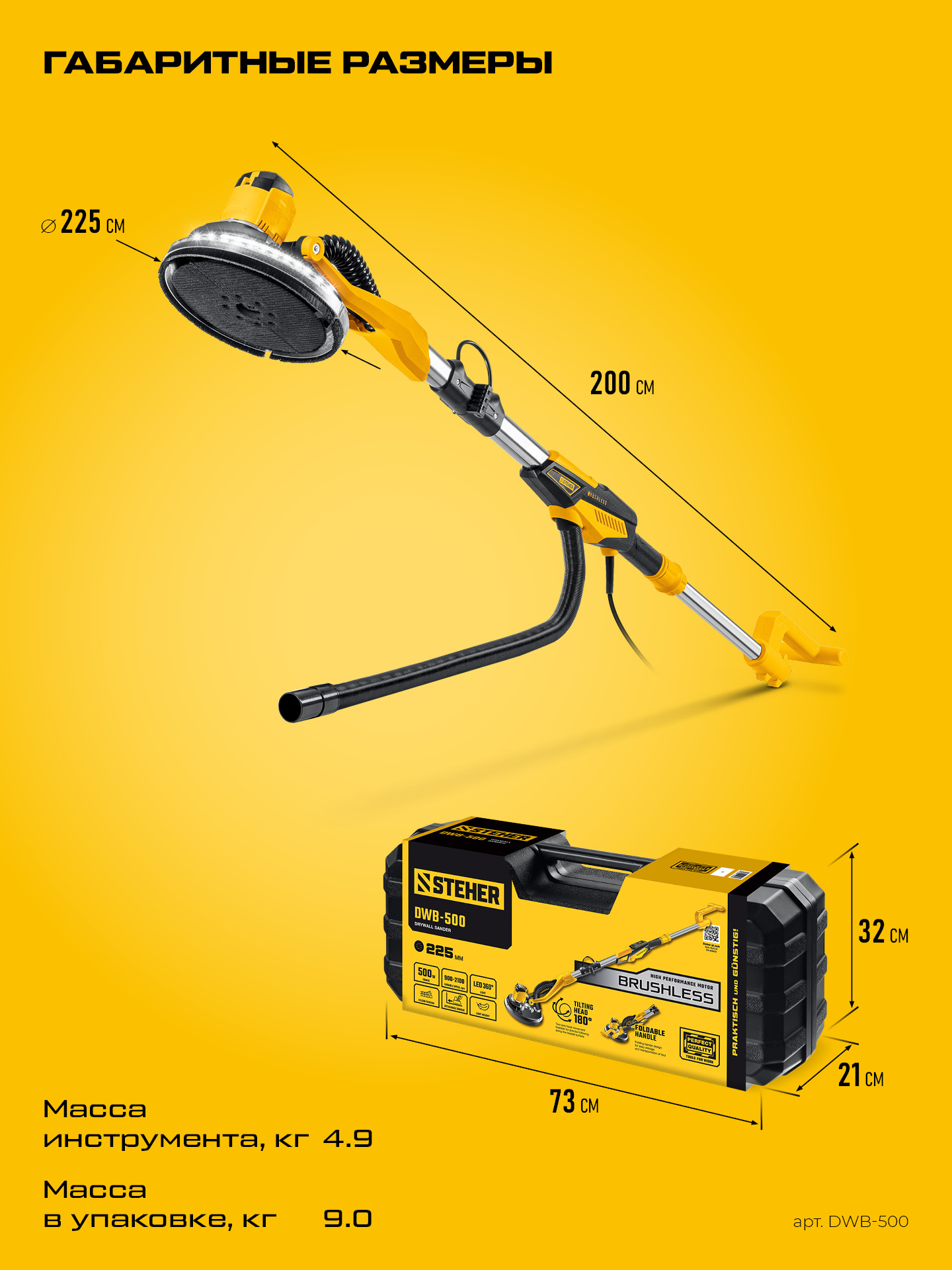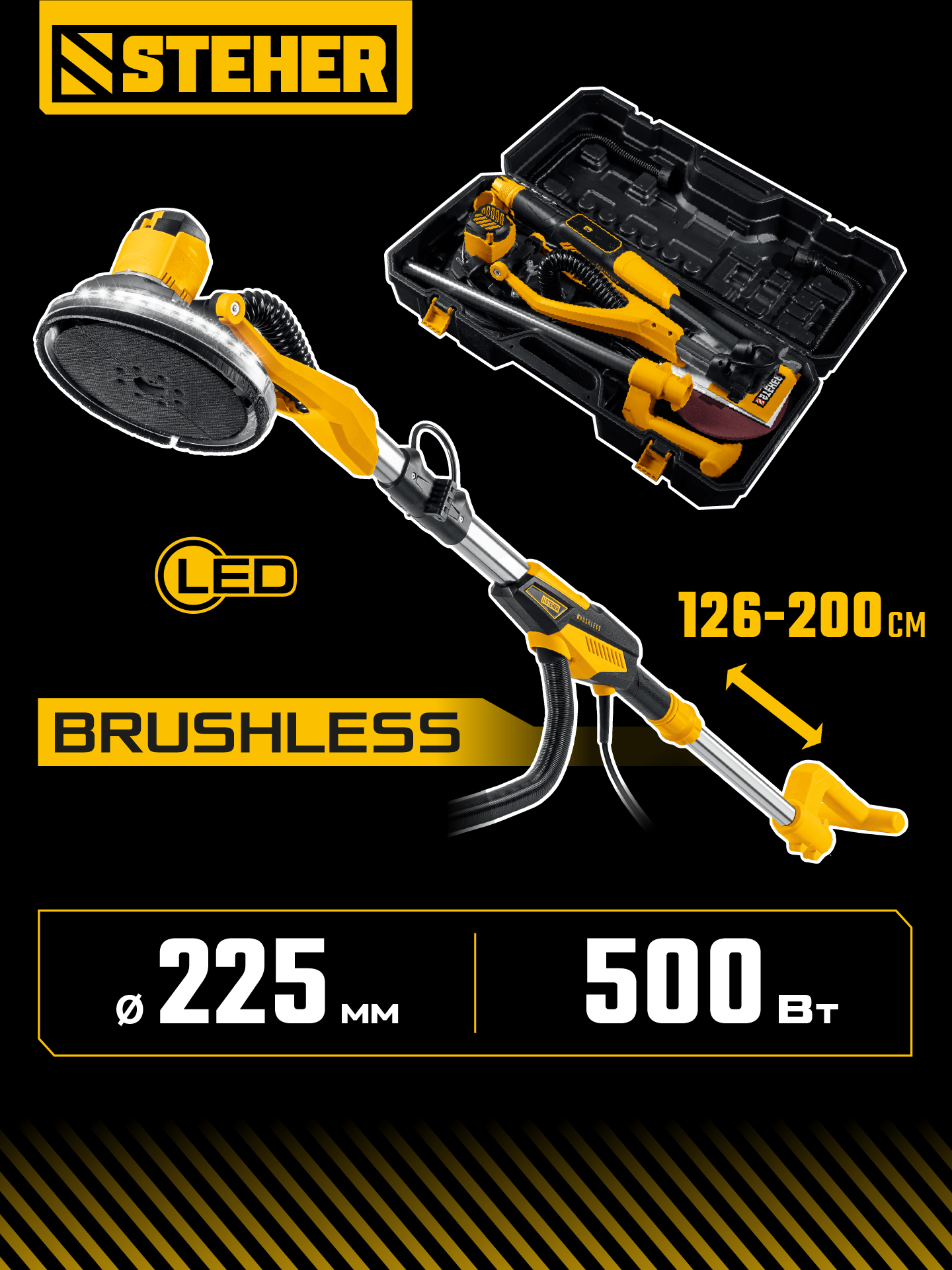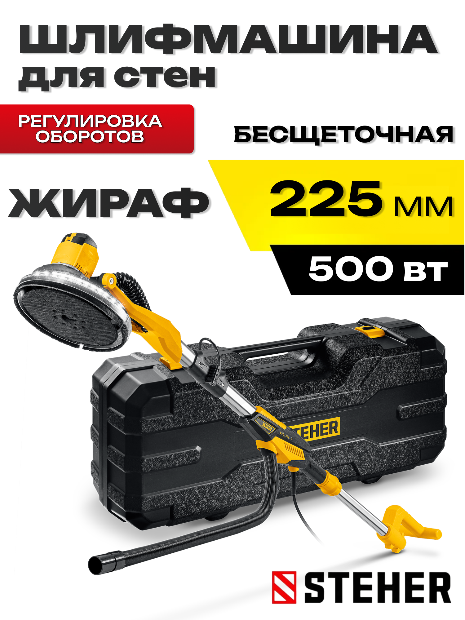 Машина шлифовальная для стен (жираф) с бесщеточным BRUSHLESS двигателем - незаменимый инструмент для обработки как горизонтальных, так и вертикальных поверхностей при подготовке к окраске или поклейке обоев. Облегченная конструкция и высокая надежность благодаря малогабаритному и высокотехнологичному двигателю, не требующему обслуживания
