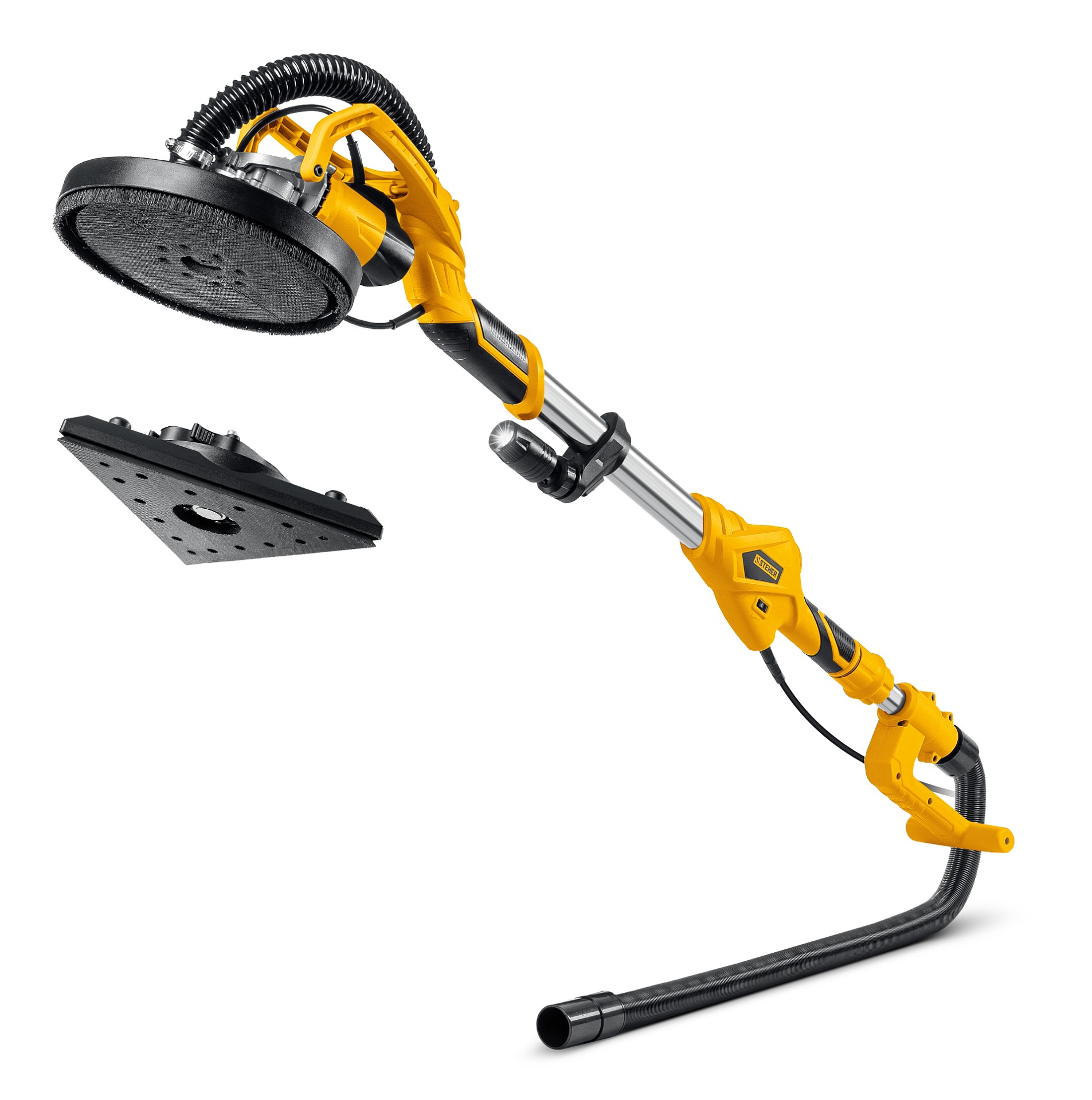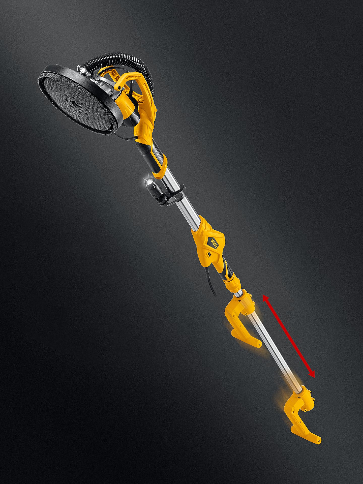 Машина шлифовальная для стен (жираф) - незаменимый инструмент для обработки как горизонтальных, так и вертикальных поверхностей. Благодаря сменному типу насадки (круг или треугольник) можно работать как по площади, так и в углах. Раздвижная рукоятка позволяет отрегулировать инструмент под свой рост и дотянуться во все точки без лестницы. Минимальное количество пыли при работе за счет возможности подключения пылесоса