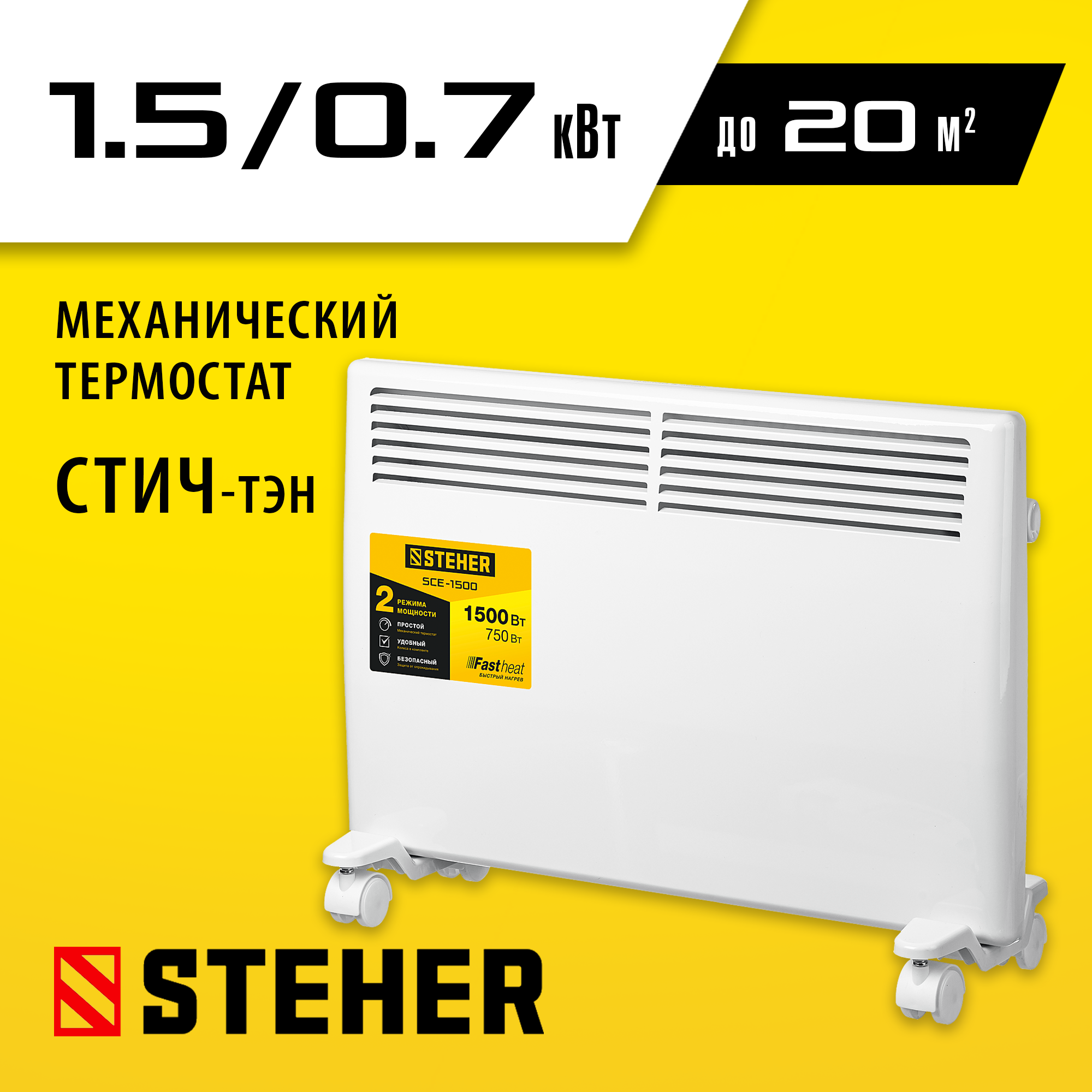 Электрический конвектор STEHER мощностью 1500 Вт - подойдет для обогрева любых домашних и офисных помещений площадью до 20 м2.
