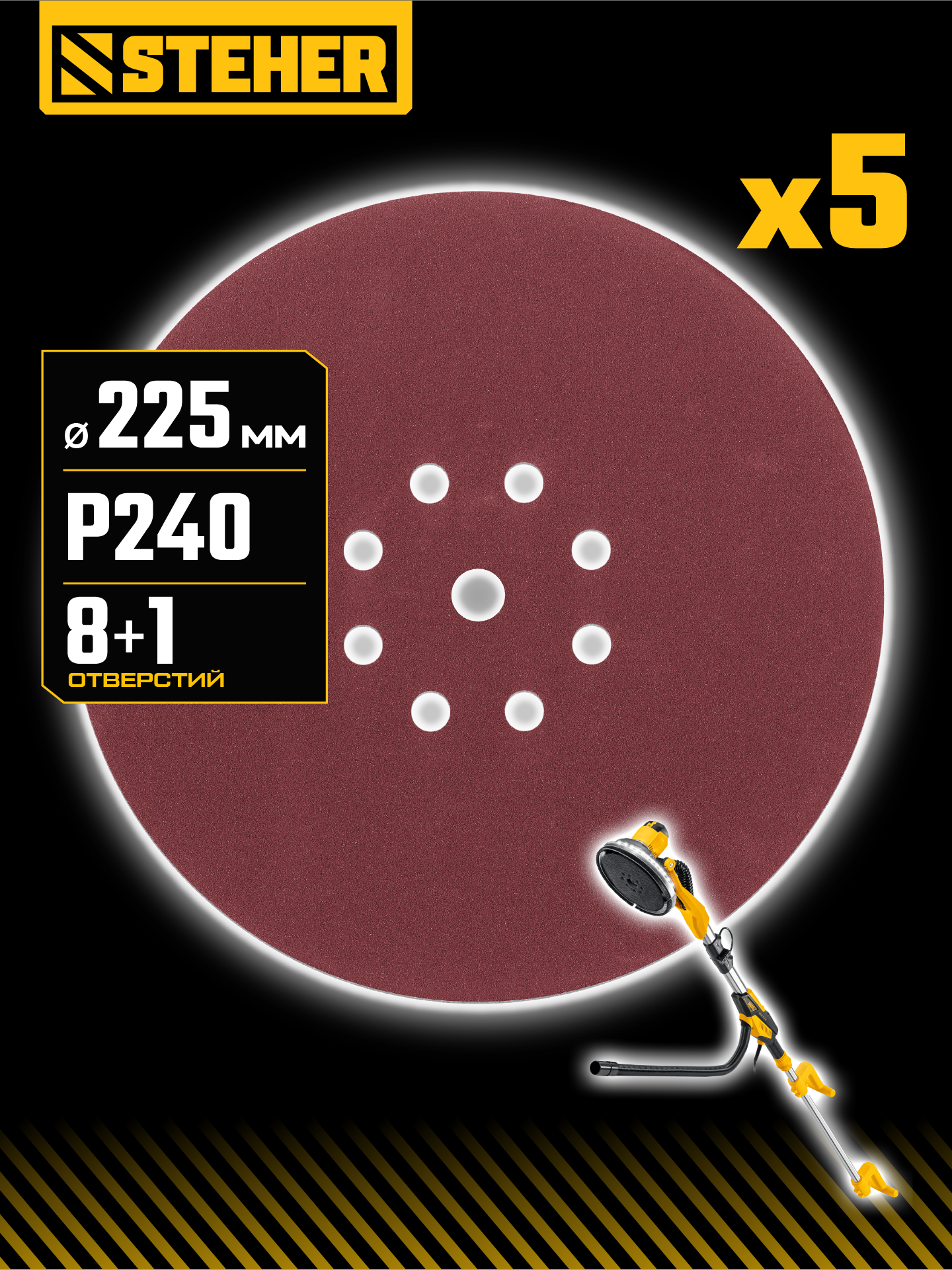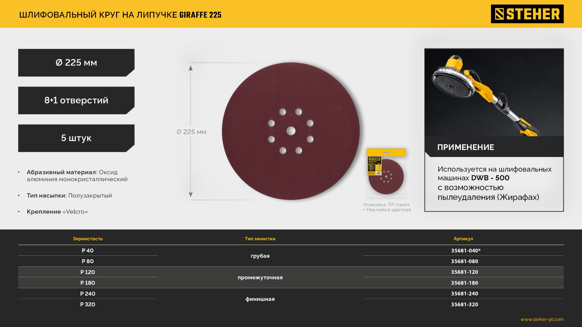 Преимуществами шлифовальных кругов ″GIRAFFE 225″ является простота и удобство их применения, а также высокая производительность при обработке грунтовок, шпатлёвок, ЛКП и композитных строительных материалов.