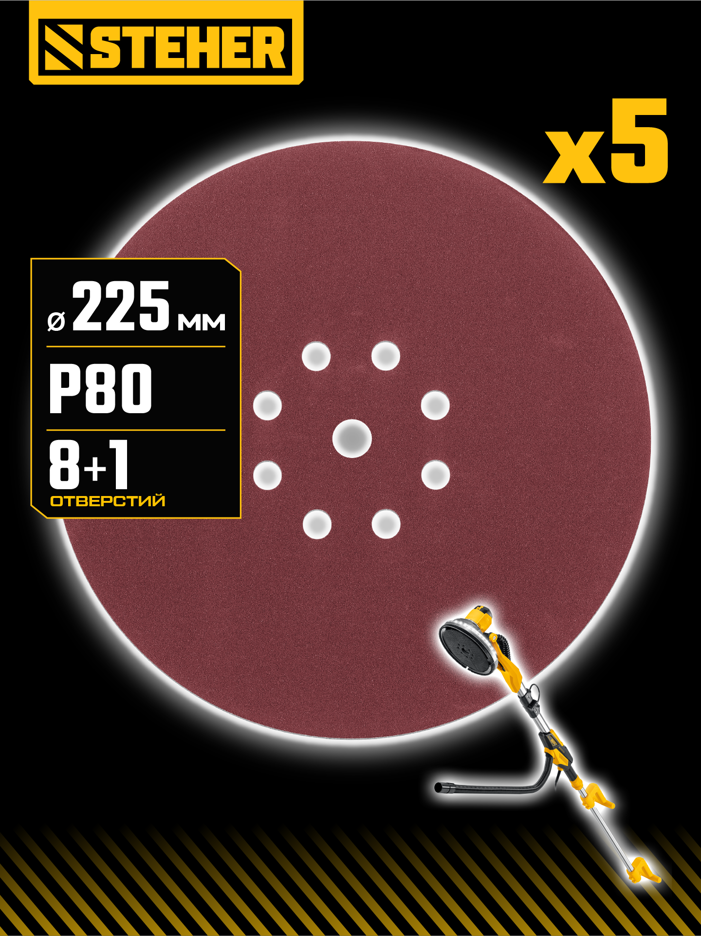STEHER GIRAFFE 225 мм, Р80, шлифовальный круг на липучке, 9 отв., 5 шт. (35681-080)