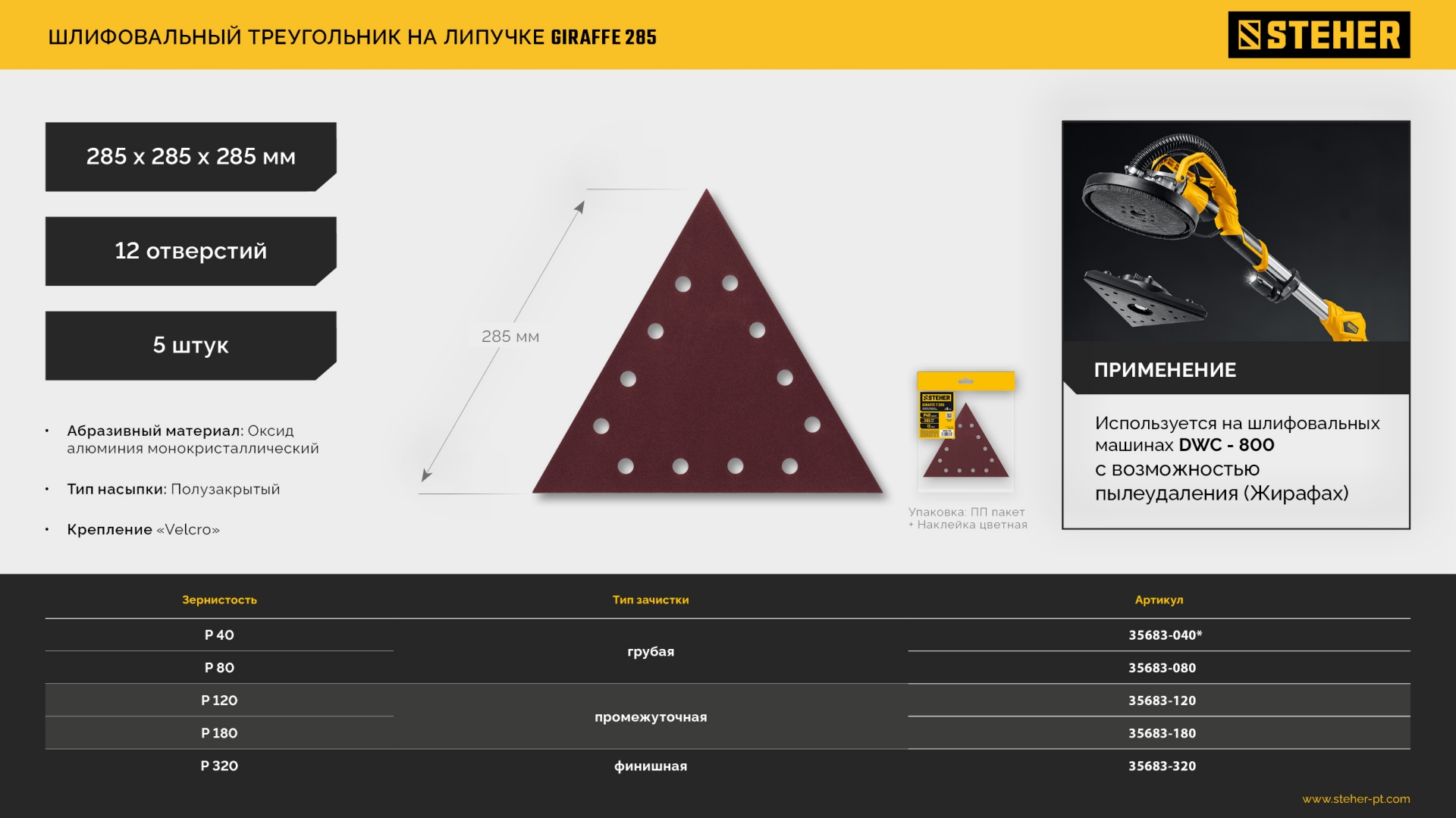 Преимуществами шлифовальных треугольников ″GIRAFFE 285″ является простота и удобство их применения, а также высокая производительность при обработке грунтовок, шпатлёвок, ЛКП и композитных строительных материалов.