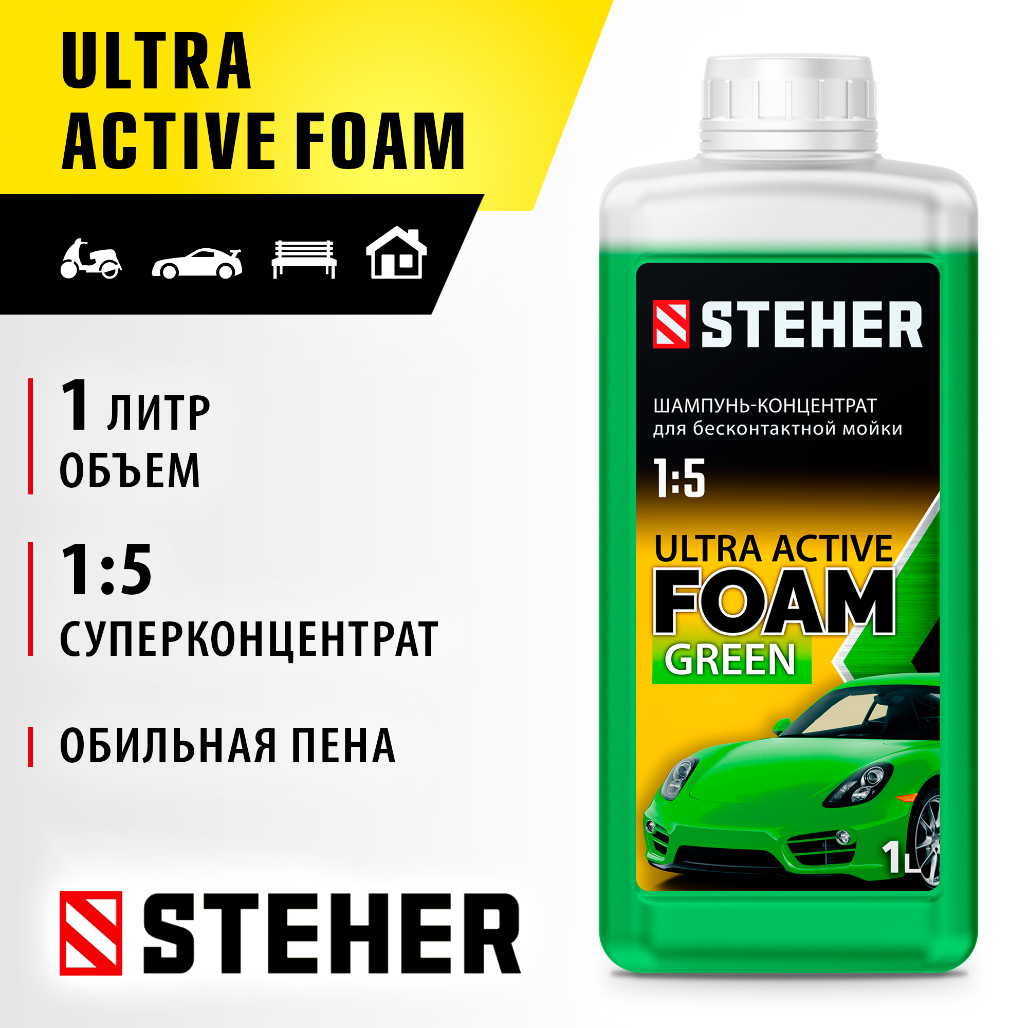Концентрированный шампунь для мойки ULTRA FOAM с повышенным пенообразованием и возможностью нанесения на кузов автомобиля с помощью пенокомплекта. При небольшом расходе шампуня, бразует стойкую обильную пену, которая остается на поверхности длительное время.