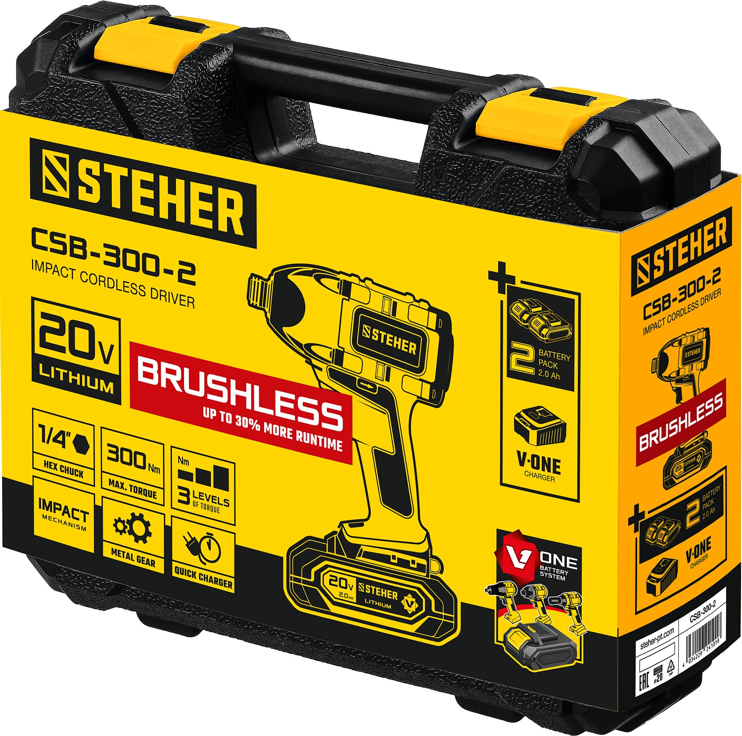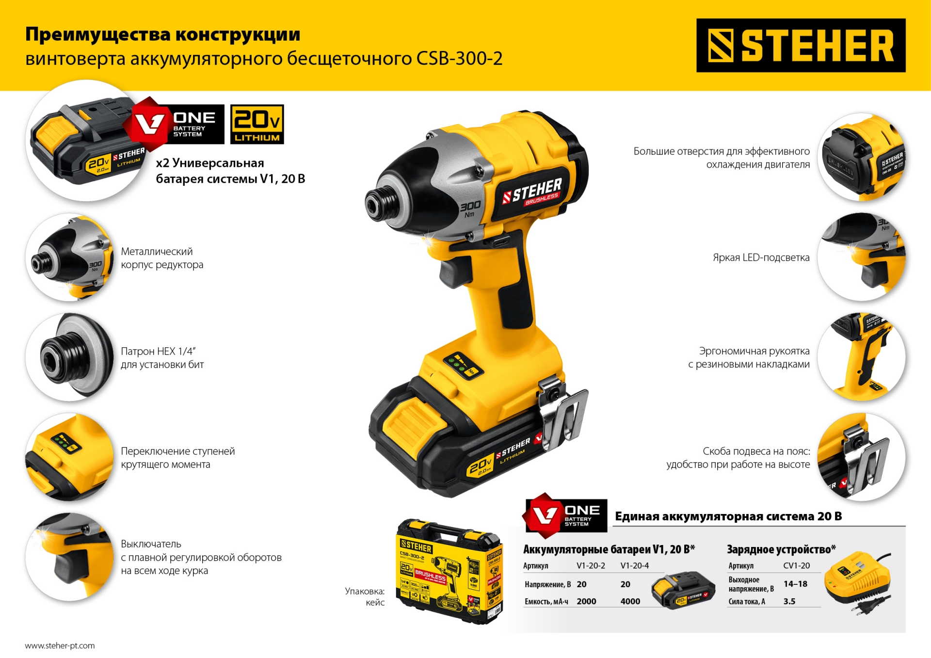 - Два аккумулятора универсальной системы Li-Ion V1 20 В повышенной емкости 2.0 А*ч позволяют инструменту работать дольше и эффективнее