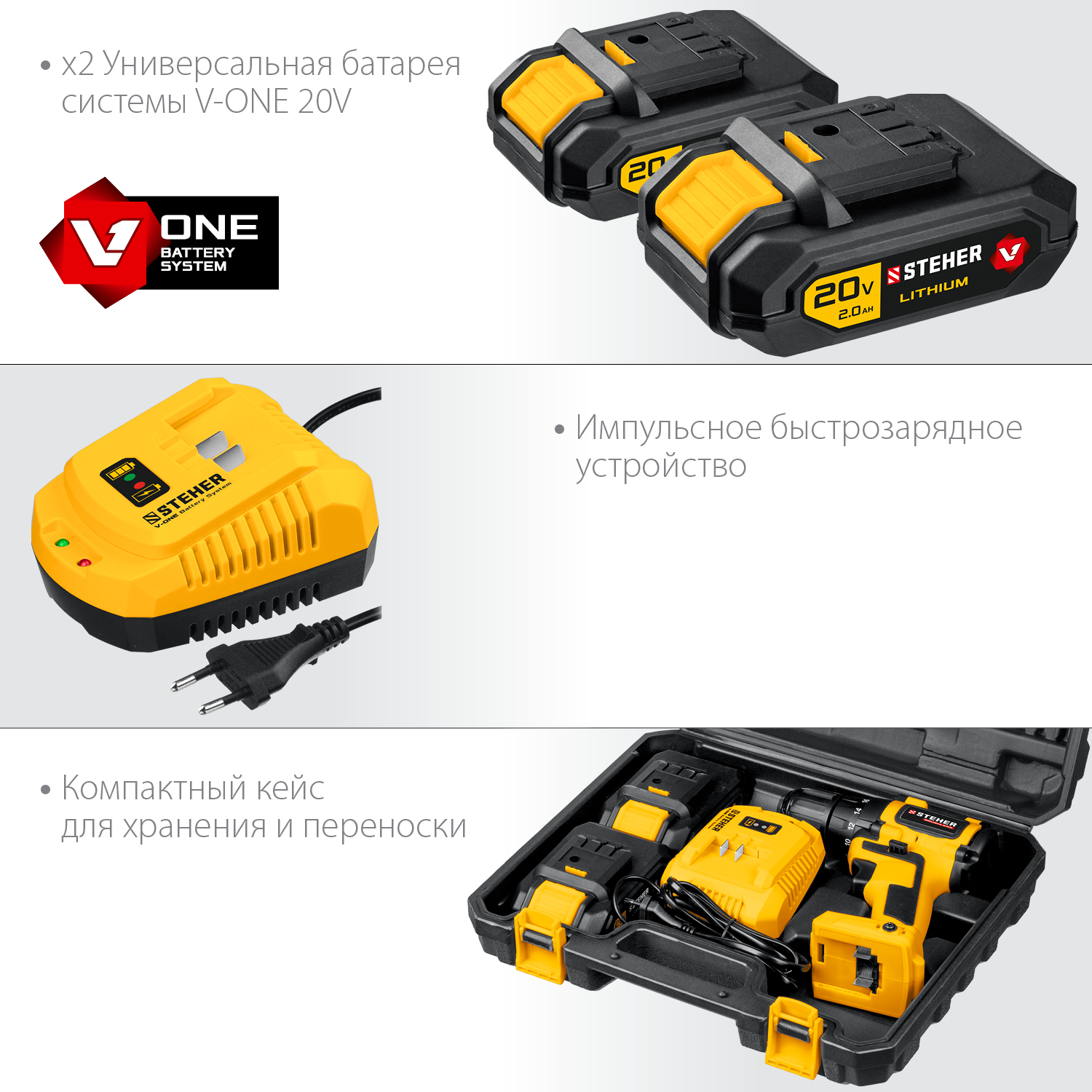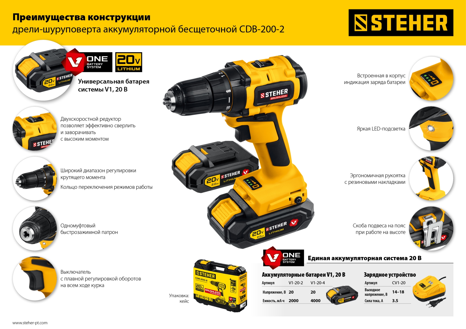 - отсутствие потери мощности в процессе работы - Два аккумулятора универсальной системы Li-Ion V1 20 В повышенной емкости 2.0 А*ч позволяют инструменту работать дольше и эффективнее