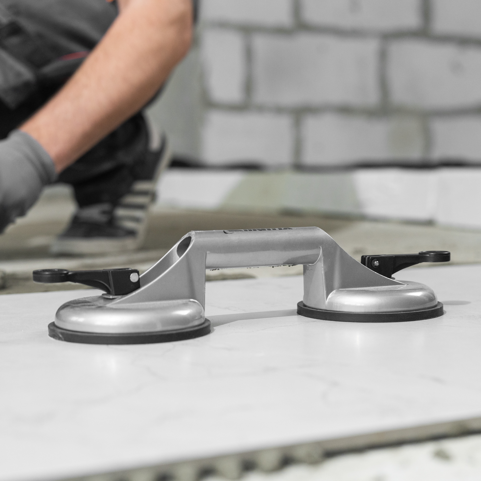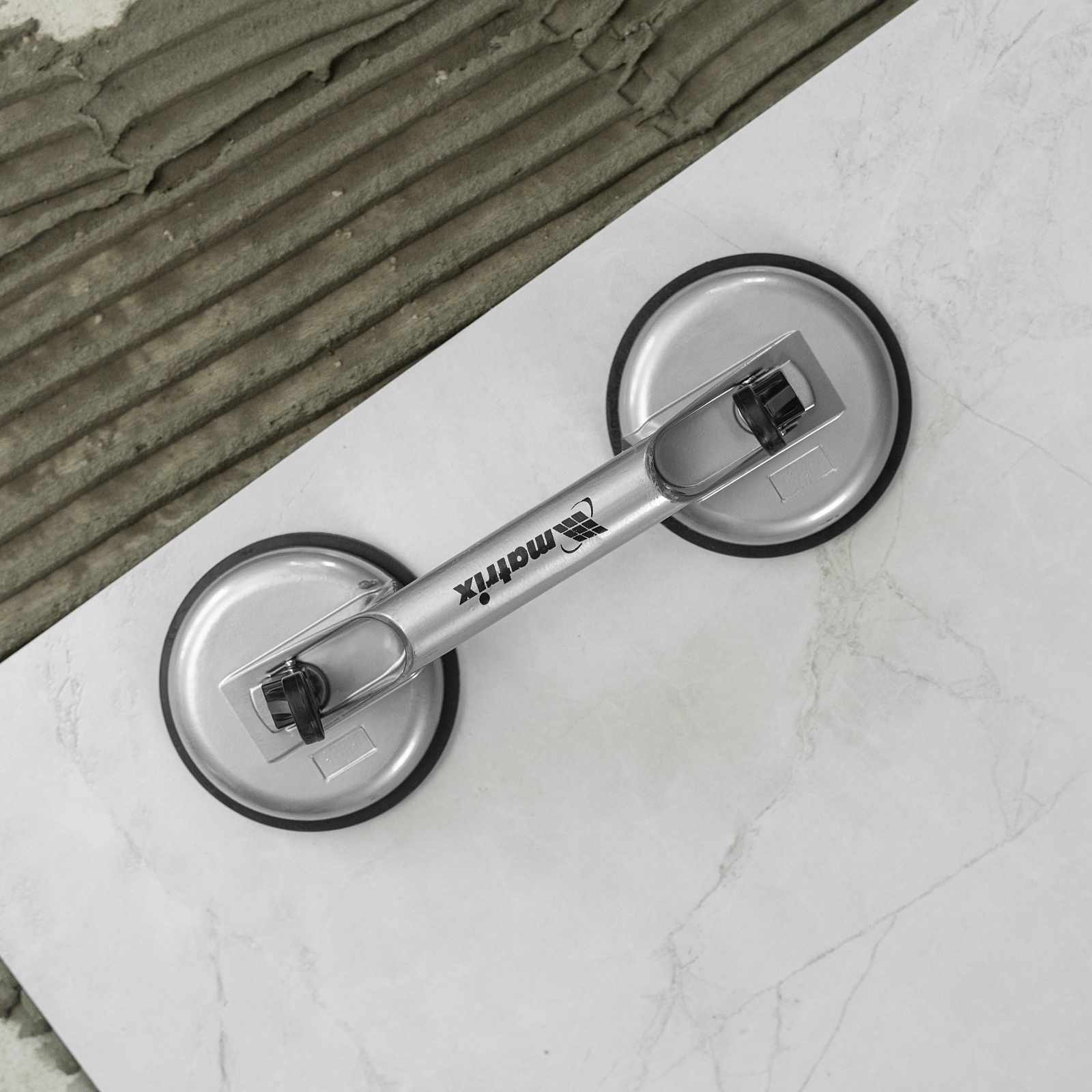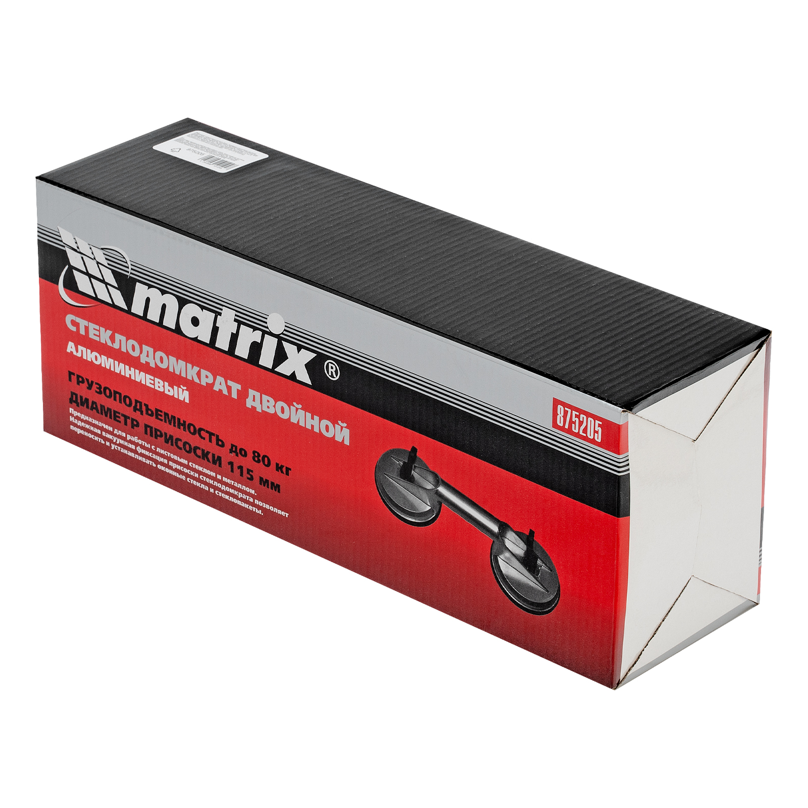 <p>Алюминиевый двойной стеклодомкрат Matrix 875205 позволяет поднимать, переносить и устанавливать стекла, зеркала, плитку, листовой металл и другие гладкие материалы. Имеет две вакуумные присоски, которые бережно и надежно фиксируются на поверхности при помощи зажимов. Стеклодомкрат позволяет длительное время удерживать груз весом до 80 кг. Будет полезен во время строительства, ремонта, а также пригодится в быту.</p><h2>Преимущества</h2><ul><li>Прочность — корпус изготовлен из алюминиевого сплава.</li><li>Долговечность — стеклодомкрат устойчив к коррозии.</li><li>Эргономичность — удобная рукоятка помогает удерживать груз.</li></ul>