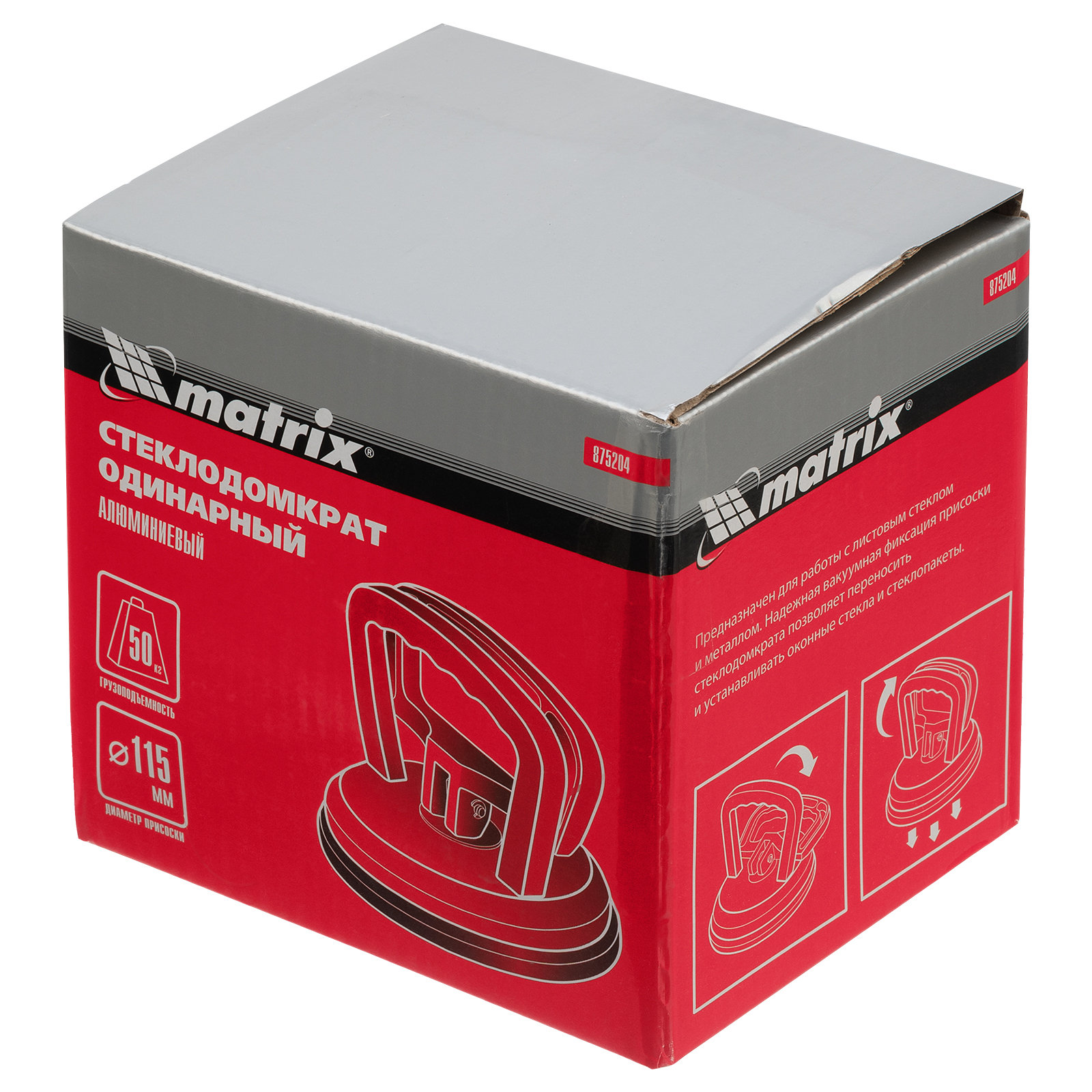 <p>Алюминиевый одинарный стеклодомкрат Matrix 875204 позволяет поднимать, переносить и устанавливать стекла, зеркала, плитку, листовой металл и другие гладкие материалы. Двойная рукоятка складывается и надежно фиксирует присоску на поверхности, не повреждая ее. Стеклодомкрат позволяет длительное время удерживать груз весом до 50 кг. Будет полезен во время строительства, ремонта, а также пригодится в быту.</p><h2>Преимущества</h2><ul><li>Прочность — корпус изготовлен из алюминиевого сплава.</li><li>Долговечность — стеклодомкрат устойчив к коррозии.</li><li>Эргономичность — рукоятка с подпальцевыми выемками удобна для перемещения груза.</li></ul>