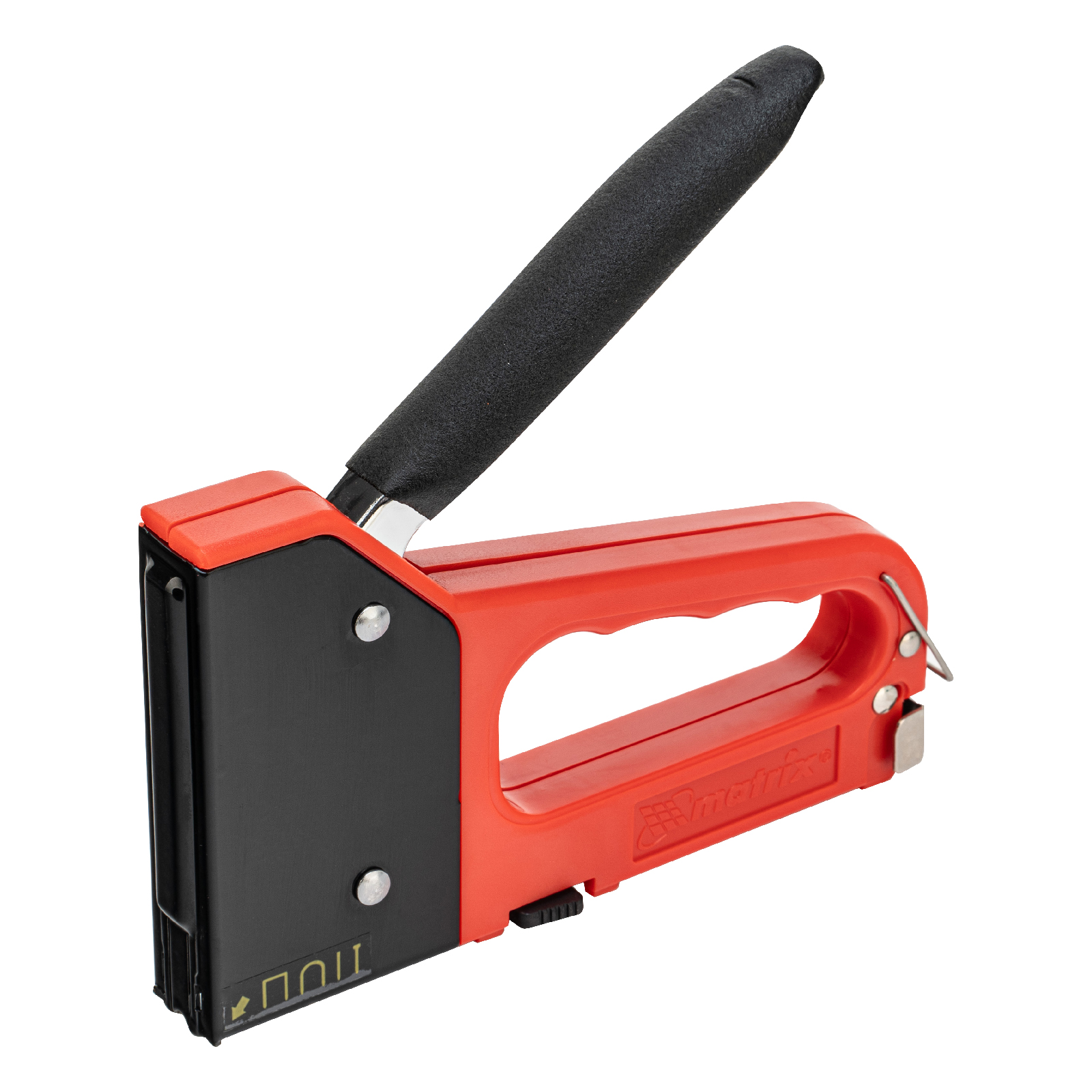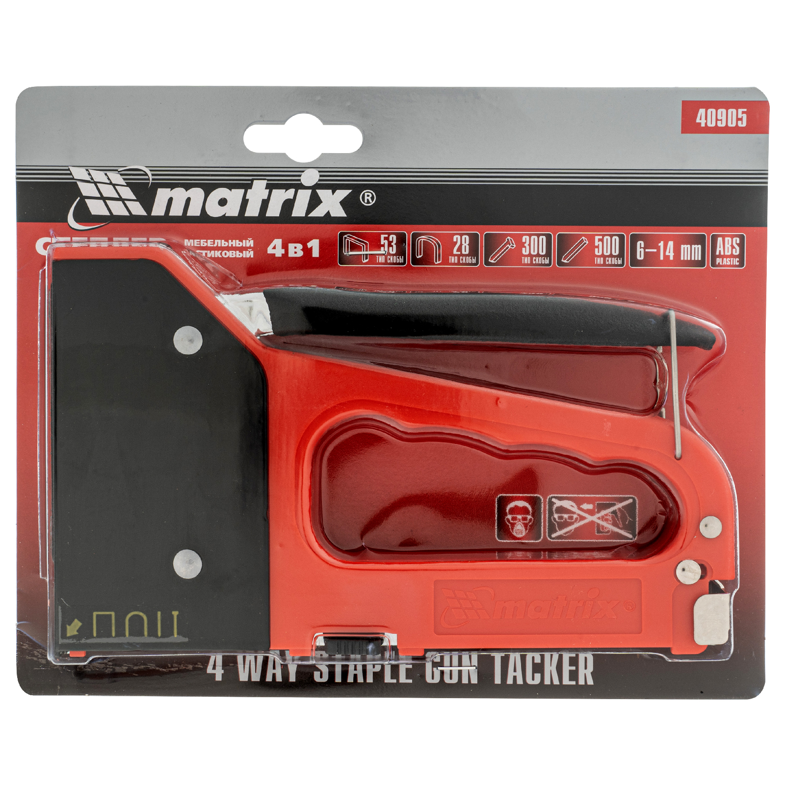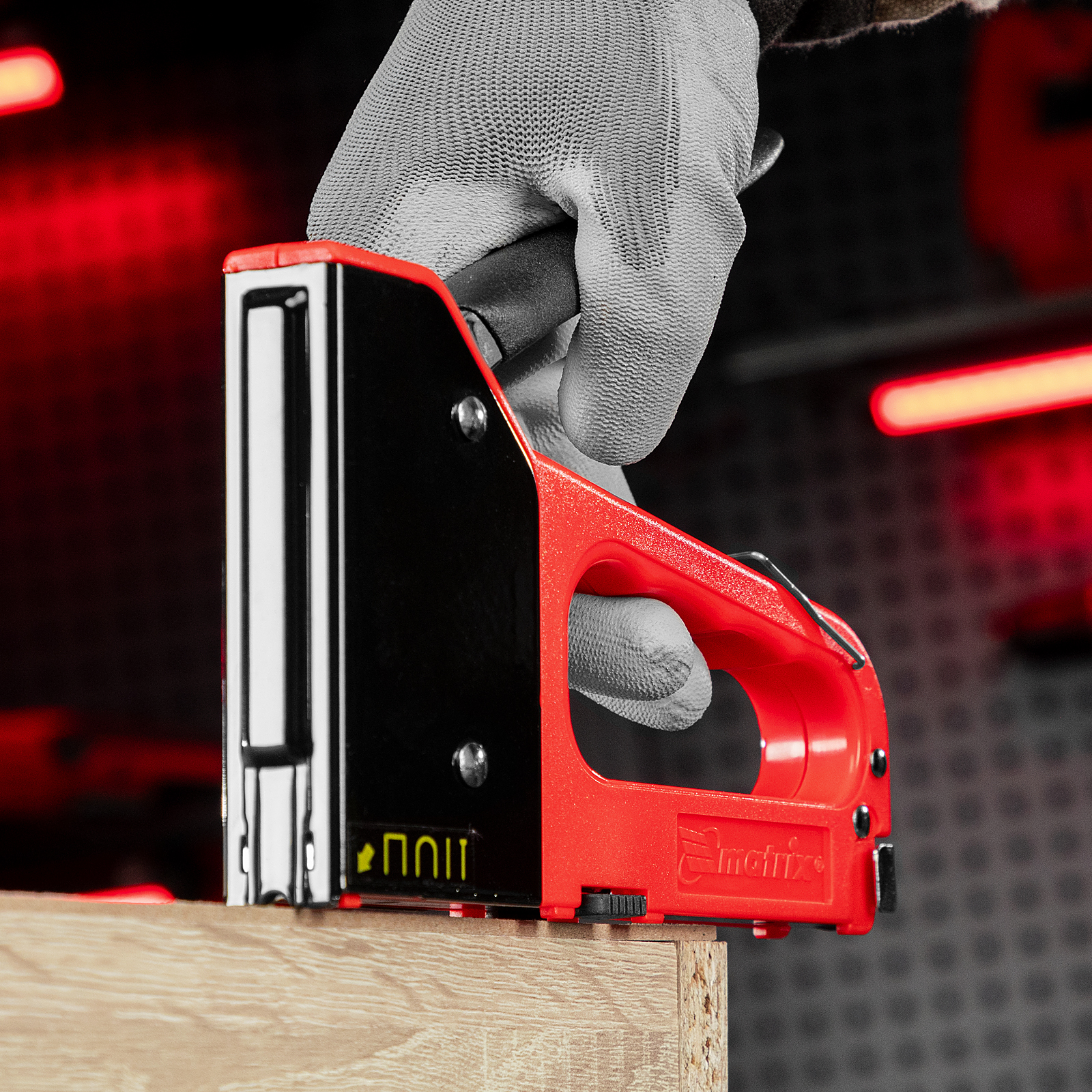Мебельный 4-функциональный степлер Matrix 40905 используется для крепежных работ и совместим со скобами наиболее востребованных типов — 53 размером 6-14 мм, 300 и 500 размером 14 мм, а также полукруглыми скобами 28 типа размером 12 мм. Благодаря этому инструмент универсален и может использоваться для крепления к деревянным основаниям различных материалов — фанеры, ДСП, ДВП, оргалита, пленки или утеплителя. Пригодится для сборки и обивки мебели, укладки напольных покрытий, прокладки низковольтных кабелей, а также для выполнения отделочных и багетных работ.