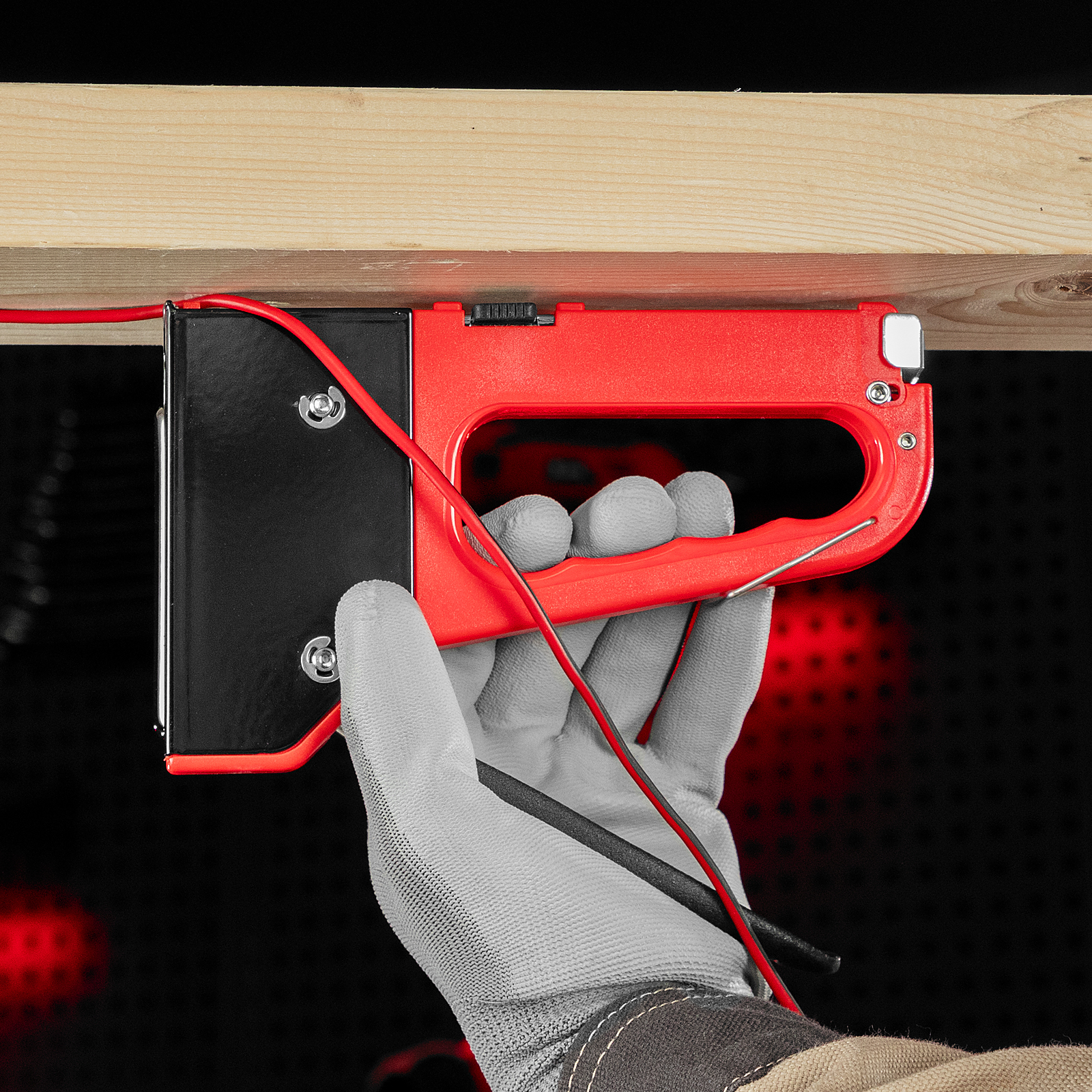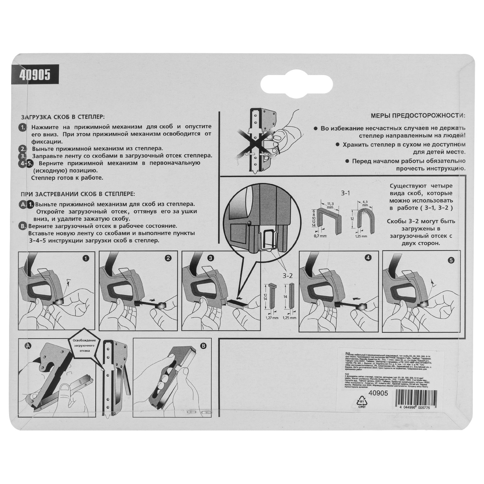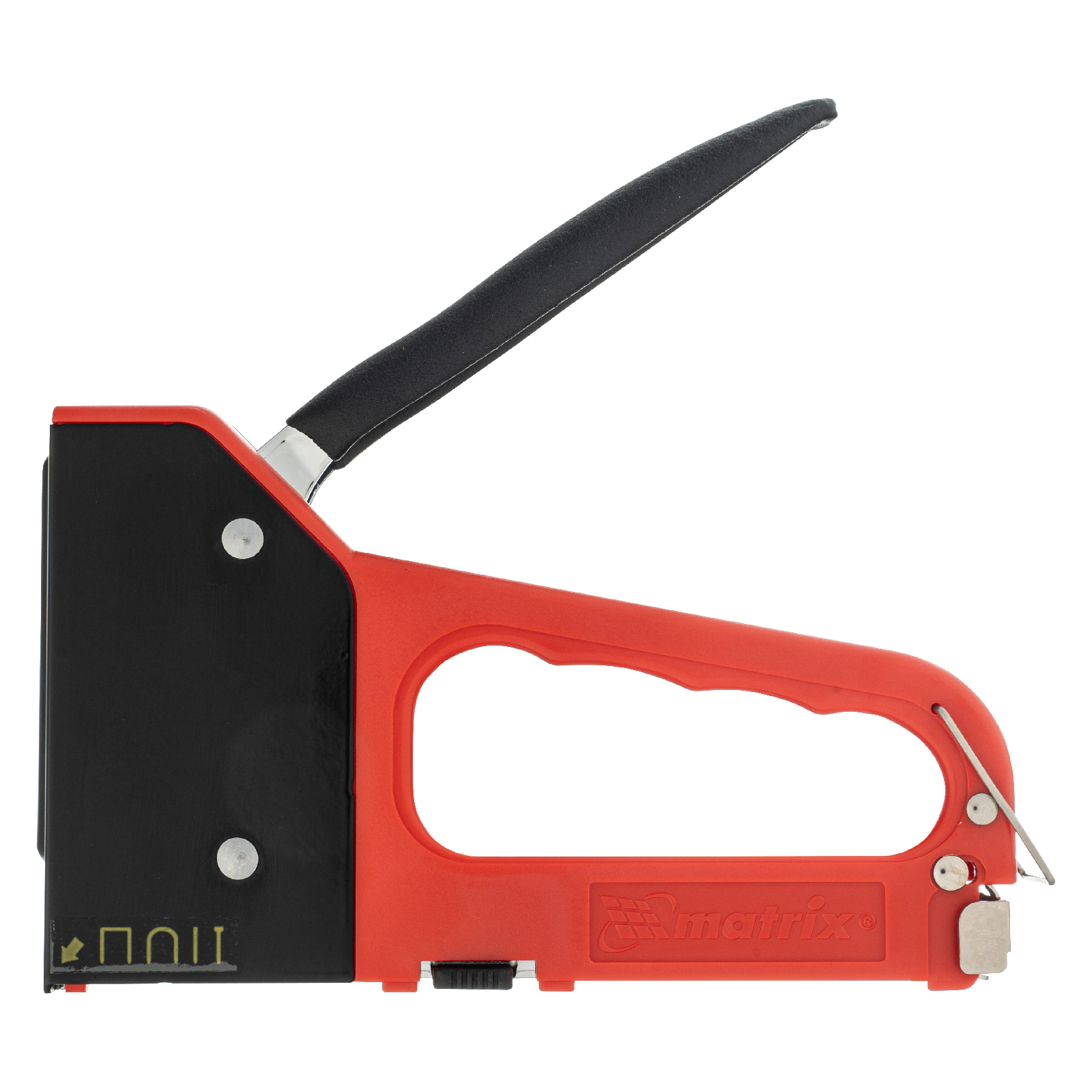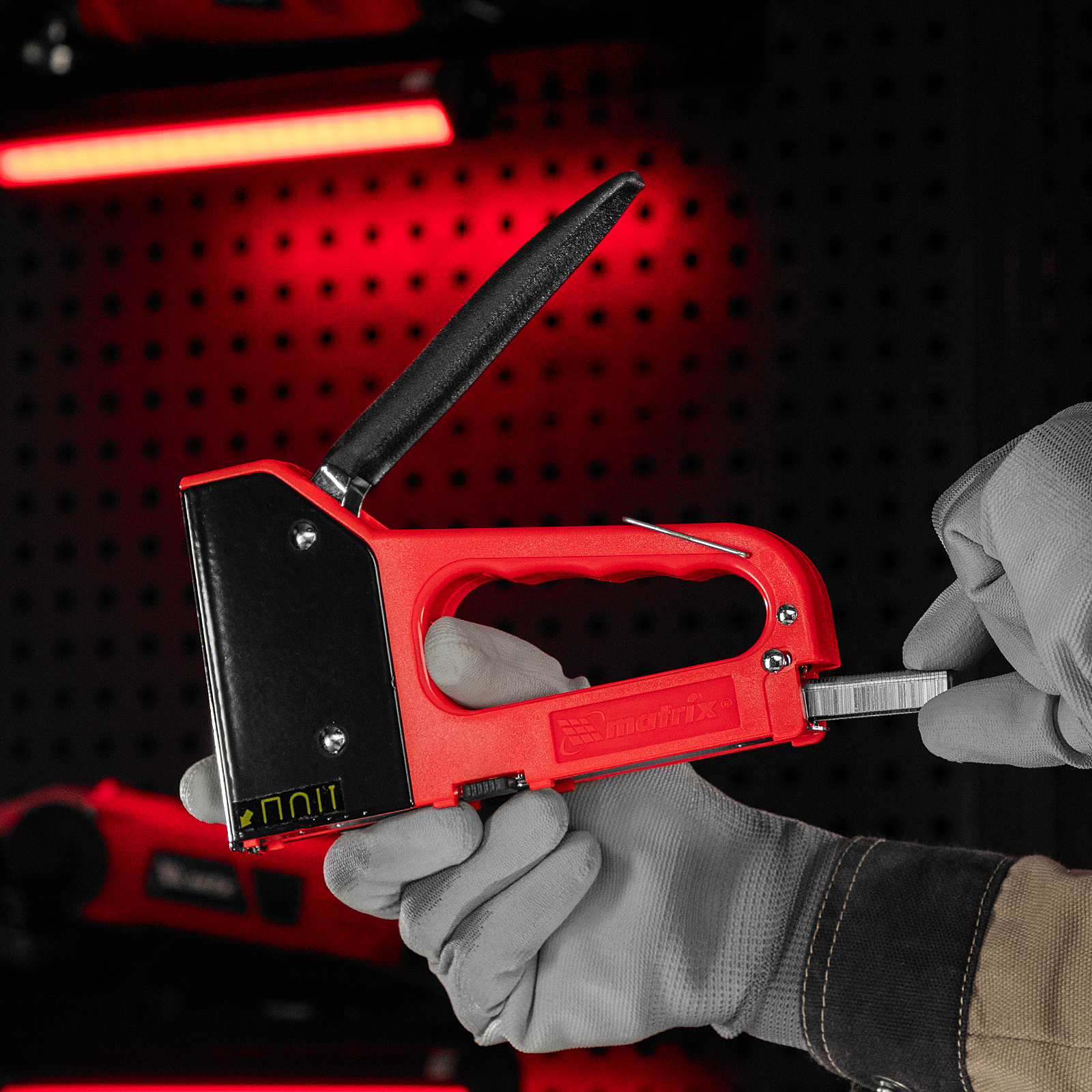 Мебельный 4-функциональный степлер Matrix 40905 используется для крепежных работ и совместим со скобами наиболее востребованных типов — 53 размером 6-14 мм, 300 и 500 размером 14 мм, а также полукруглыми скобами 28 типа размером 12 мм. Благодаря этому инструмент универсален и может использоваться для крепления к деревянным основаниям различных материалов — фанеры, ДСП, ДВП, оргалита, пленки или утеплителя. Пригодится для сборки и обивки мебели, укладки напольных покрытий, прокладки низковольтных кабелей, а также для выполнения отделочных и багетных работ.