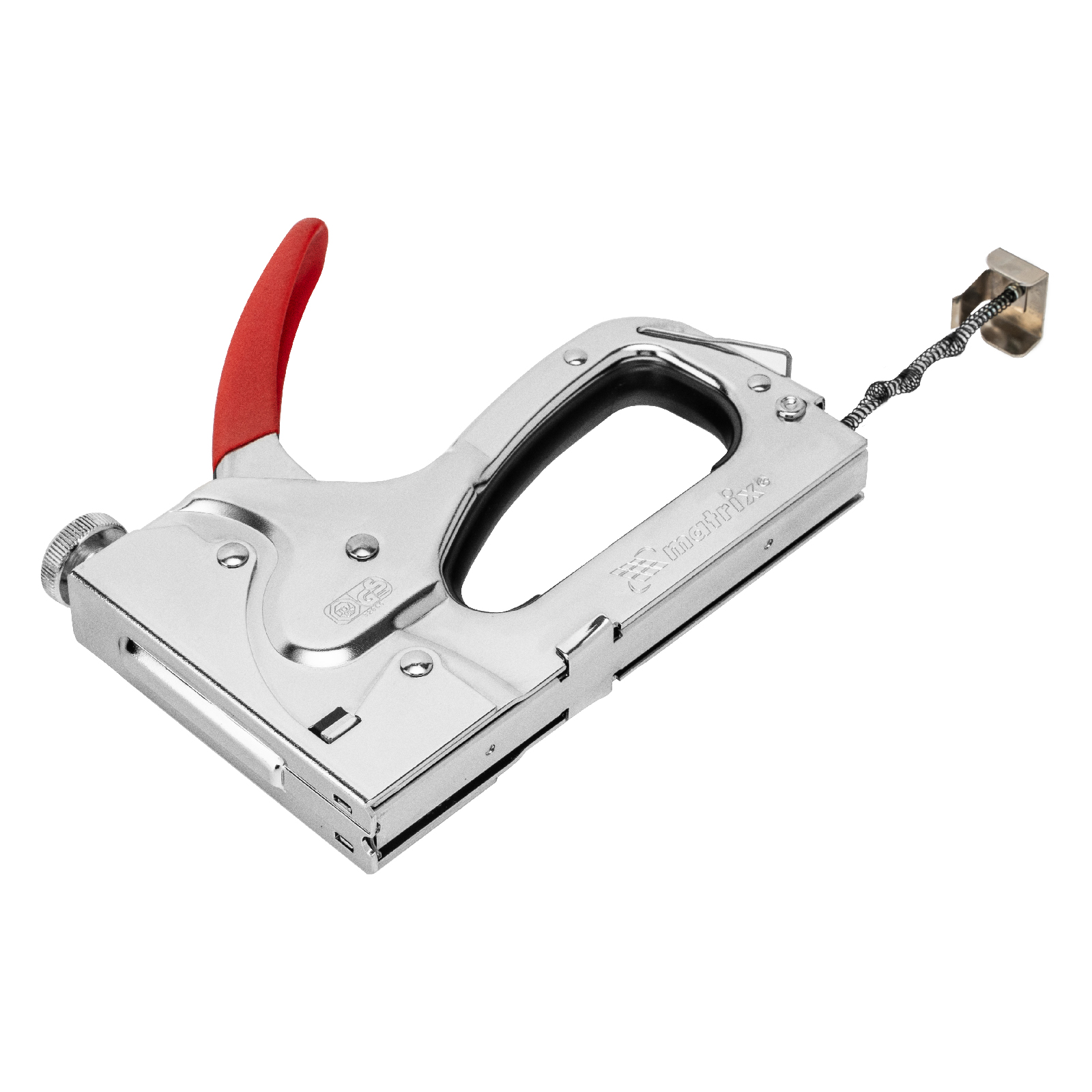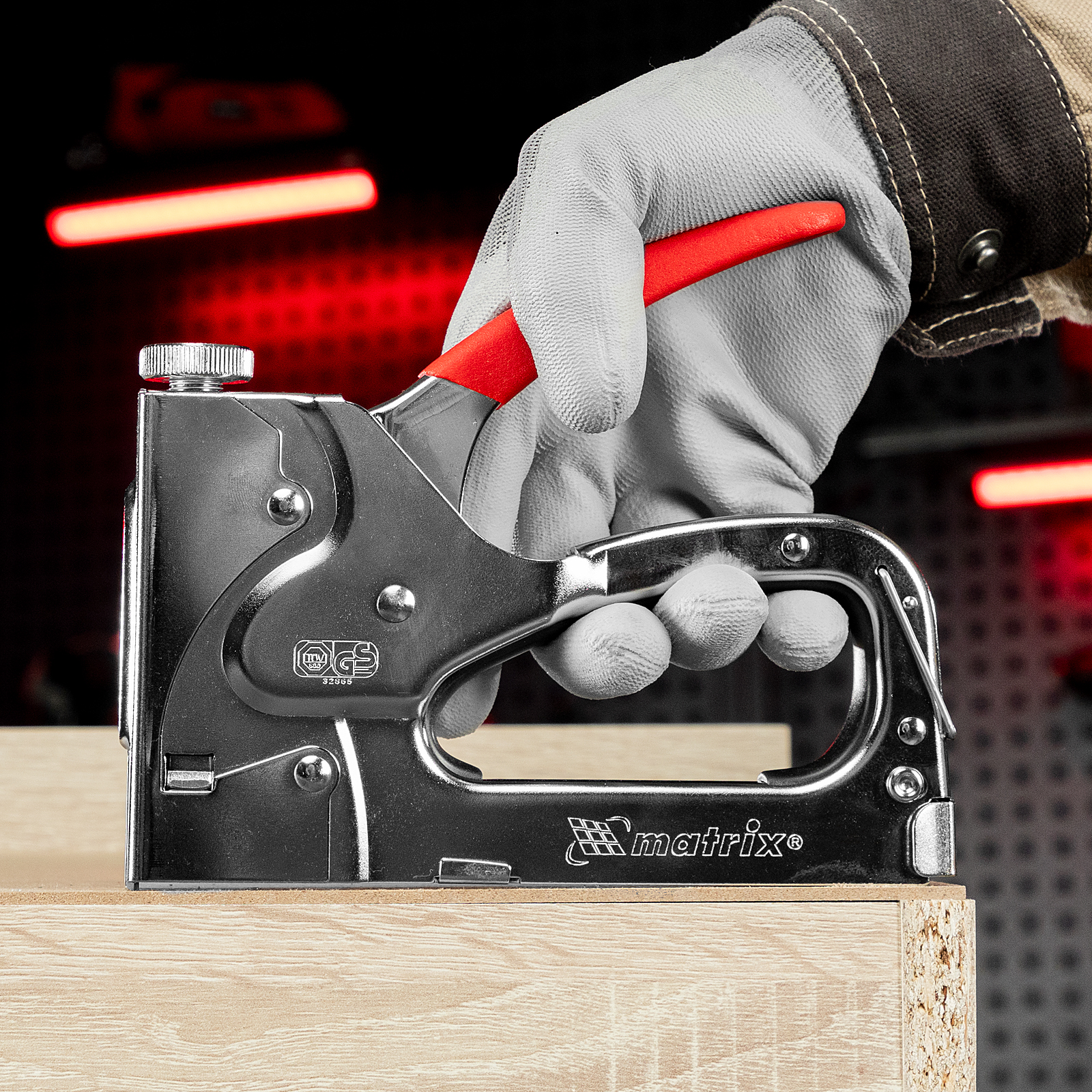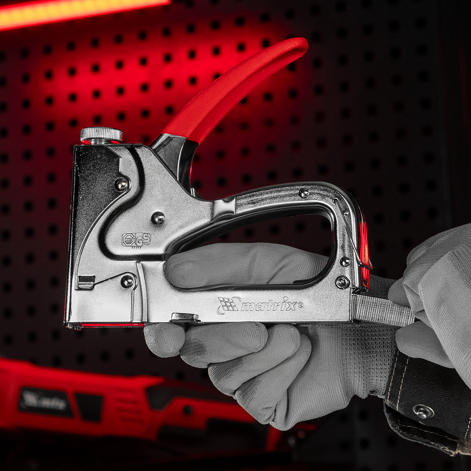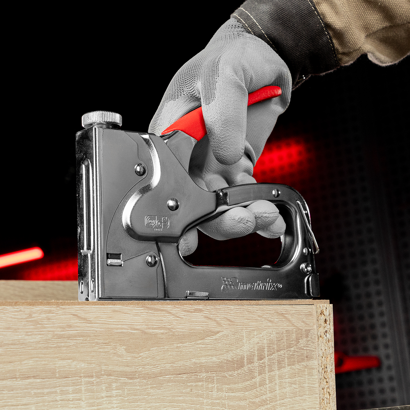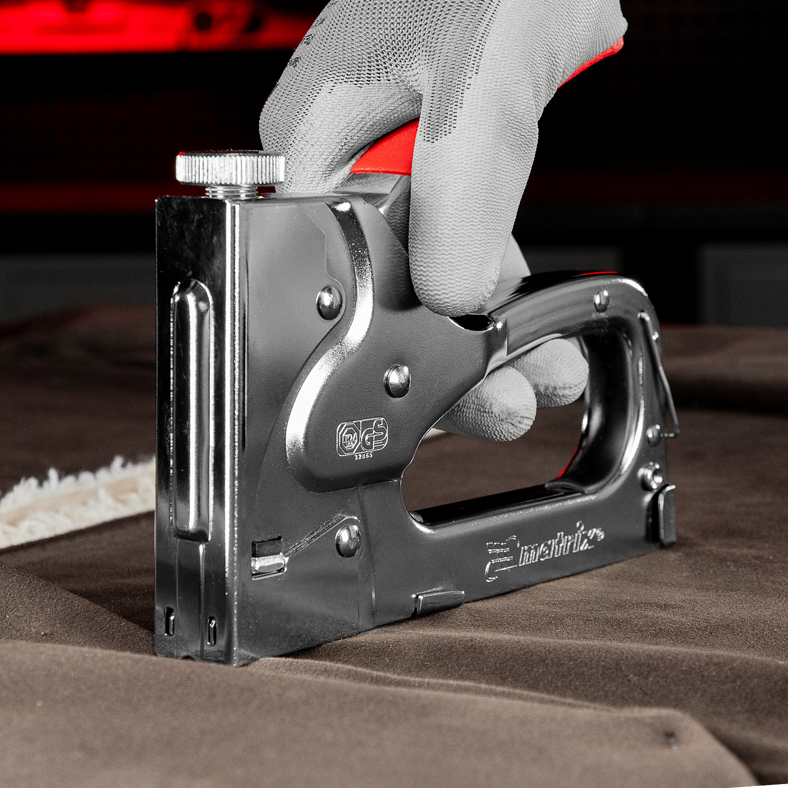 Мебельный 4-функциональный степлер Matrix 40901 имеет универсальный механизм, совместимый со скобами типов 140, 36, 300 и 500 размером 6-14 мм, поэтому его можно использовать не только для сборки и обивки мебели, но и для укладки ковровых покрытий, монтажа низковольтных кабелей, а также выполнения багетных работ. Инструмент применяется для закрепления фанеры, картона, ДВП, ДСП, пленки и утеплителя на деревянном основании. Штампованный стальной корпус устойчив к нагрузкам, поэтому степлер выдерживает интенсивное использование.