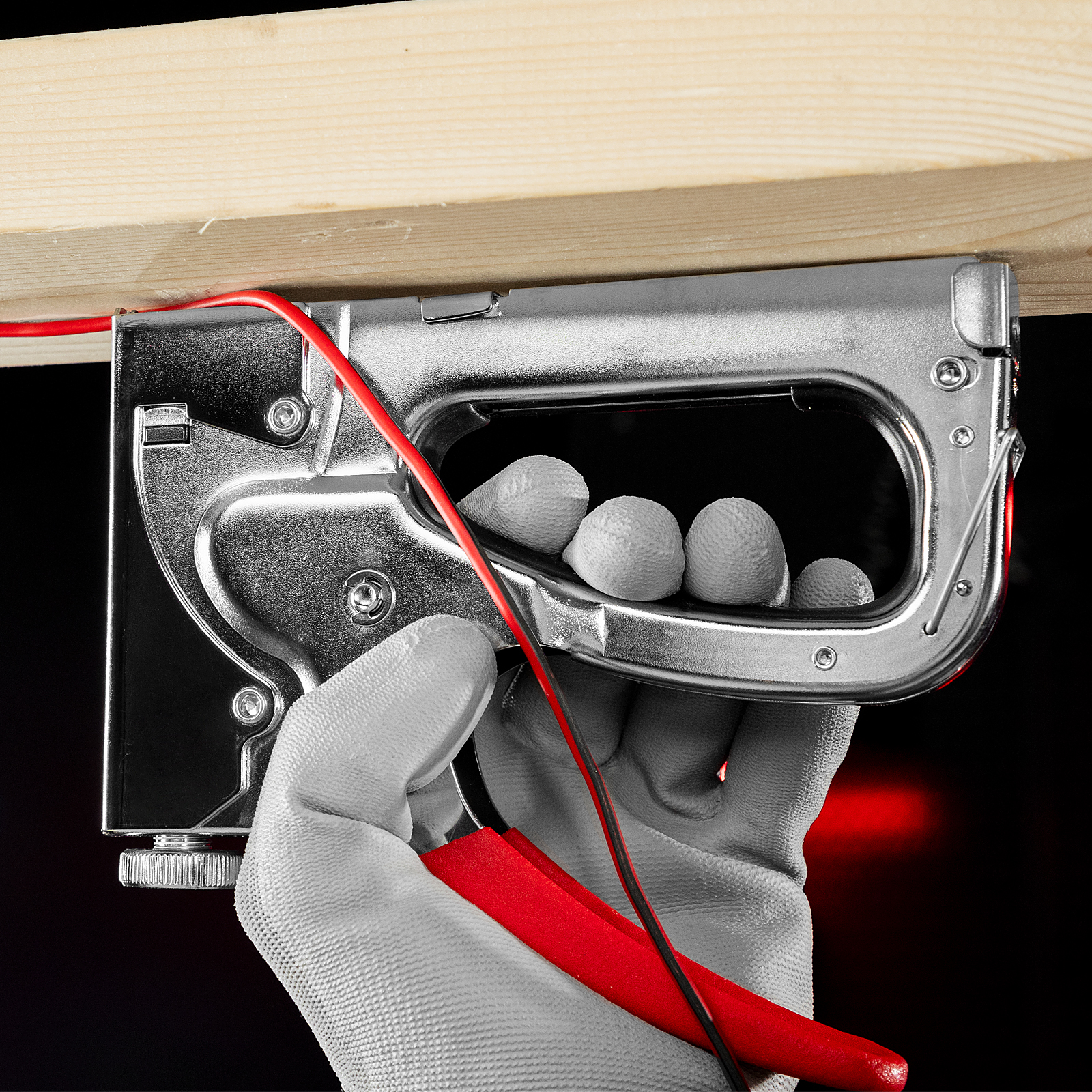 Эффективность — плавная регулировка силы удара позволяет контролировать глубину забивания скоб, а запас мощности облегчает работу с материалами из древесины твердых пород.