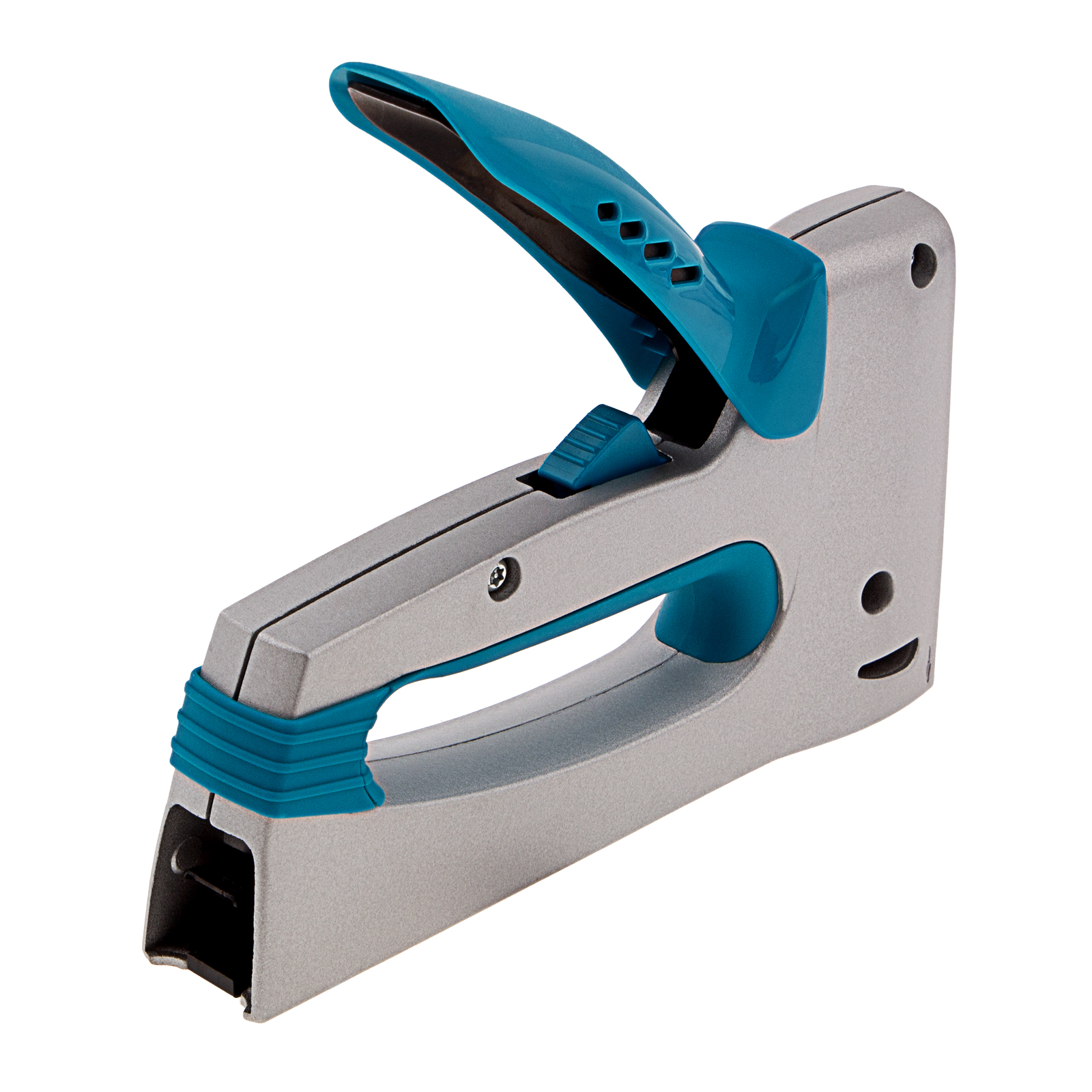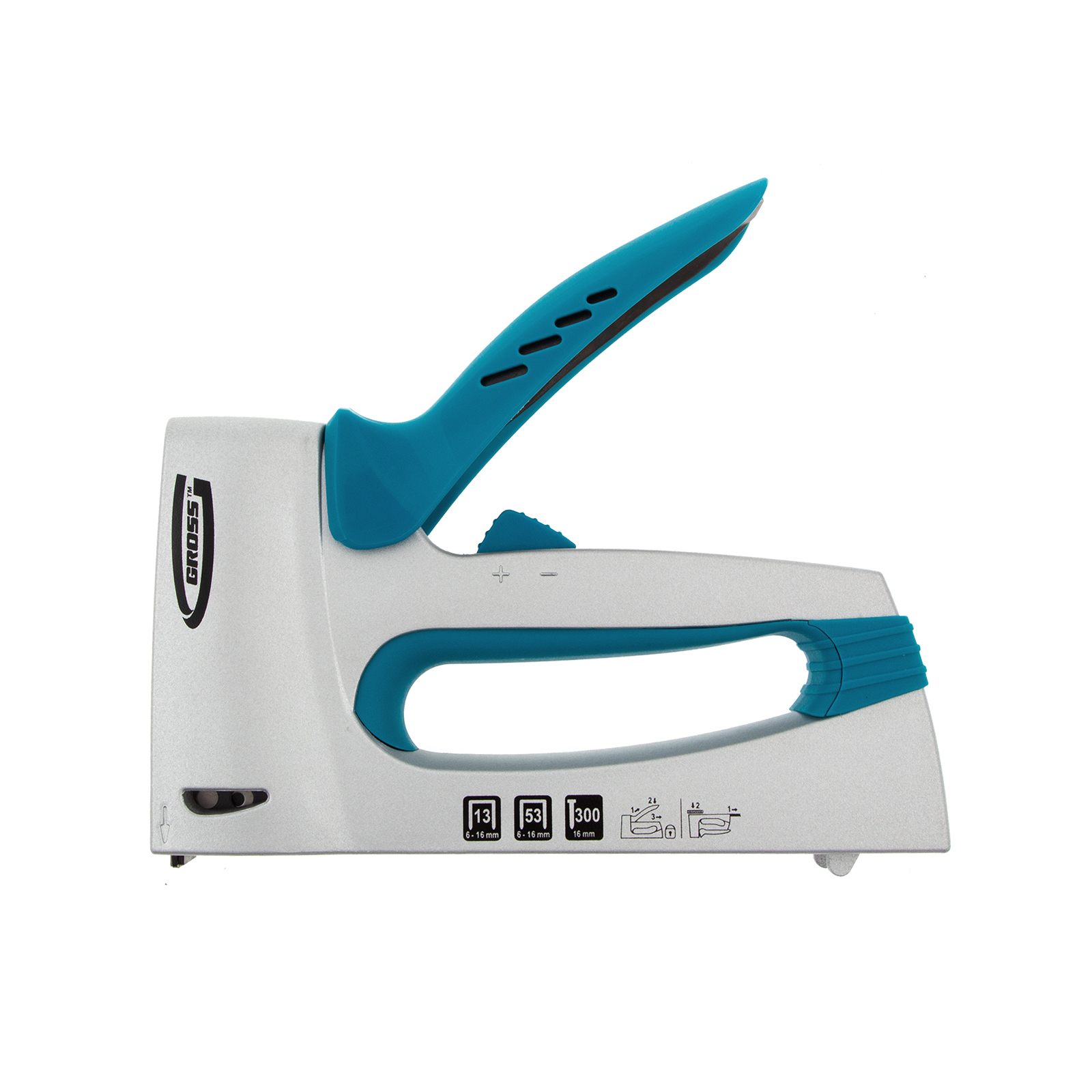 Мебельный степлер Gross 41002 в алюминиевом корпусе, с функцией регулировки силы удара, совместим со скобами типа 13 и 53 размером 6-16 мм и гвоздями типа 300 размером 16 мм. Инструмент используют для фиксации на деревянном основании оргалита, фанеры, ДВП, ДСП, пленки, утеплителя и других листовых материалов. Инструмент будет полезен при сборке и обшивке мебели, укладке ковровых покрытий и изоляционных материалов, выполнении багетных работ. Подходит для профессионального применения.