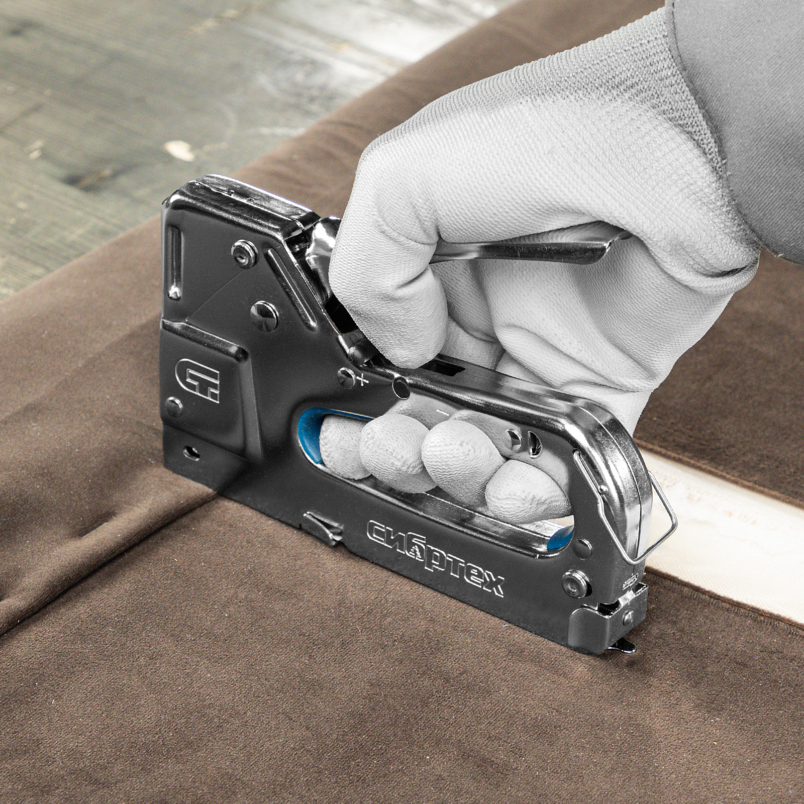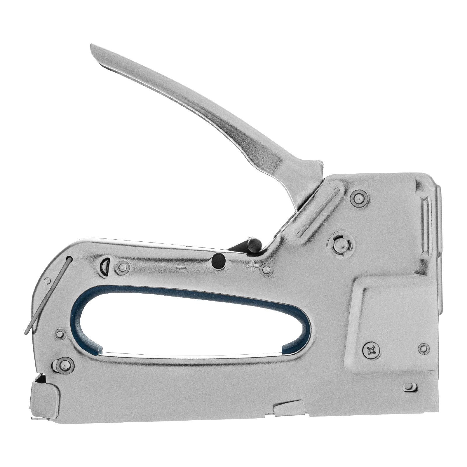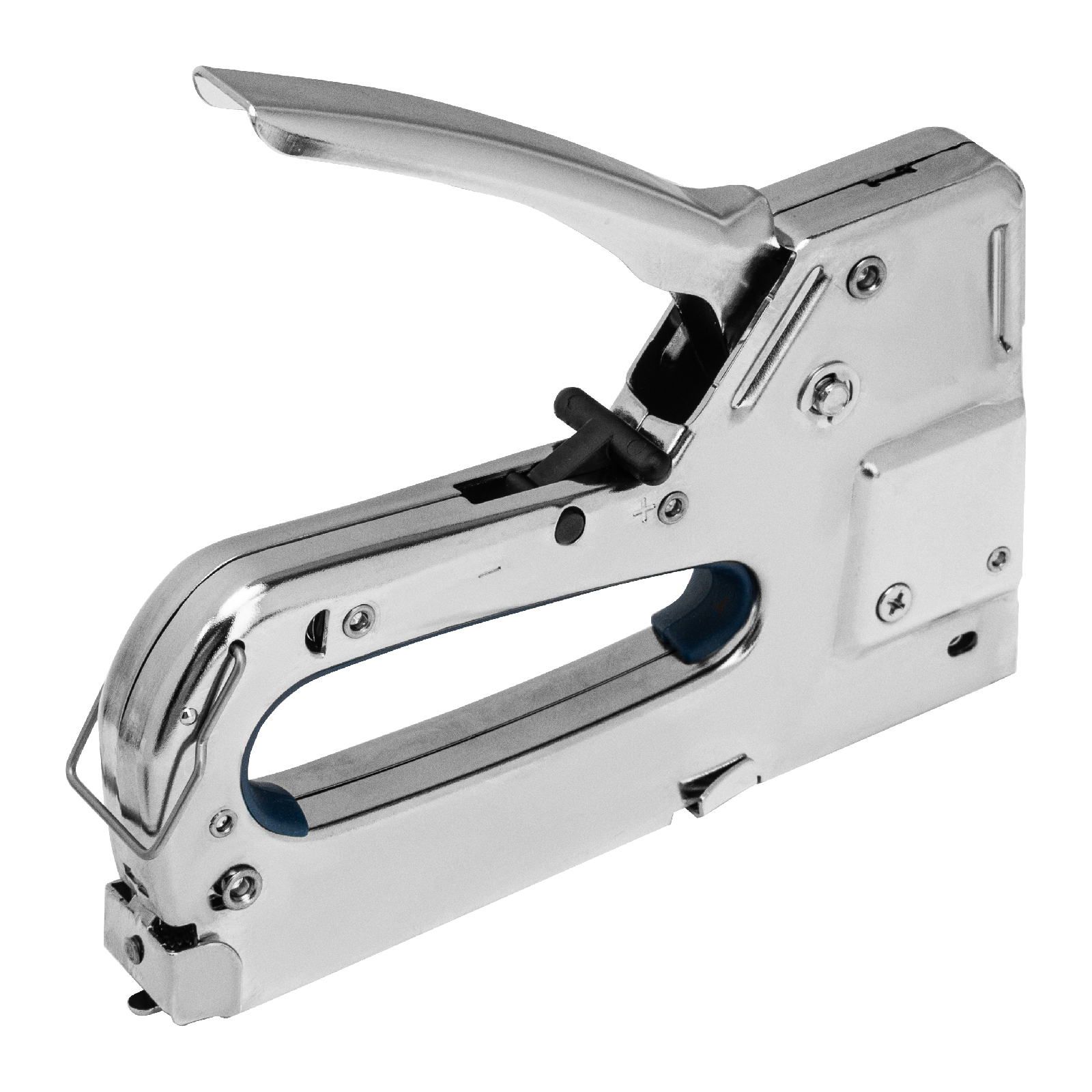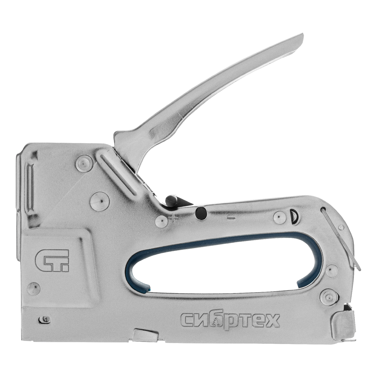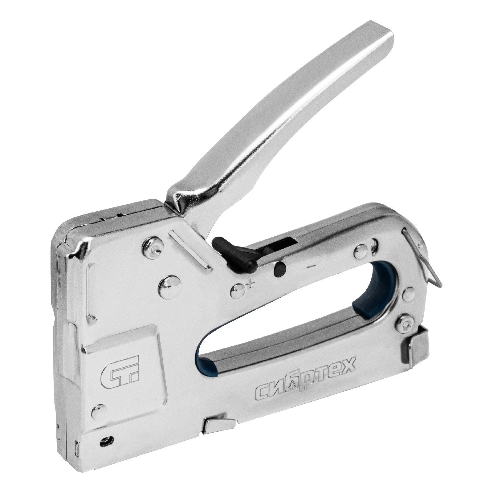 - Безопасное хранение и транспортировка — скоба-фиксатор удерживает рукоятку в нерабочем положении, исключая случайное срабатывание степлера.