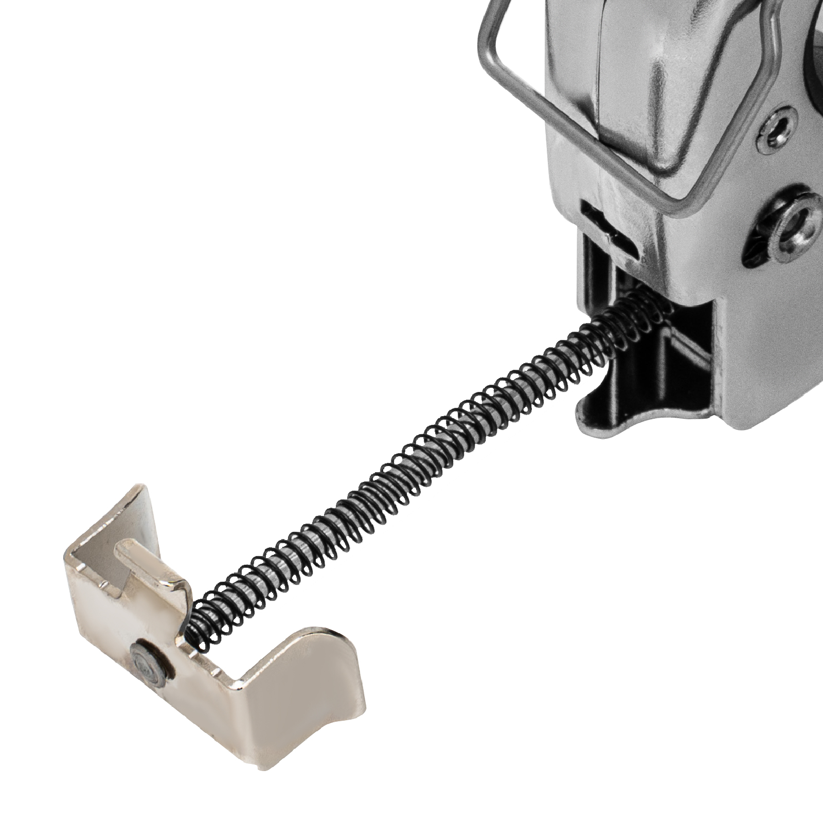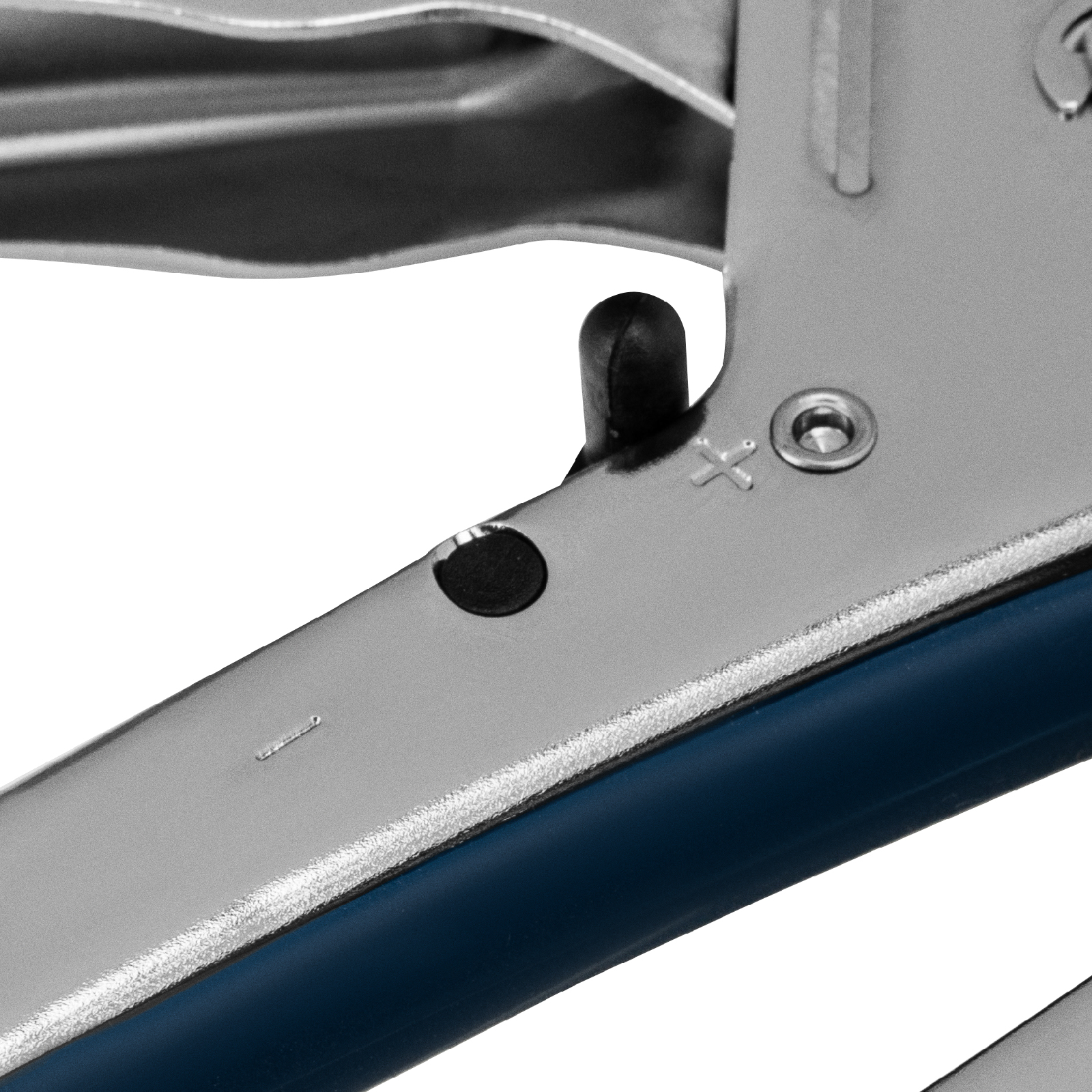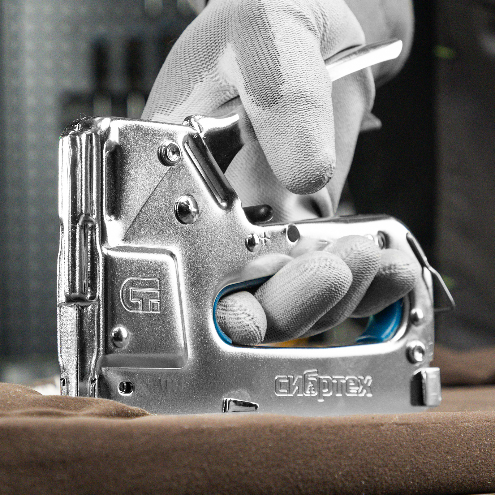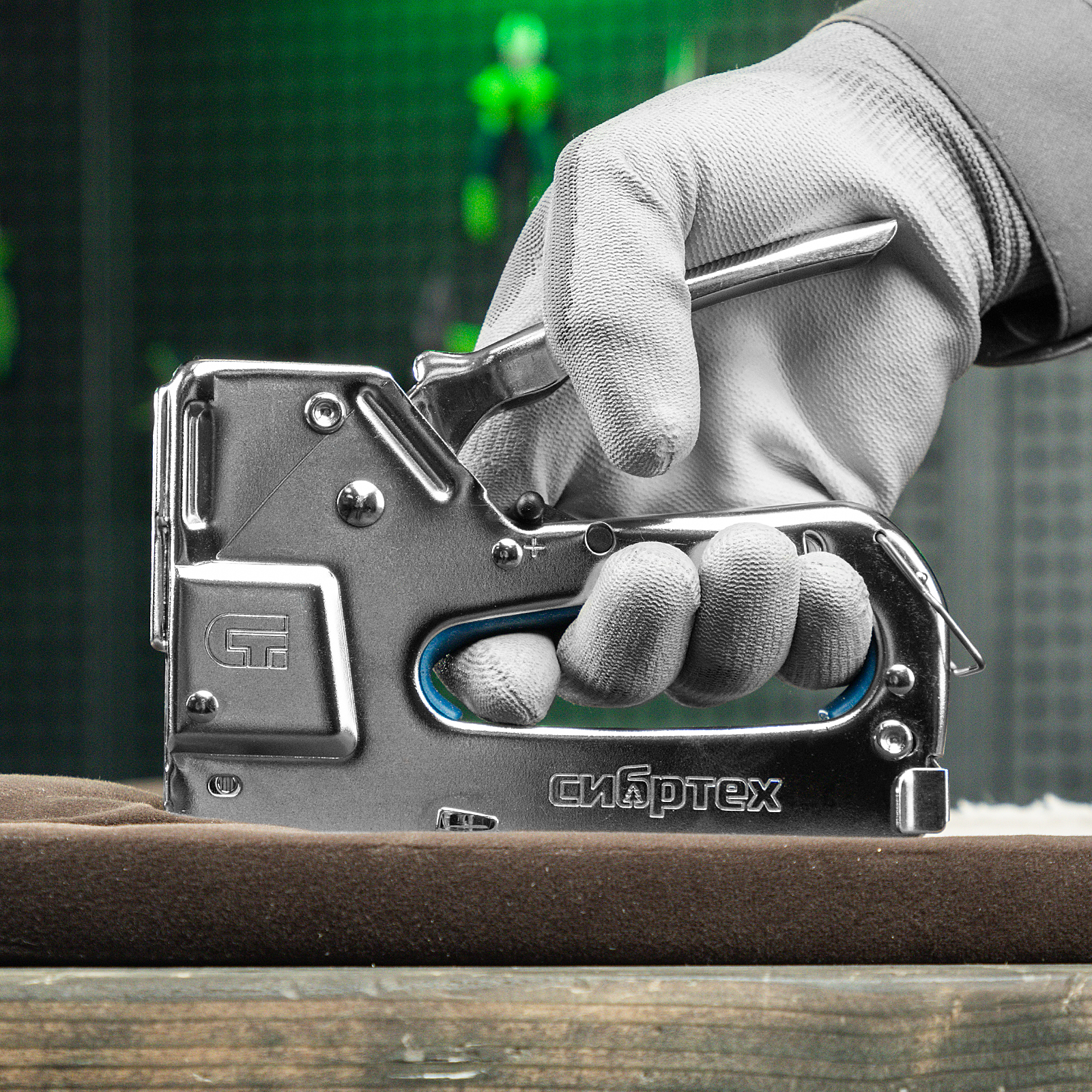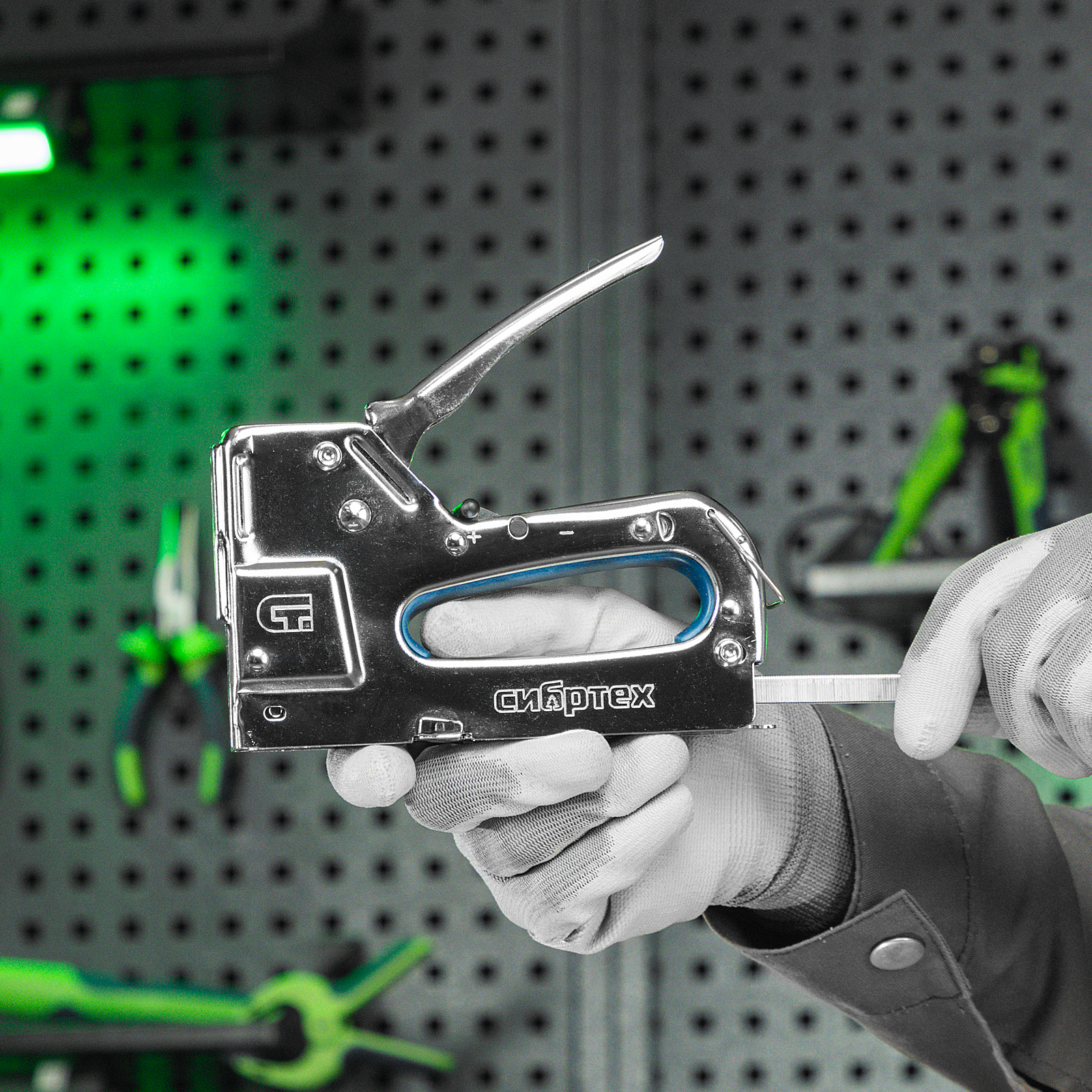 - Безопасное хранение и транспортировка — скоба-фиксатор удерживает рукоятку в нерабочем положении, исключая случайное срабатывание степлера.