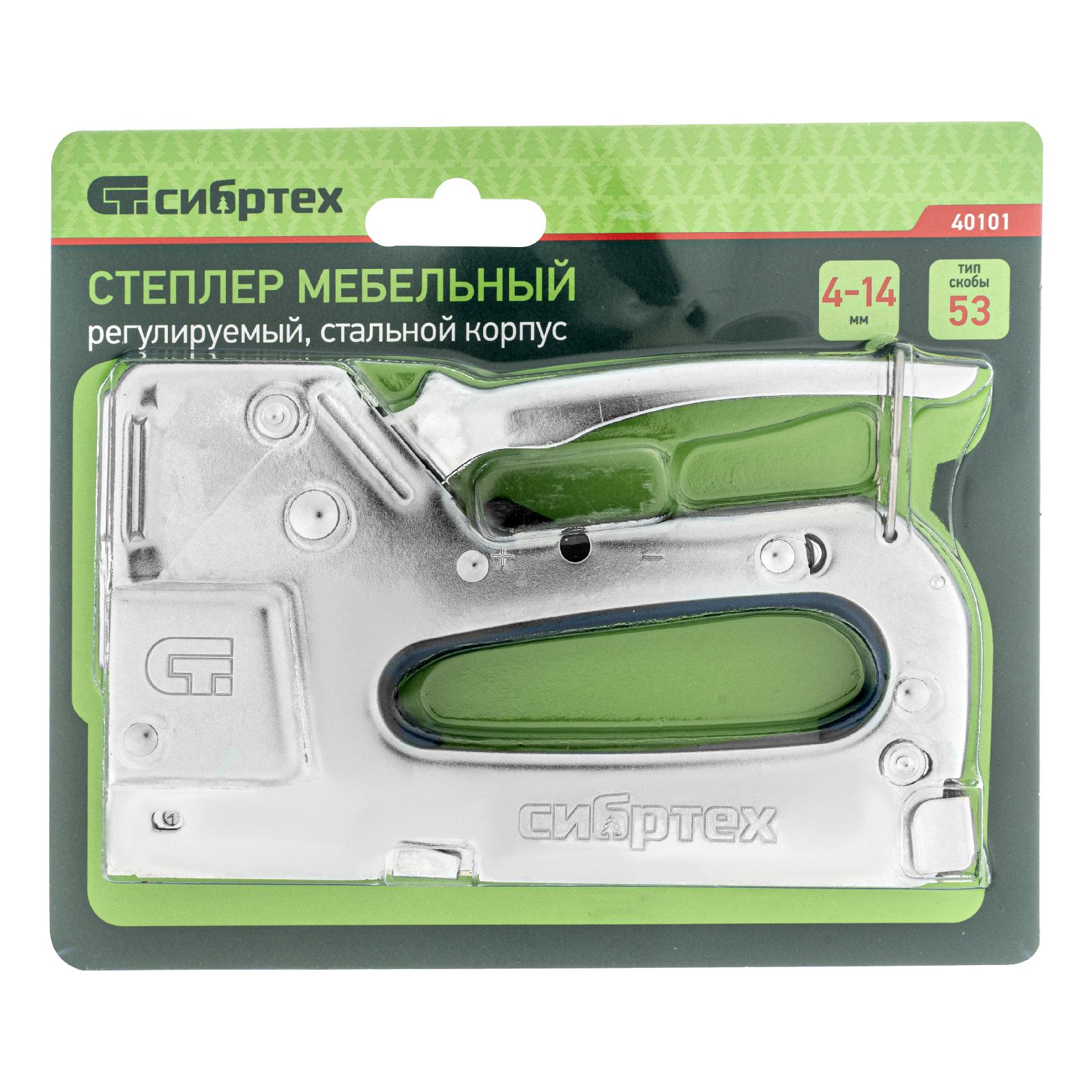 Металлический регулируемый мебельный степлер Сибртех 40101 совместим со скобами типа 53 размером 4-14 мм и используется для быстрого соединения листов оргалита, фанеры, ДВП, ДСП, пленки и утеплителя с деревянными основаниями. Будет полезен при обивке мебели и укладке напольных покрытий. Ударный механизм с рессорной пружиной выдерживает длительное использование. Степлер подходит для частого использования.