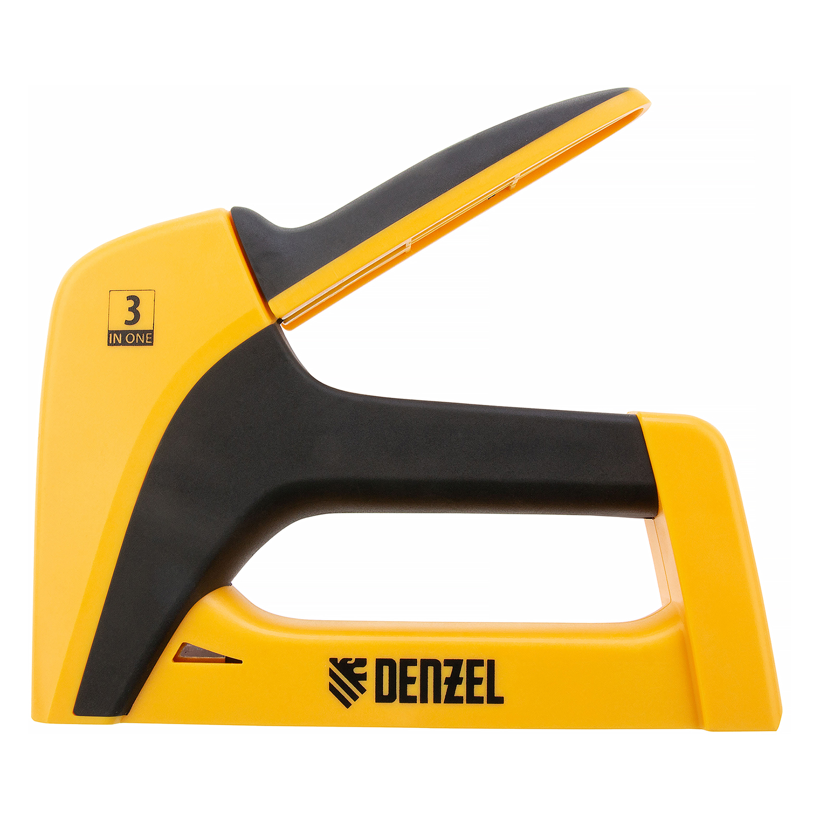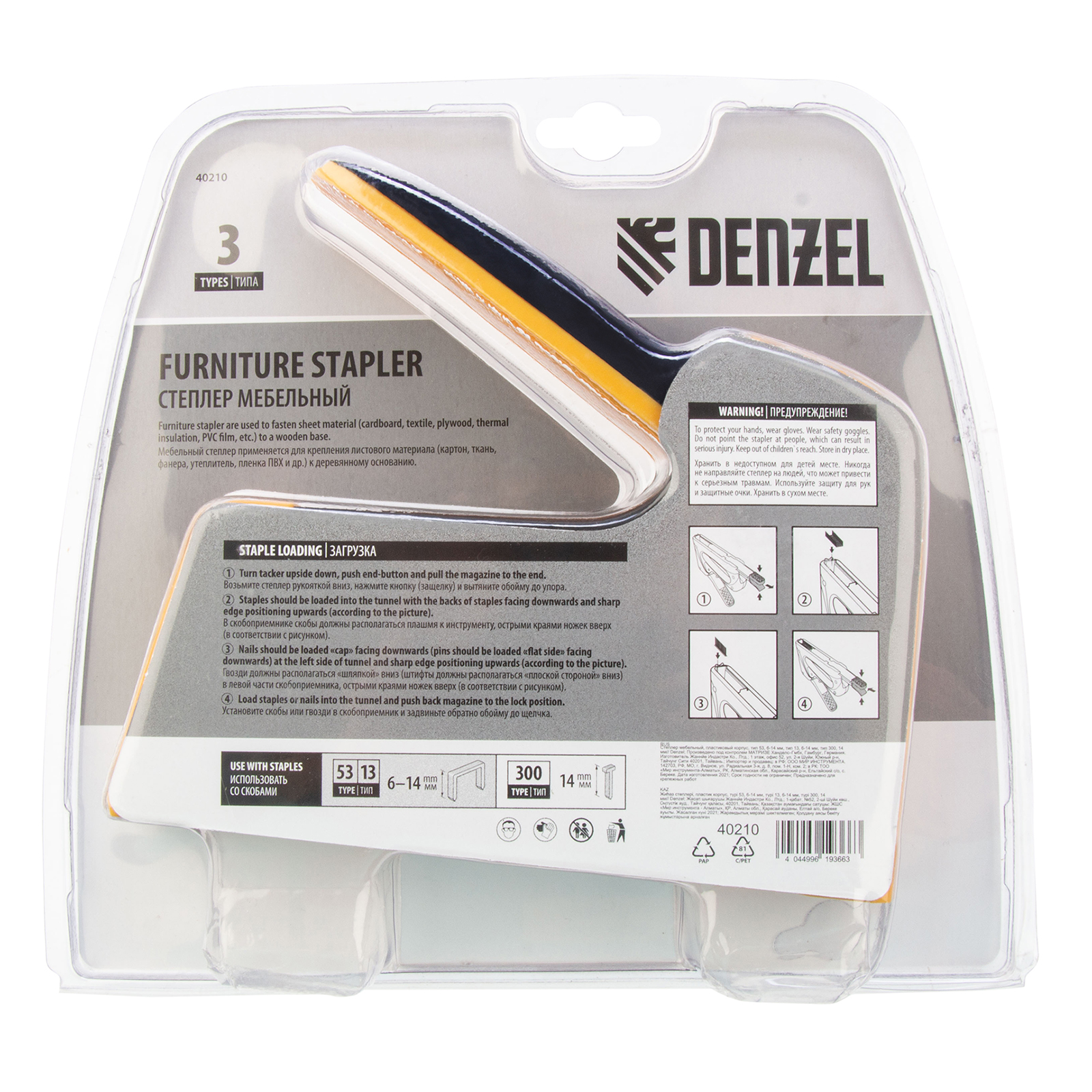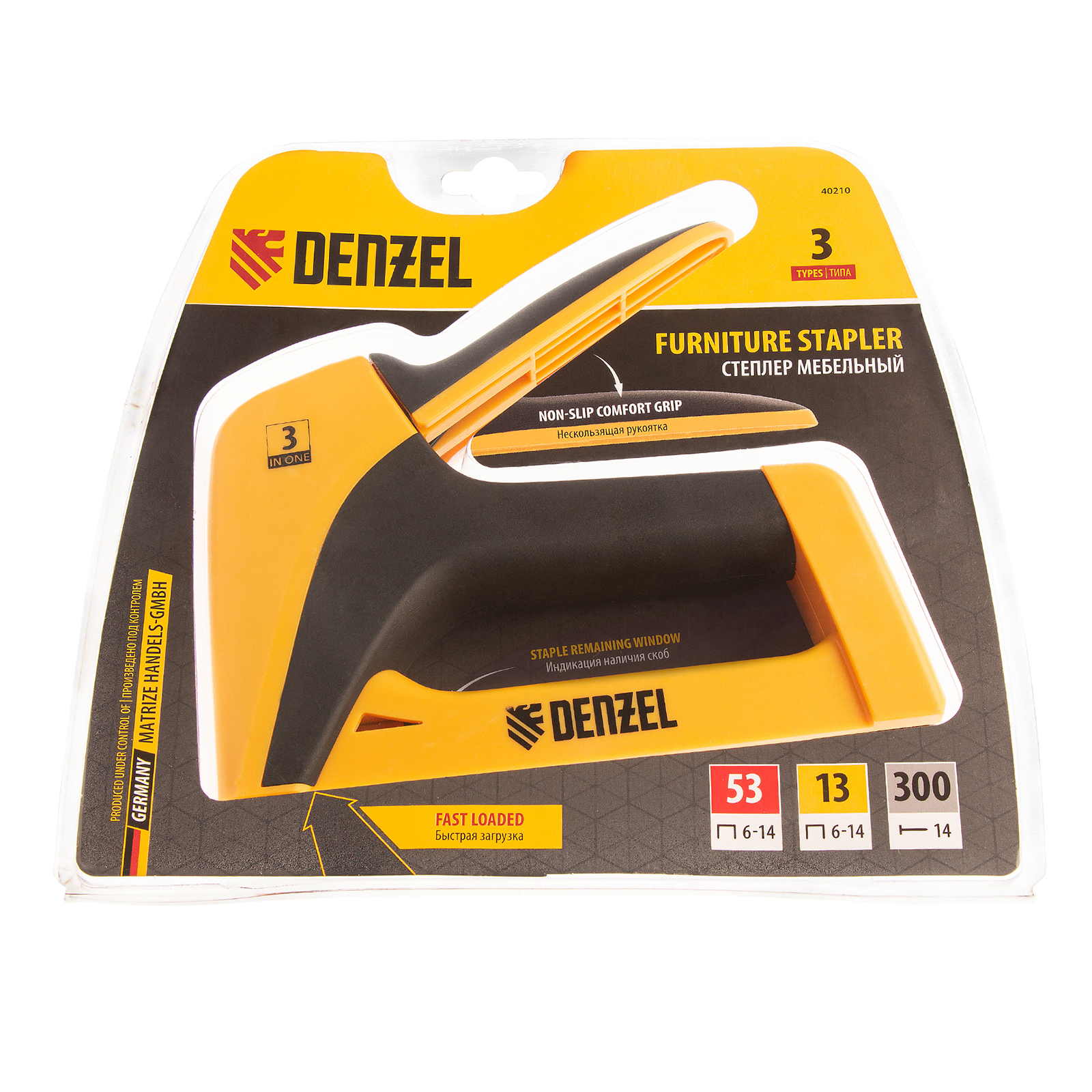 <p>Мебельный степлер Denzel 40210 в пластиковом корпусе совместим со скобами типа 53, 13 размером 6-14 мм и типа 300 (14 мм), и позволяет быстро скреплять с деревянным основанием листовой материал — фанеру, ткань, пленку ПВХ, утеплитель, картон. Инструмент весит 400 г и удобен для длительного использования. Будет полезен при сборке и обивке мебели, укладке напольных покрытий, а также во время выполнения ремонтных и багетных работ.</p><h2>Преимущества</h2><ul><li>Устойчивость к механическим повреждениям — корпус изготовлен методом литья из ударопрочного ABS-пластика. </li><li>Удобный контроль наличия скоб — в корпусе имеется специальная прорезь.</li><li>Экономия времени пользователя — производитель предусмотрел функцию быстрой загрузки скоб.</li><li>Эргономичность — двухкомпонентная рукоятка имеет нескользящую поверхность.</li></ul>