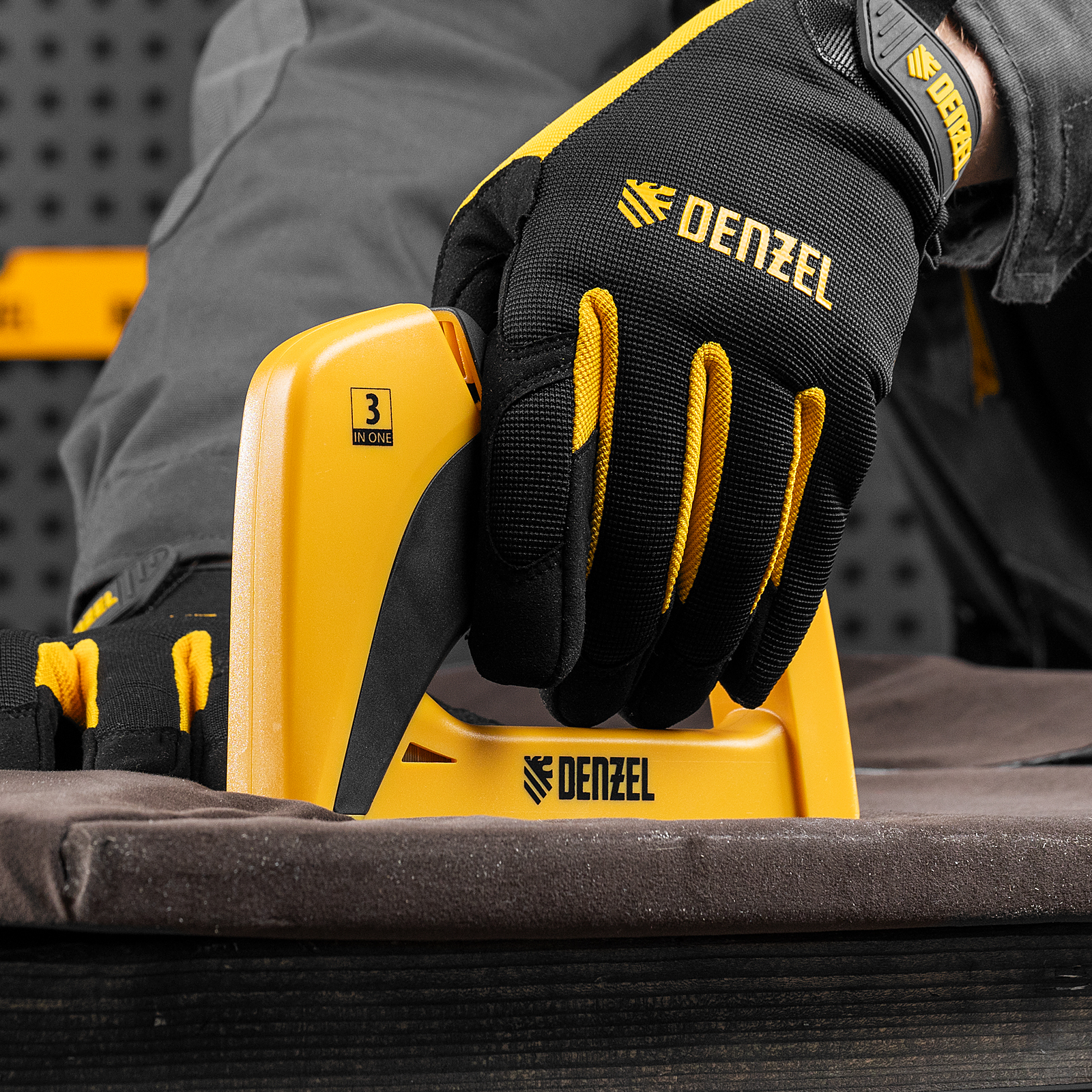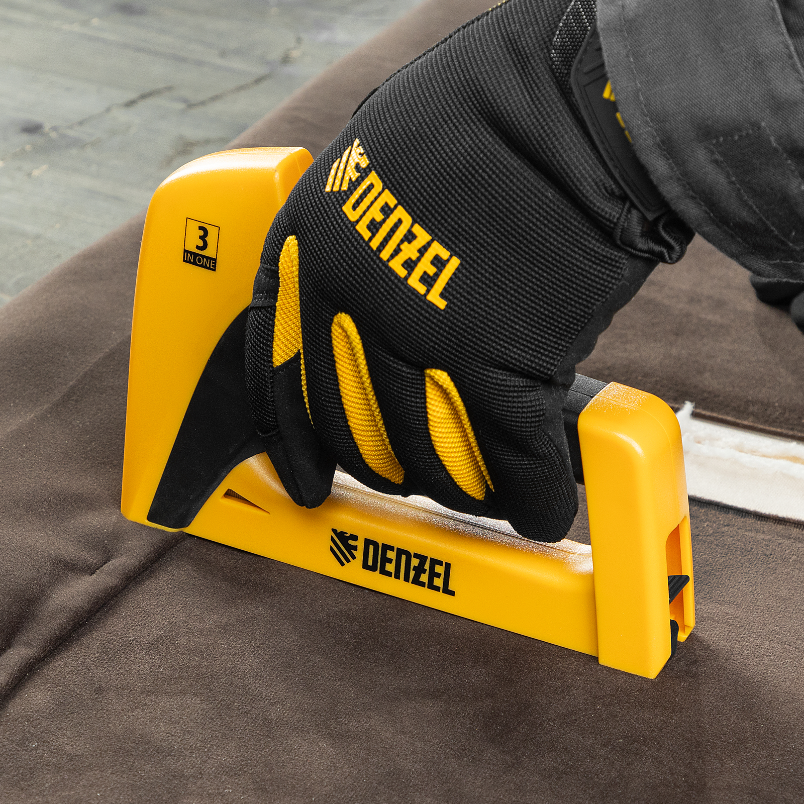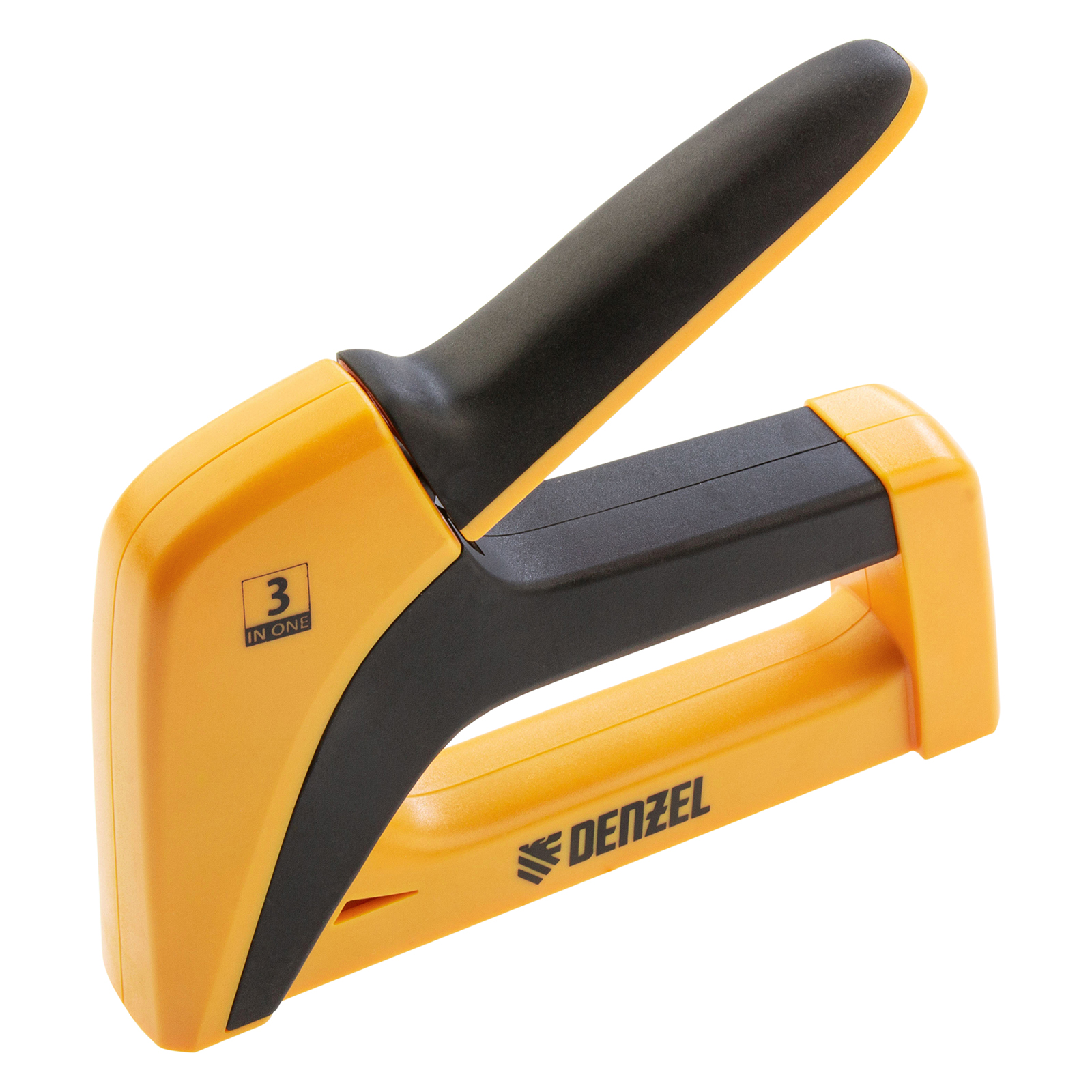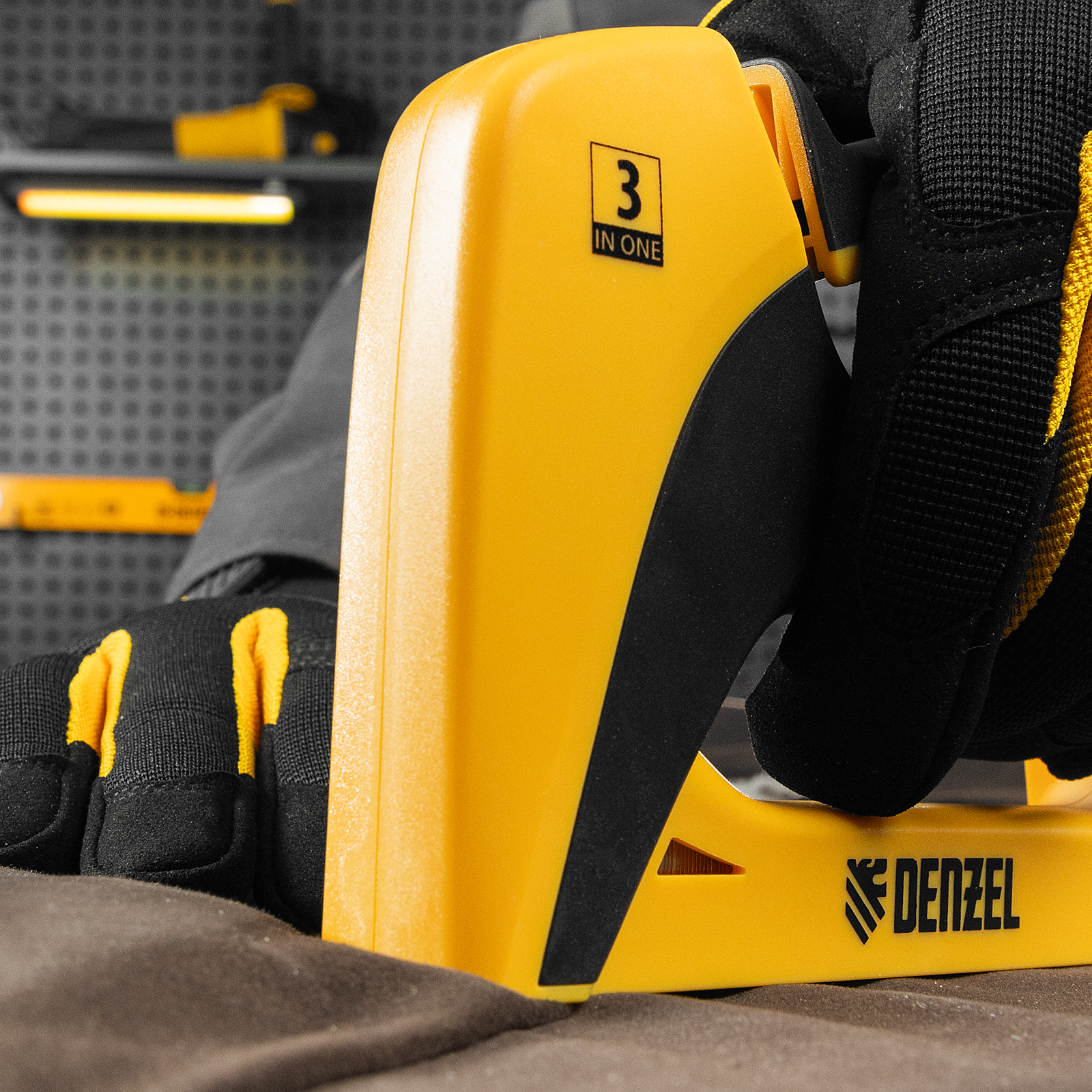<p>Мебельный степлер Denzel 40210 в пластиковом корпусе совместим со скобами типа 53, 13 размером 6-14 мм и типа 300 (14 мм), и позволяет быстро скреплять с деревянным основанием листовой материал — фанеру, ткань, пленку ПВХ, утеплитель, картон. Инструмент весит 400 г и удобен для длительного использования. Будет полезен при сборке и обивке мебели, укладке напольных покрытий, а также во время выполнения ремонтных и багетных работ.</p><h2>Преимущества</h2><ul><li>Устойчивость к механическим повреждениям — корпус изготовлен методом литья из ударопрочного ABS-пластика. </li><li>Удобный контроль наличия скоб — в корпусе имеется специальная прорезь.</li><li>Экономия времени пользователя — производитель предусмотрел функцию быстрой загрузки скоб.</li><li>Эргономичность — двухкомпонентная рукоятка имеет нескользящую поверхность.</li></ul>