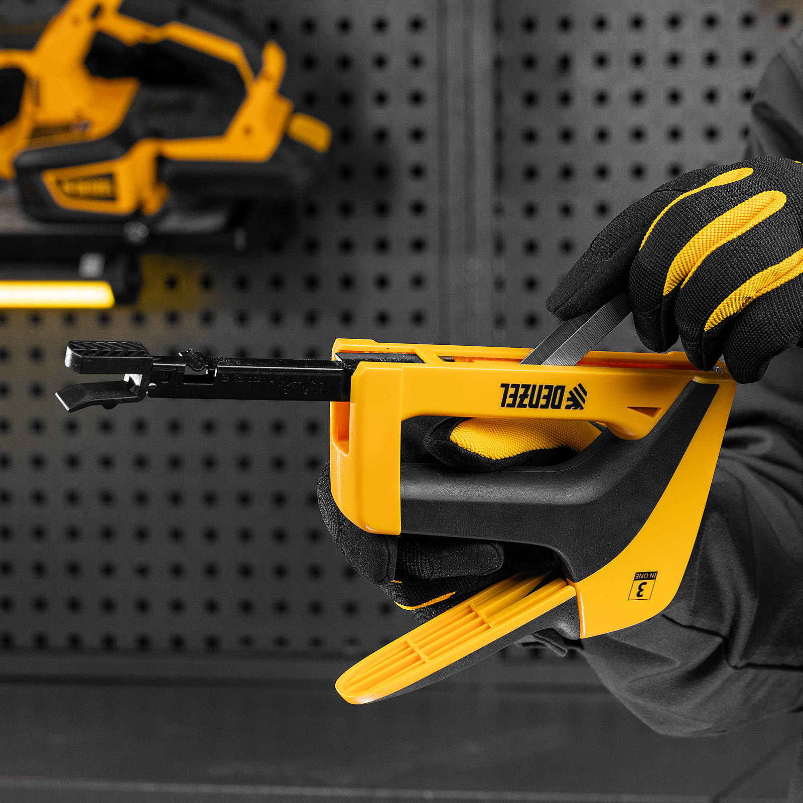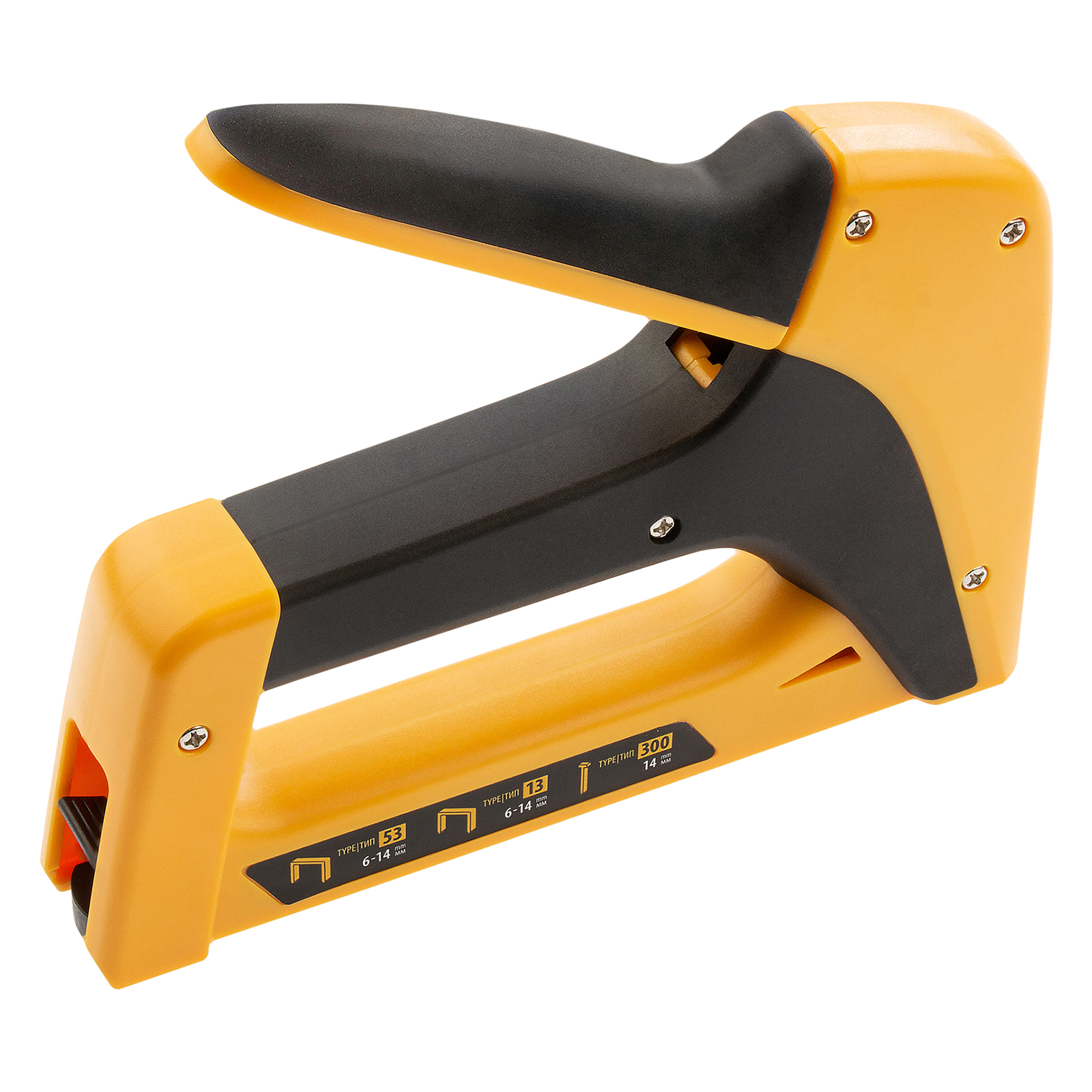 Мебельный степлер Denzel 40210 в пластиковом корпусе совместим со скобами типа 53, 13 размером 6-14 мм и типа 300 (14 мм), и позволяет быстро скреплять с деревянным основанием листовой материал — фанеру, ткань, пленку ПВХ, утеплитель, картон. Инструмент весит 400 г и удобен для длительного использования. Будет полезен при сборке и обивке мебели, укладке напольных покрытий, а также во время выполнения ремонтных и багетных работ.