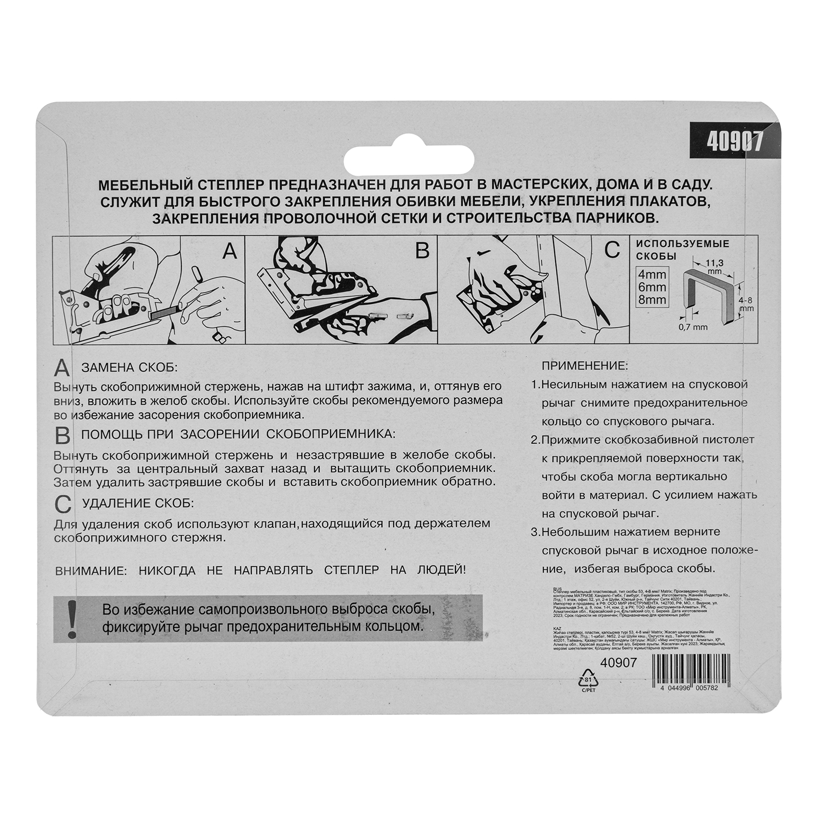 Пластиковый мебельный степлер Matrix 40907 используется с короткими скобами типа 53 размером 4-8 мм. Применяется для закрепления на деревянном основании тонких листовых материалов — оргалита, ДСП, ДВП, фанеры, пленки или утеплителя. Инструмент будет полезен для выполнения бытовых работ по перетяжке кресел или стульев, а также сборке мебели. Поставляется со скобами в количестве 50 штук.