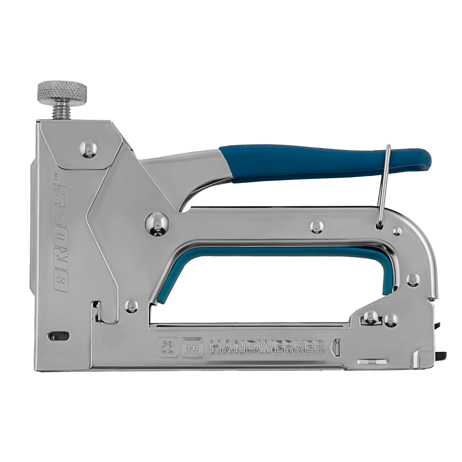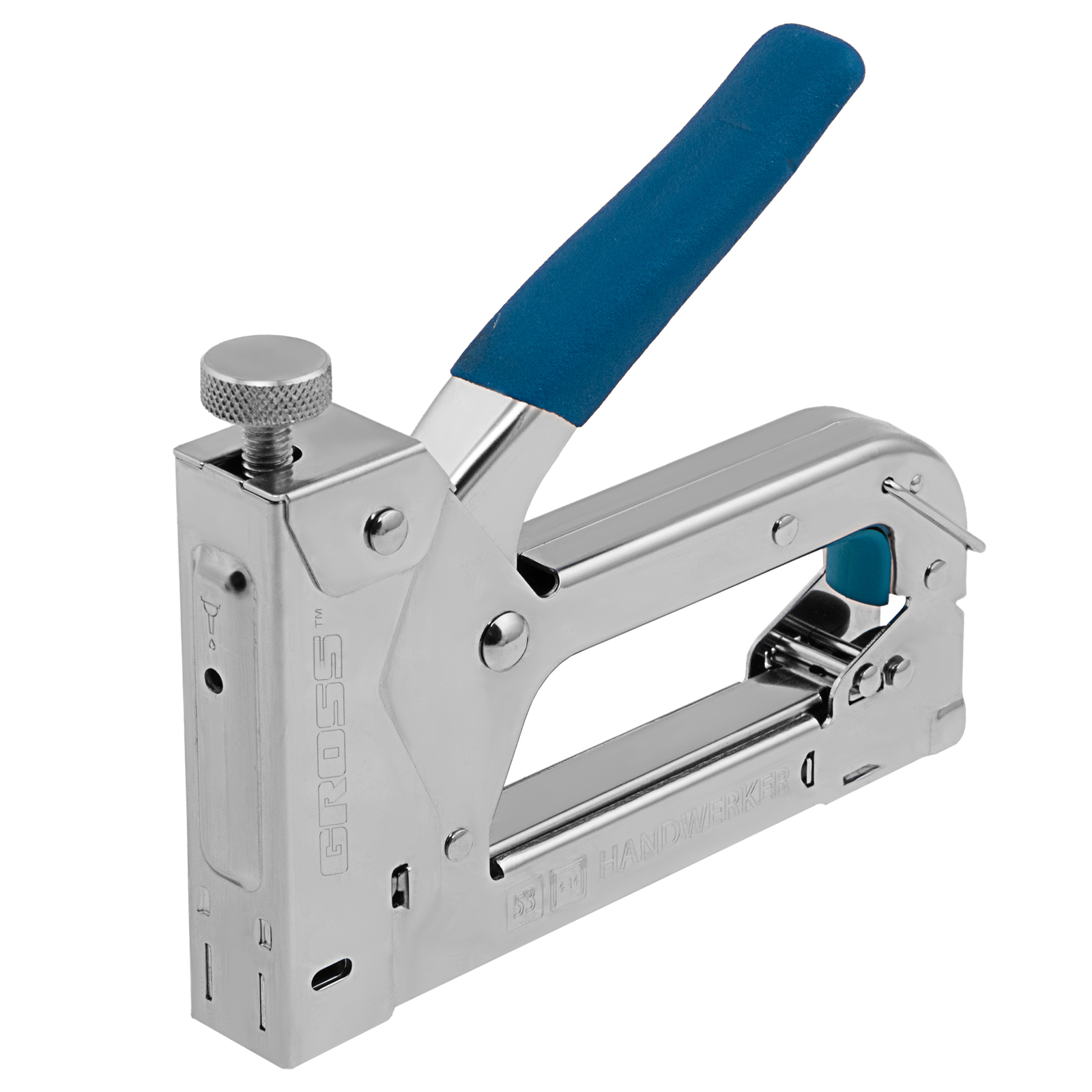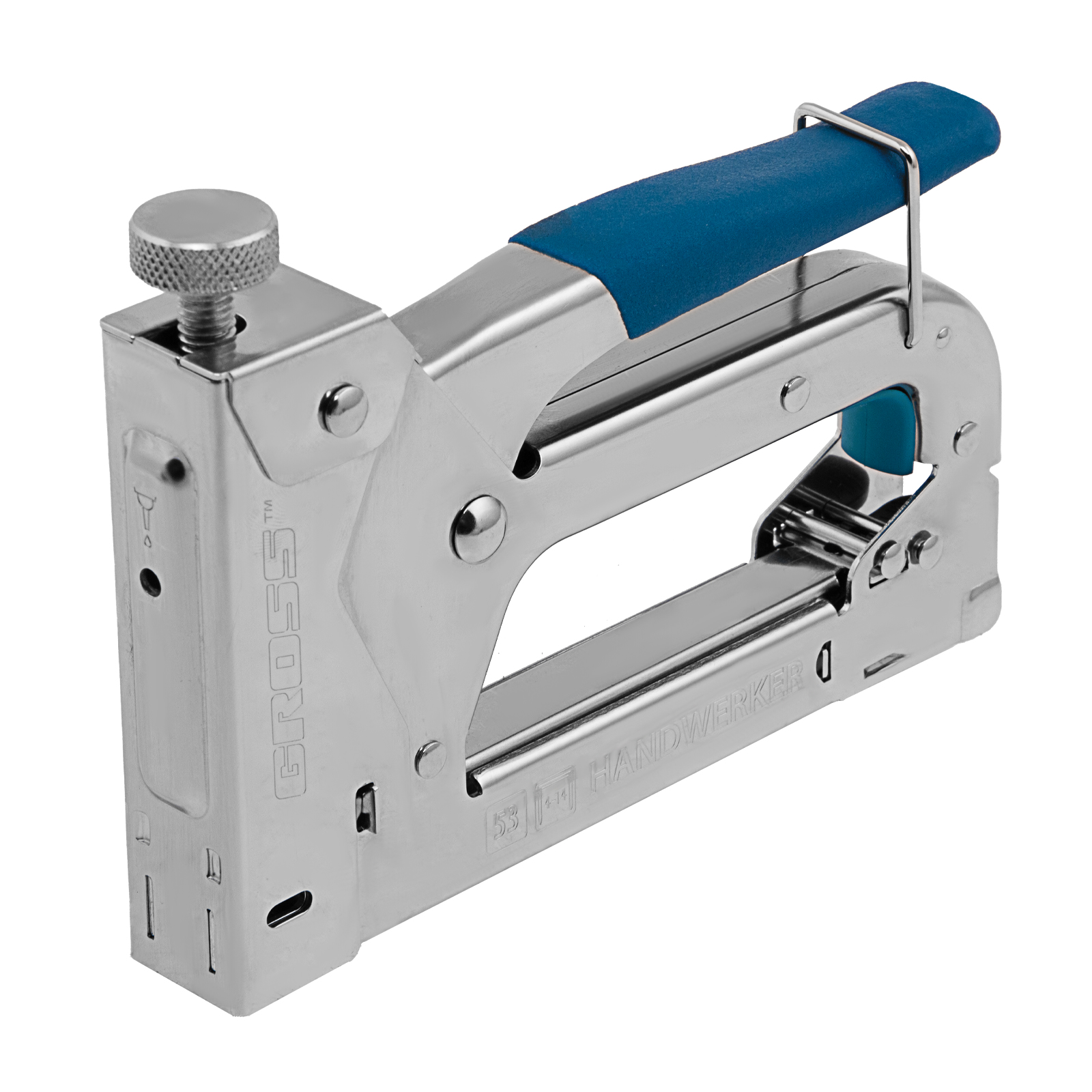Регулируемый мебельный степлер Gross Handwerker 41000 со стальным корпусом совместим со скобами типа 53 размером 4-14 мм и используется для крепежных работ с листовыми материалами из фанеры, картона, ДВП, ДСП, оргалита, а также с пленкой и теплоизоляционными материалами. Винтовой регулятор позволяет плавно изменять силу удара, что удобно для работы с длинными скобами и твердыми материалами. Инструмент будет полезен при сборке и обивке мебели, укладке ковровых покрытий, проведении ремонтных и отделочных работ.