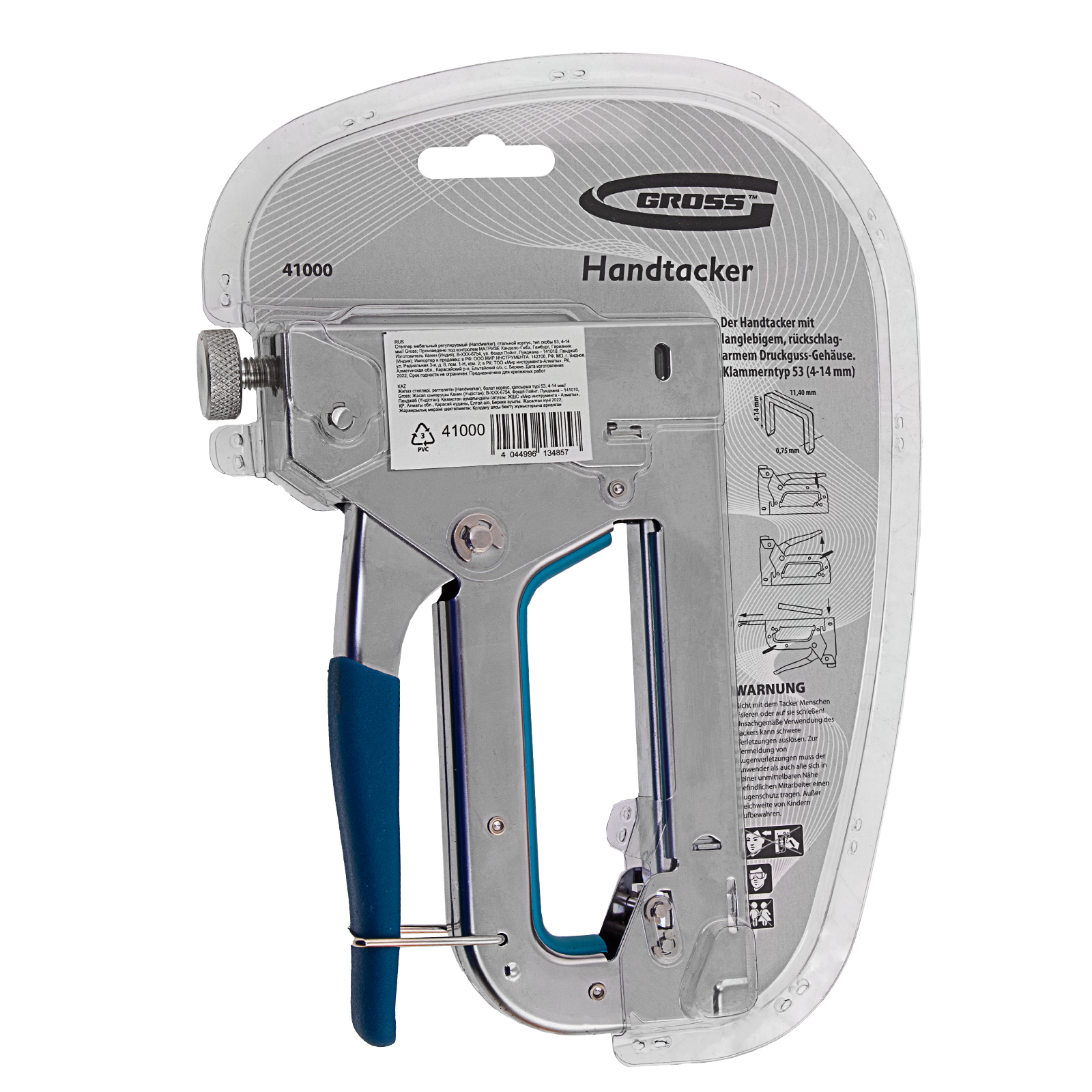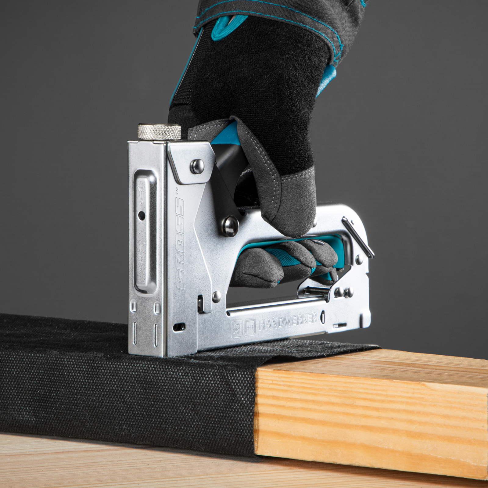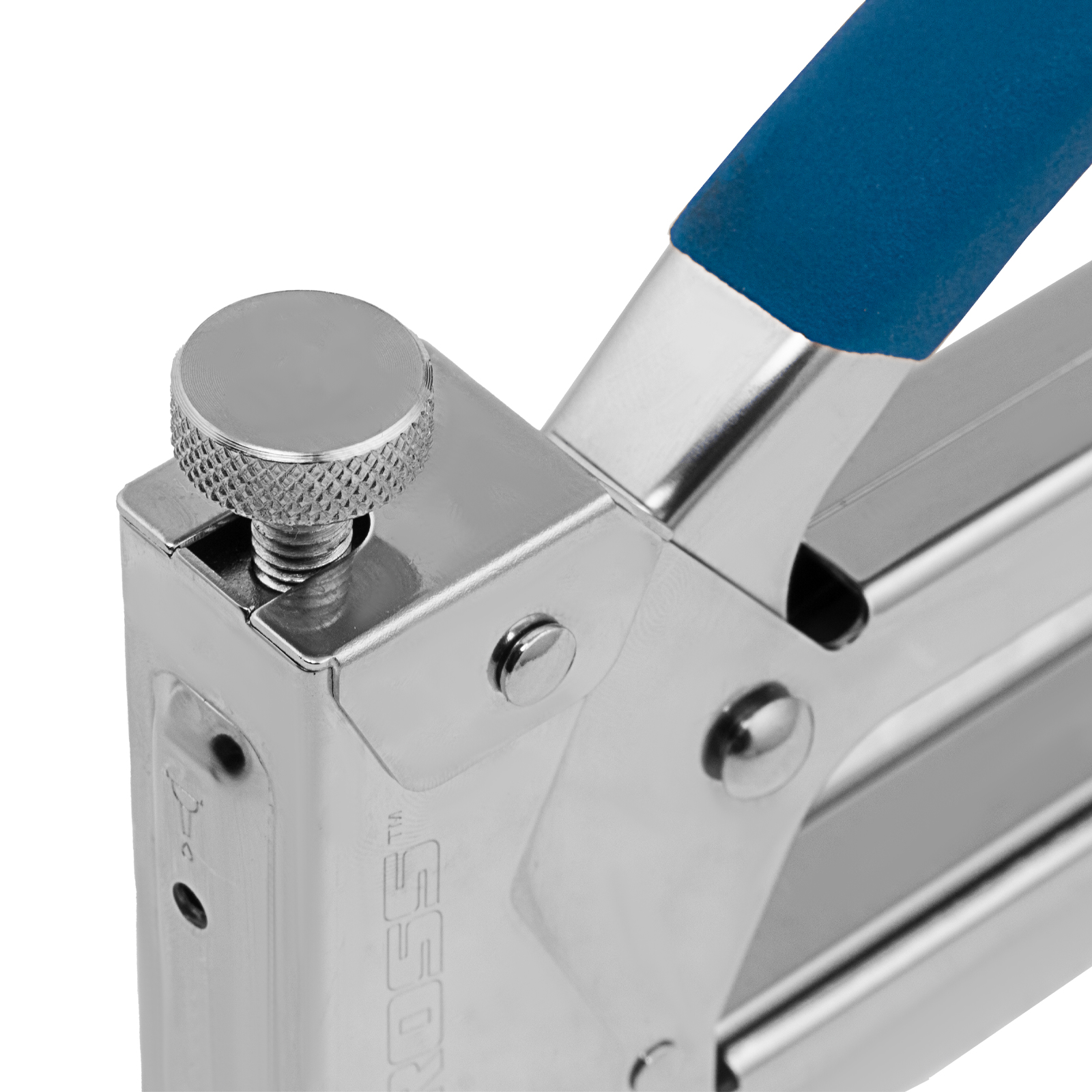 Регулируемый мебельный степлер Gross Handwerker 41000 со стальным корпусом совместим со скобами типа 53 размером 4-14 мм и используется для крепежных работ с листовыми материалами из фанеры, картона, ДВП, ДСП, оргалита, а также с пленкой и теплоизоляционными материалами. Винтовой регулятор позволяет плавно изменять силу удара, что удобно для работы с длинными скобами и твердыми материалами. Инструмент будет полезен при сборке и обивке мебели, укладке ковровых покрытий, проведении ремонтных и отделочных работ.