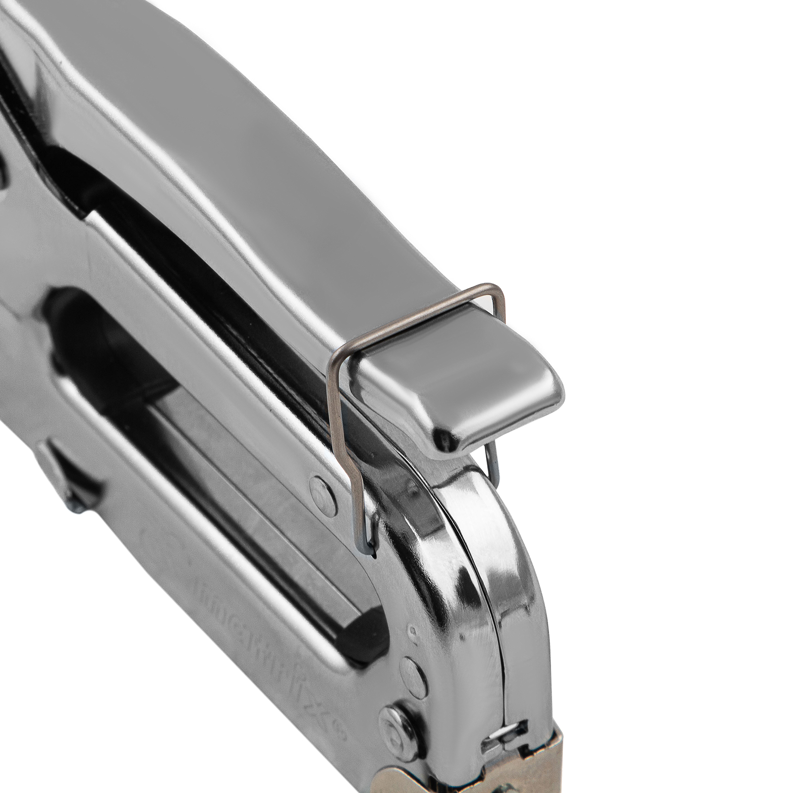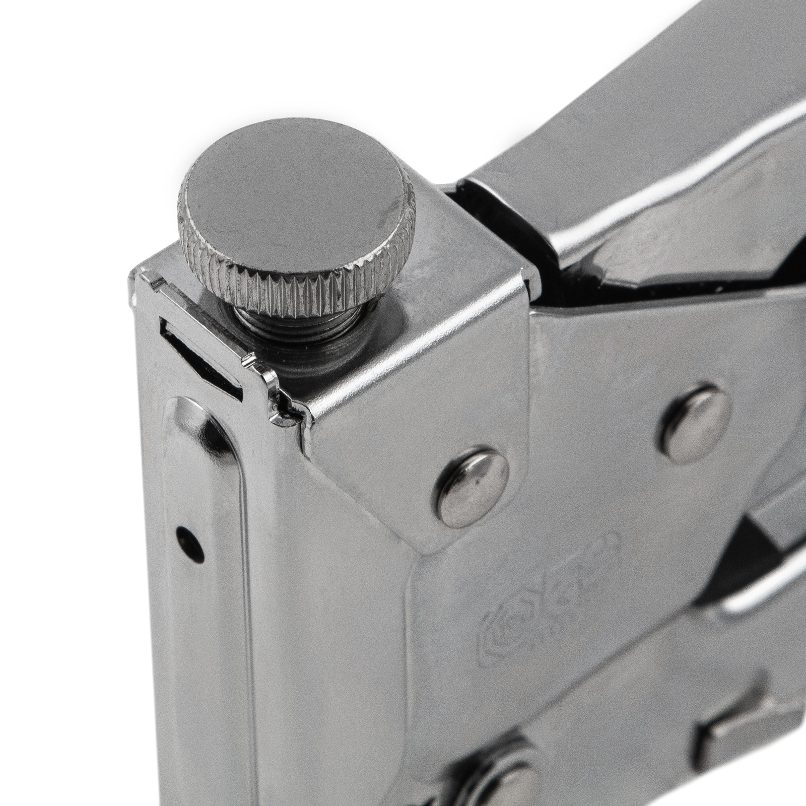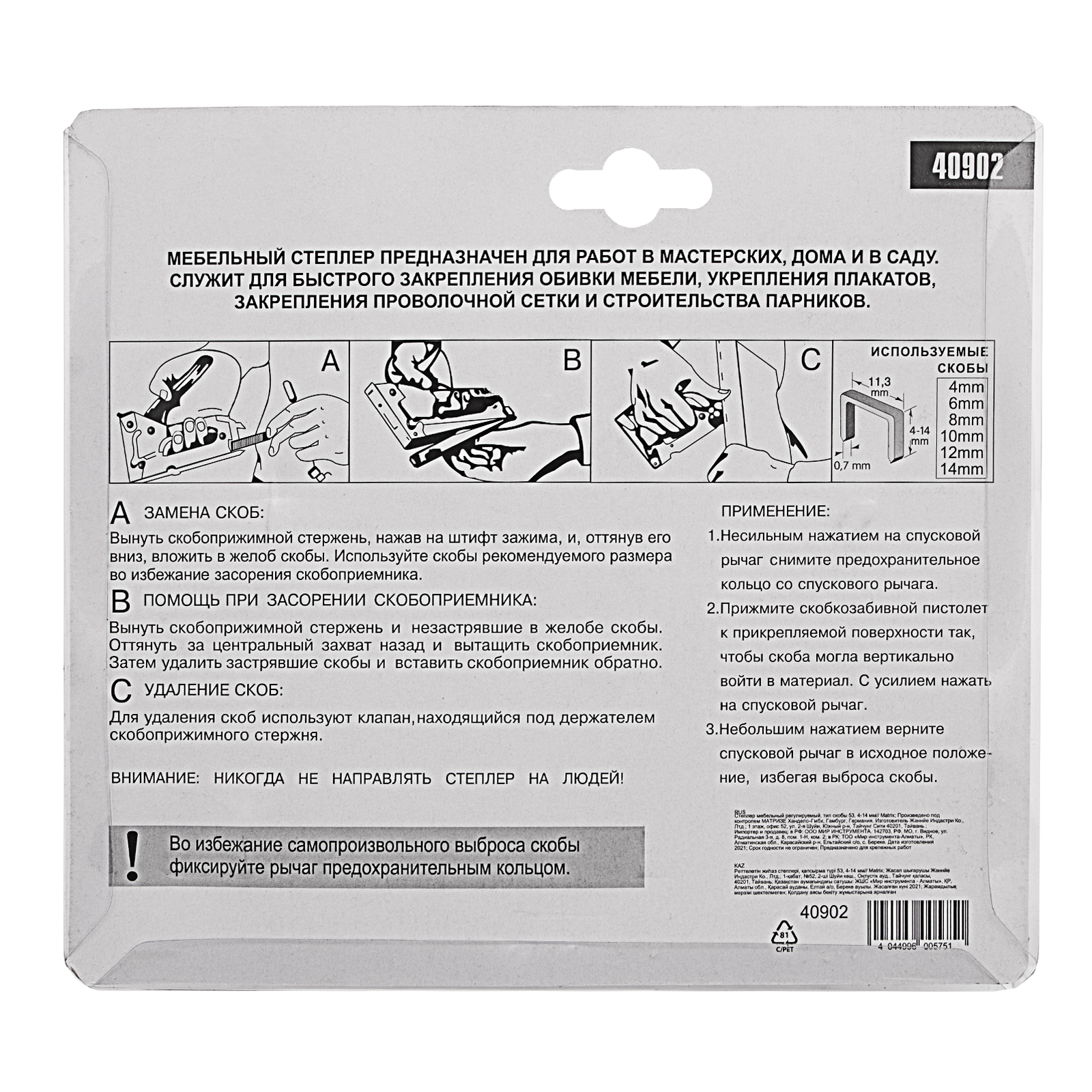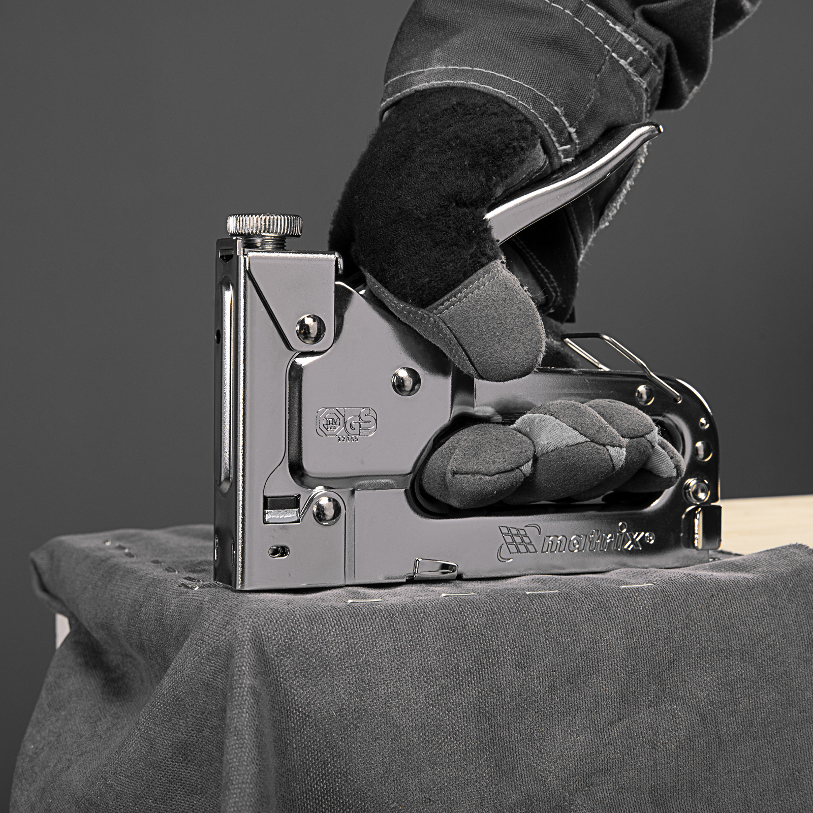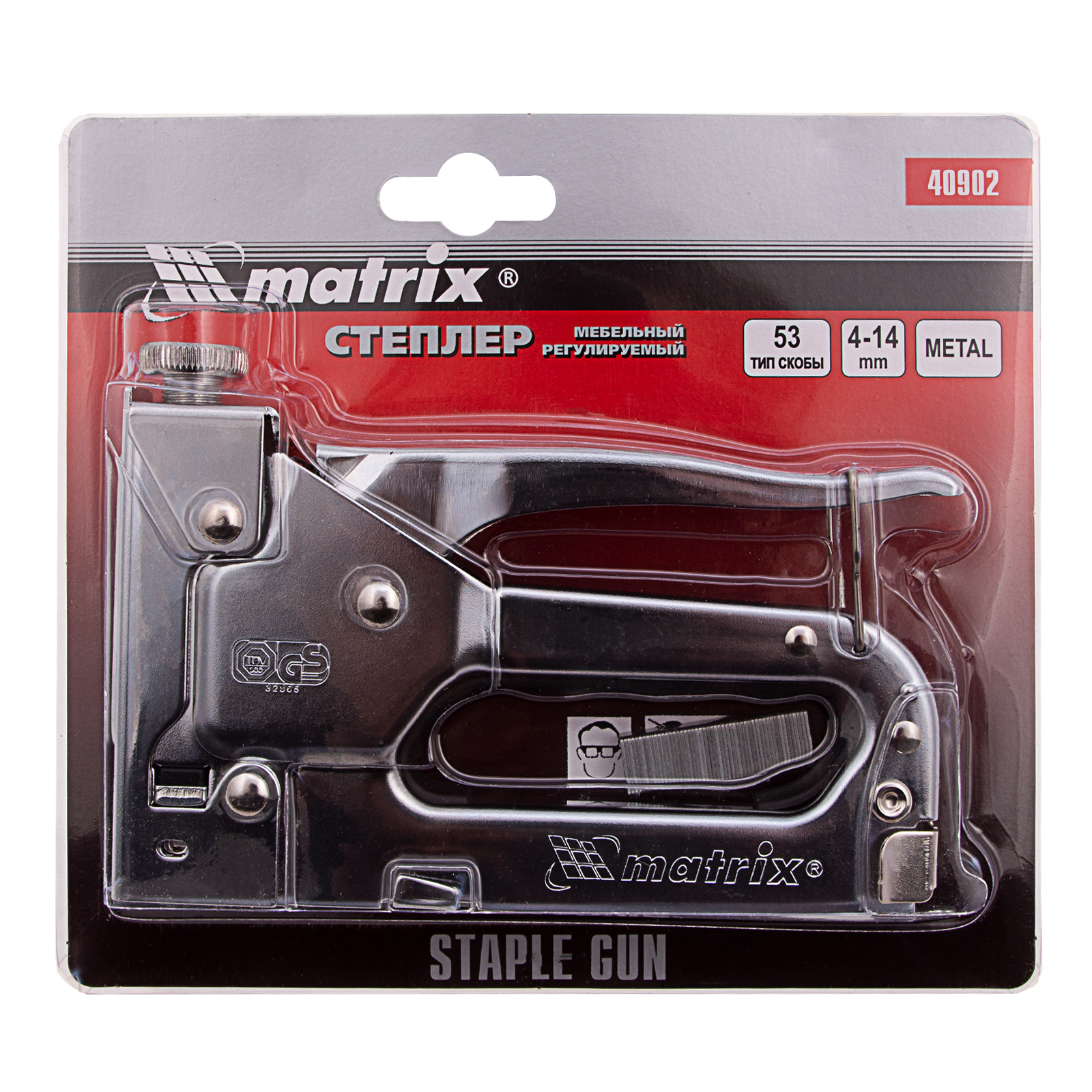 Регулируемый мебельный степлер Matrix 40902, предназначенный для скоб типа 53 размером 4-14 мм, используется для быстрого скрепления с деревянным основанием листовых материалов — фанеры, картона, оргалита, ДВП, ДСП, пленки или утеплителя. Степлер пригодится для сборки и обивки мебели, монтажа теплоизоляции, а также будет полезен в быту. Поставляется со скобами в количестве 50 штук.