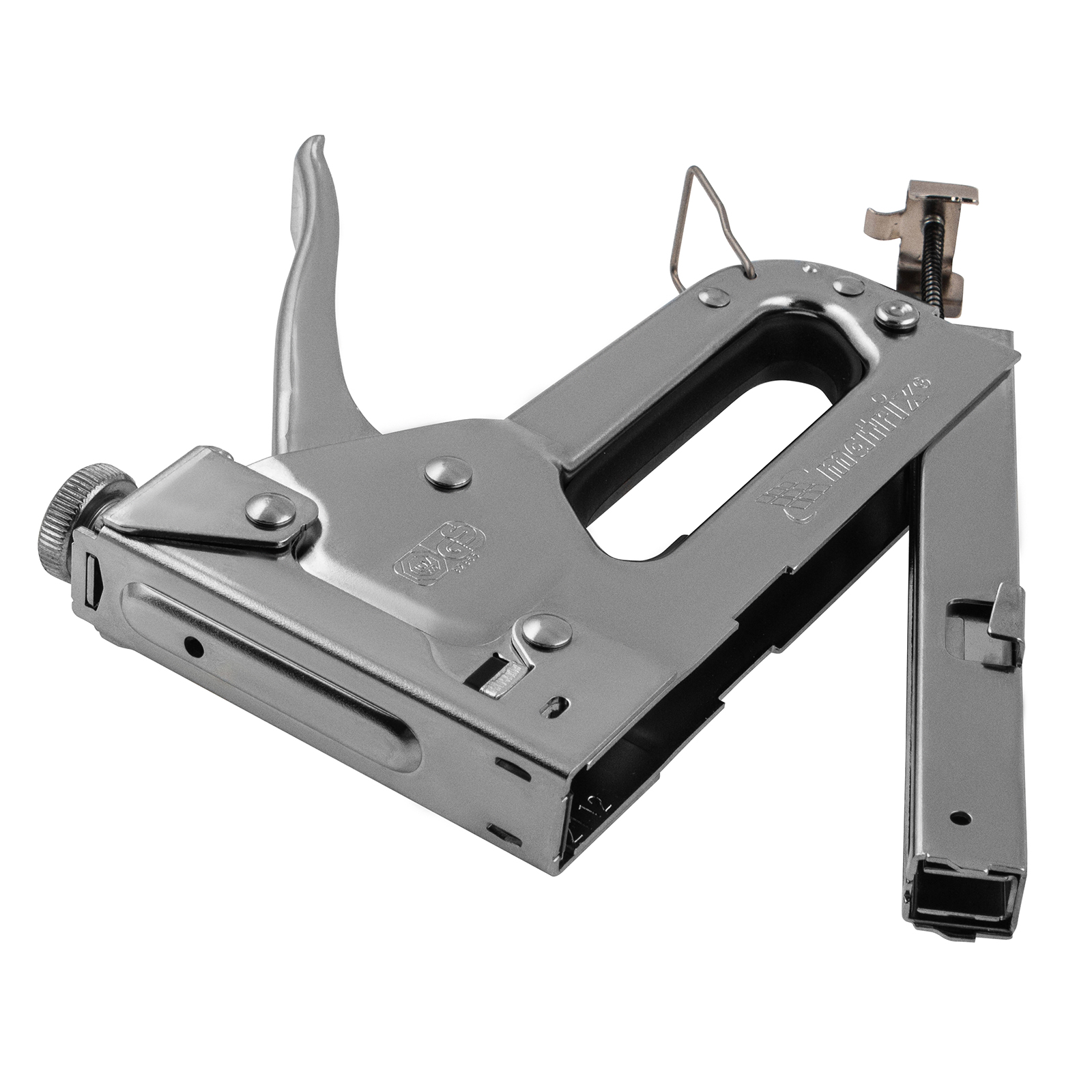 Высокое качество работ — благодаря плавному регулятору силы удара можно следить за глубиной забивания скобы, а запас мощности позволяет справляться с очень прочными материалами, такими как многослойная фанера.