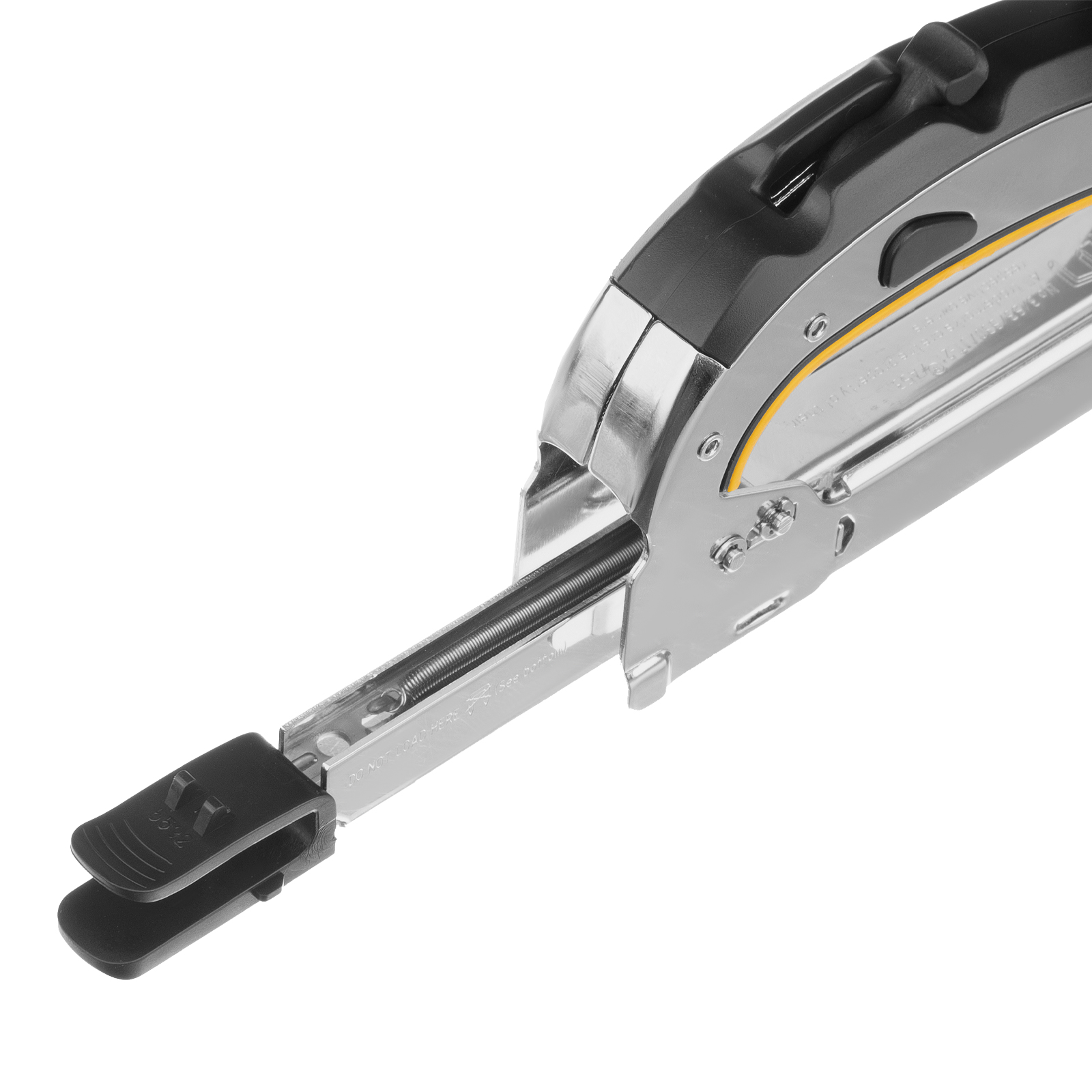 Мебельный степлер Denzel 40211 со стальным корпусом, регулировкой силы удара и функцией быстрой загрузки работает со скобами типа 53 размером 4-14 мм. Используется для фиксации на деревянном основании фанеры, ДВП, оргалита, ткани, утеплителя. Силу удара можно регулировать в зависимости от толщины материала, что обеспечивает высокое качество работ. Степлер будет полезен для обивки мебели, пригодится во время ремонта.