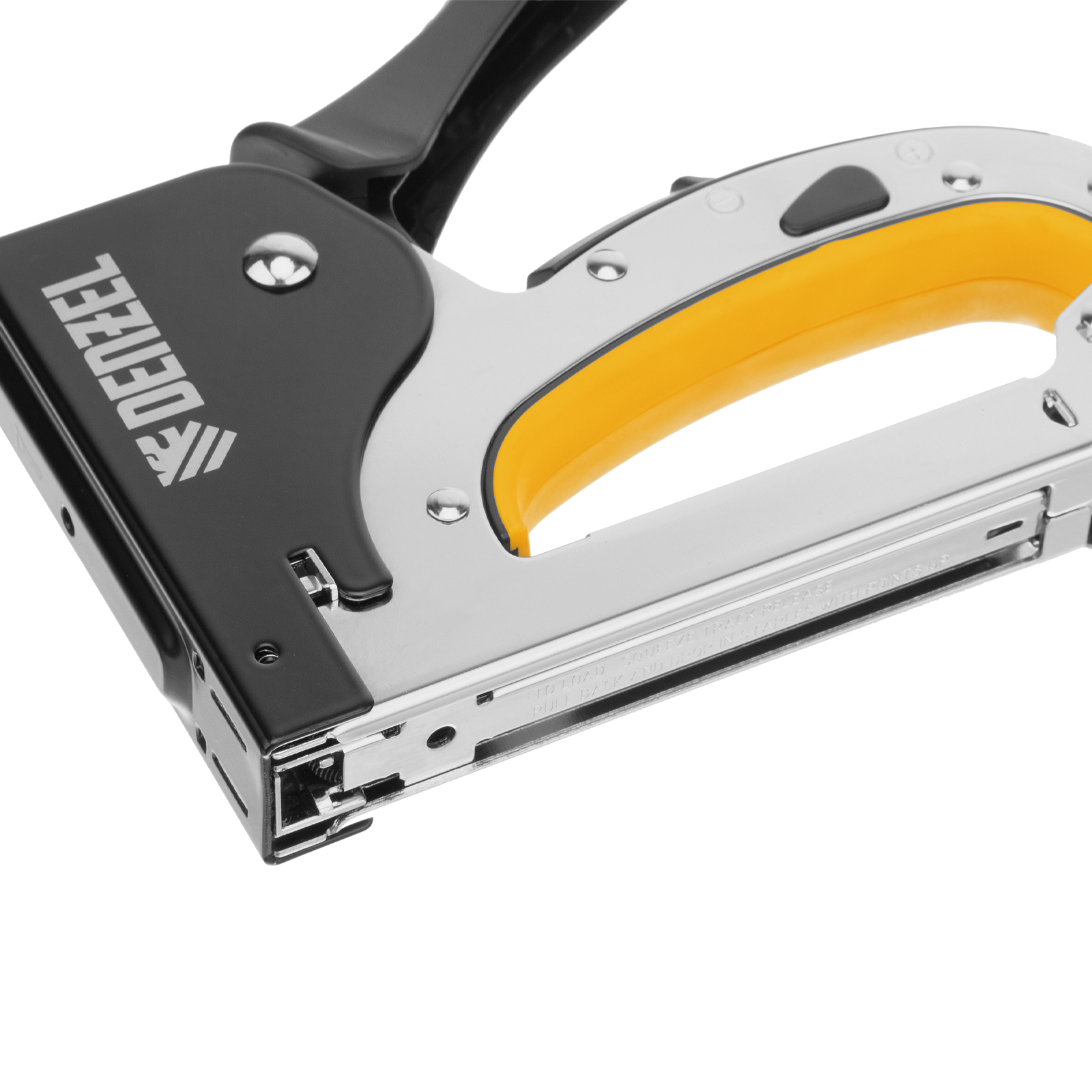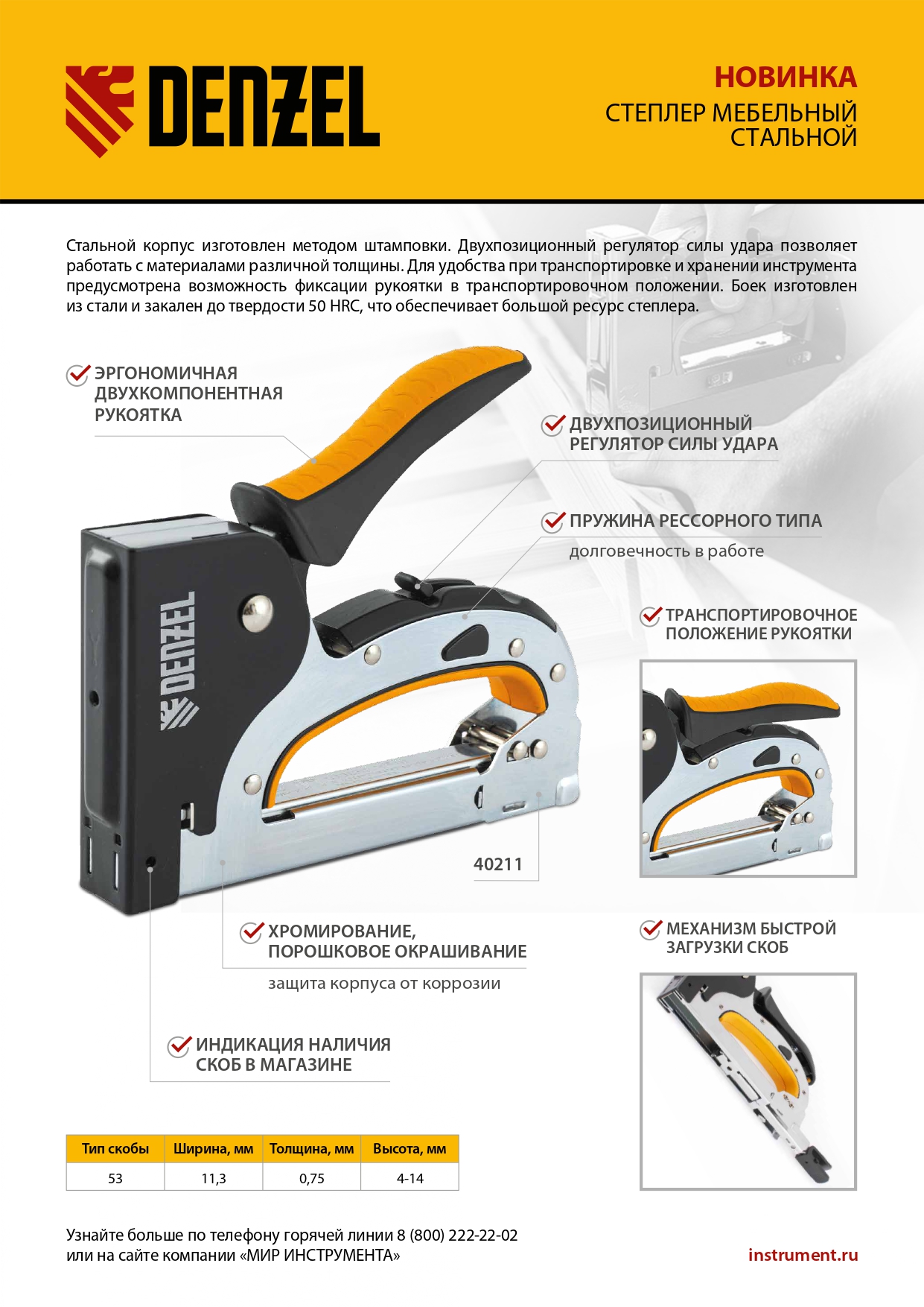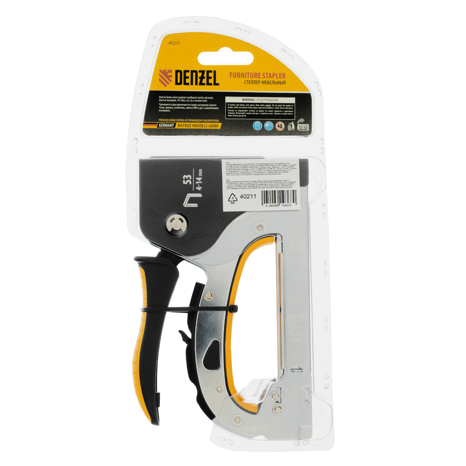<p>Мебельный степлер Denzel 40211 со стальным корпусом, регулировкой силы удара и функцией быстрой загрузки работает со скобами типа 53 размером 4-14 мм. Используется для фиксации на деревянном основании фанеры, ДВП, оргалита, ткани, утеплителя. Силу удара можно регулировать в зависимости от толщины материала, что обеспечивает высокое качество работ. Степлер будет полезен для обивки мебели, пригодится во время ремонта.</p><h2>Преимущества</h2><ul><li>Прочный стальной корпус устойчив к механическим воздействиям и рассчитан на длительное использование.</li><li>Загрузка скоб в скобоприемник занимает несколько секунд, что экономит время мастера.</li><li>Рукоятка с рифленой поверхностью не скользит в руке, обеспечивая комфортную работу.</li></ul>