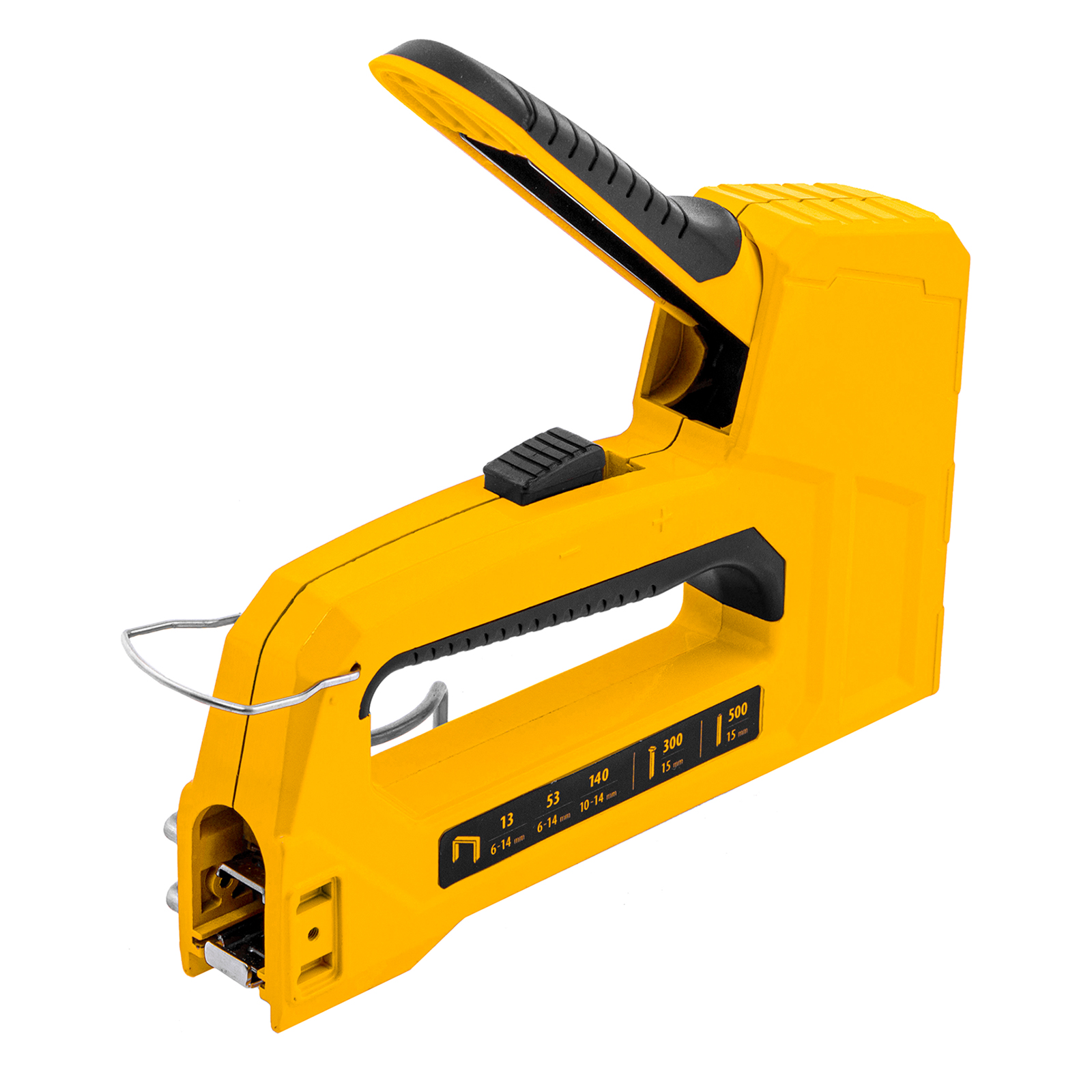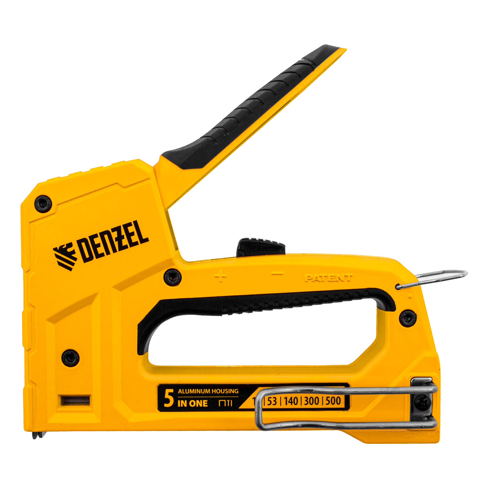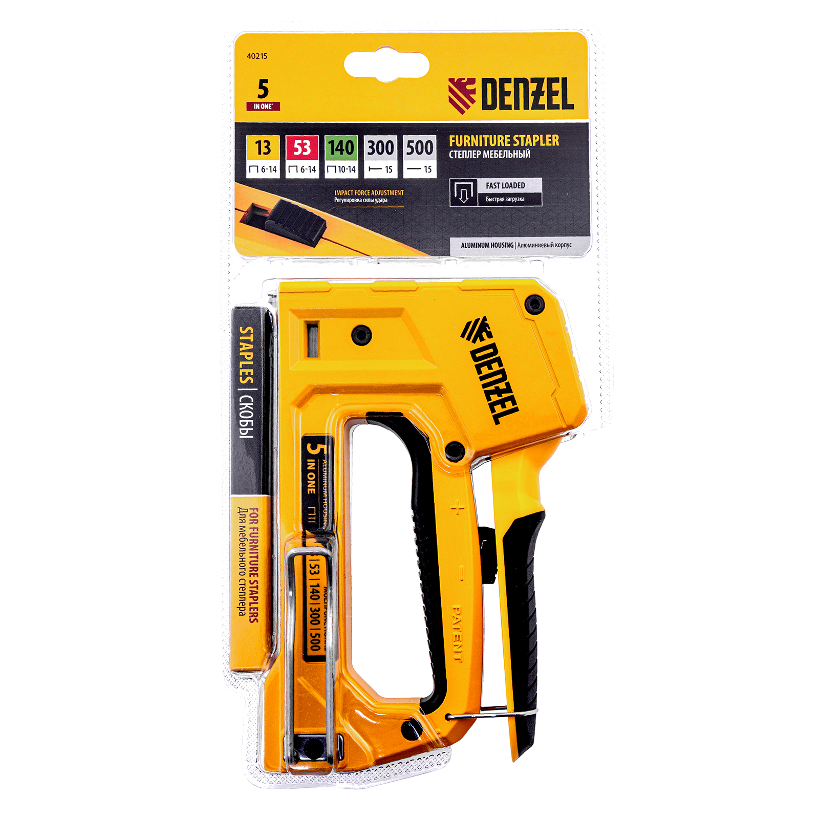 Мебельный степлер Denzel 40215 совместим со скобами типа 53 и 13 размером 6-14 мм, типа 140 размером 10-14 мм, а также с гвоздями типа 300 размером 15 мм и штифтами типа 500 размером 15 мм. Предназначен для фиксации листовых материалов на деревянном основании. Используется для крепления фанеры, ДСП, ДВП, картона, оргалита, изоляционного материала, а также для укладки напольных покрытий, обивки мебели и выполнения багетных работ.