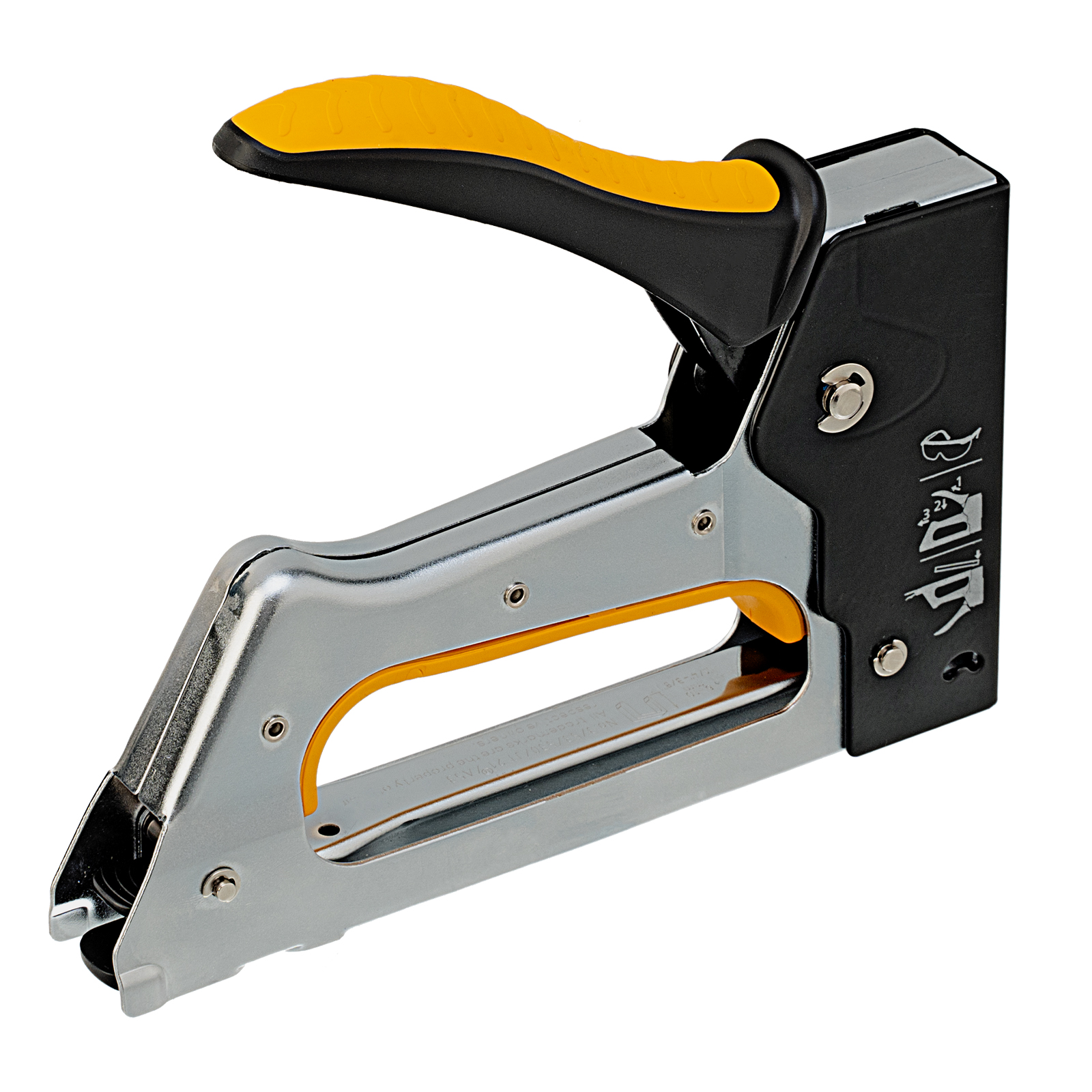 Металлический степлер Denzel 40222 с двухкомпонентной рукояткой используется для сборки и обивки мебели, фиксации изоляционных материалов, а также других монтажных и отделочных работ с помощью скоб типа 53 размером 6-10 мм. Позволяет быстро соединять с деревянным основанием листовые материалы из ДВП, ДСП, картона, оргалита, фанеры, пленки ПВХ. Благодаря рессорному ударному механизму инструмент не требует от пользователя значительных усилий, поэтому подходит для длительной работы.