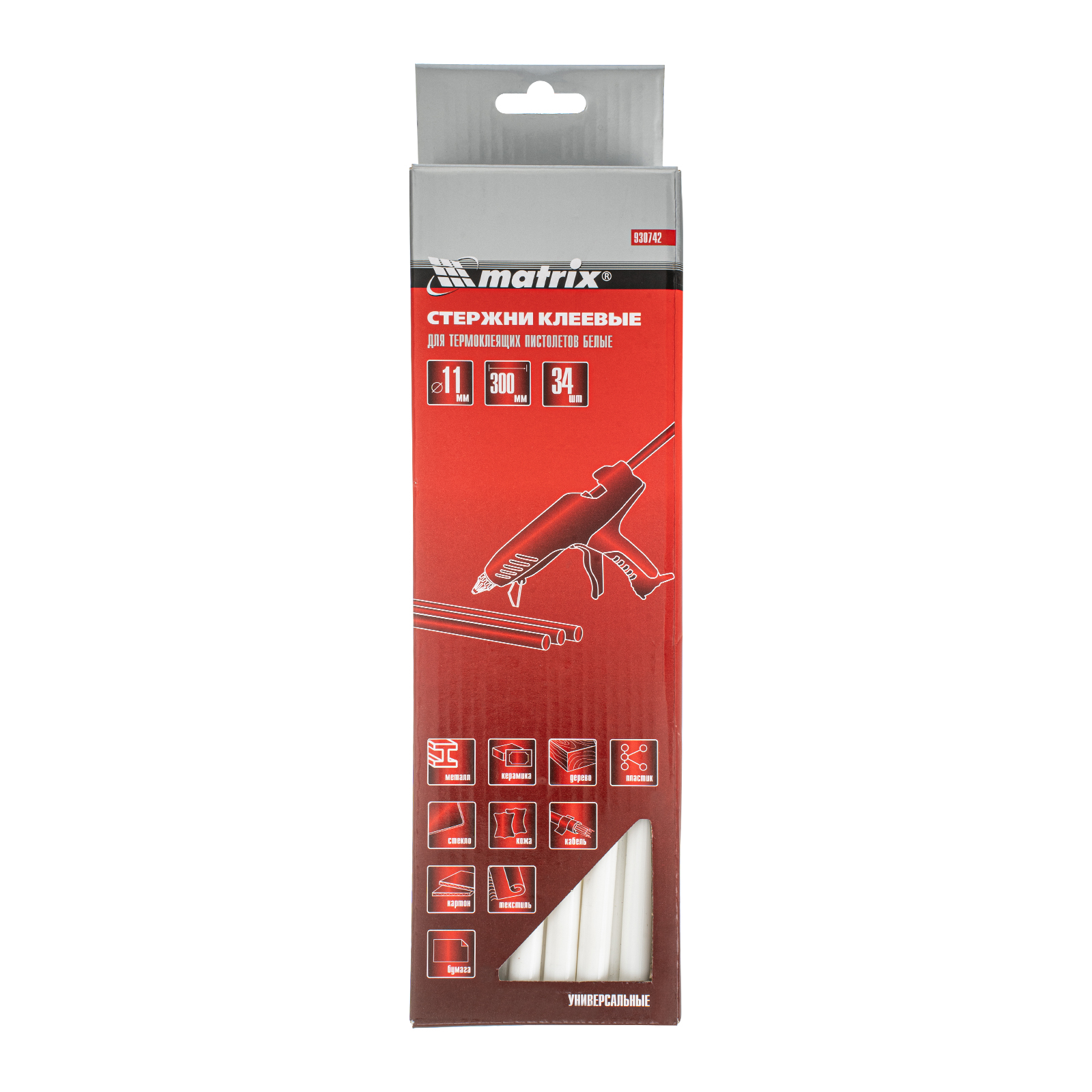 Белые клеевые стержни Matrix 930742 длиной 300 мм, общим весом 1 кг, — расходные материалы для клеевых пистолетов калибра 11 мм. Обеспечивают надежное сцепление различных материалов: бумаги, пластика, древесины, керамики, электрических плат и т.д. Подходят также для герметизации швов и трещин.