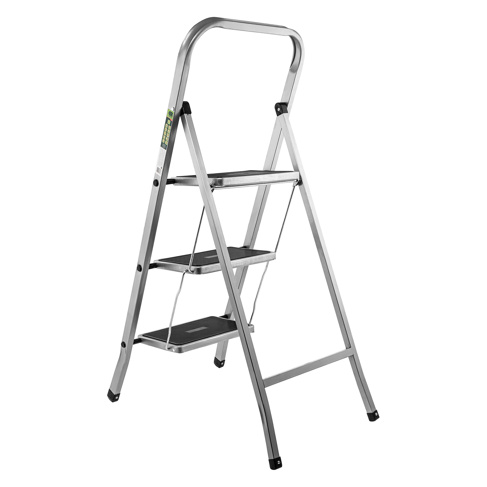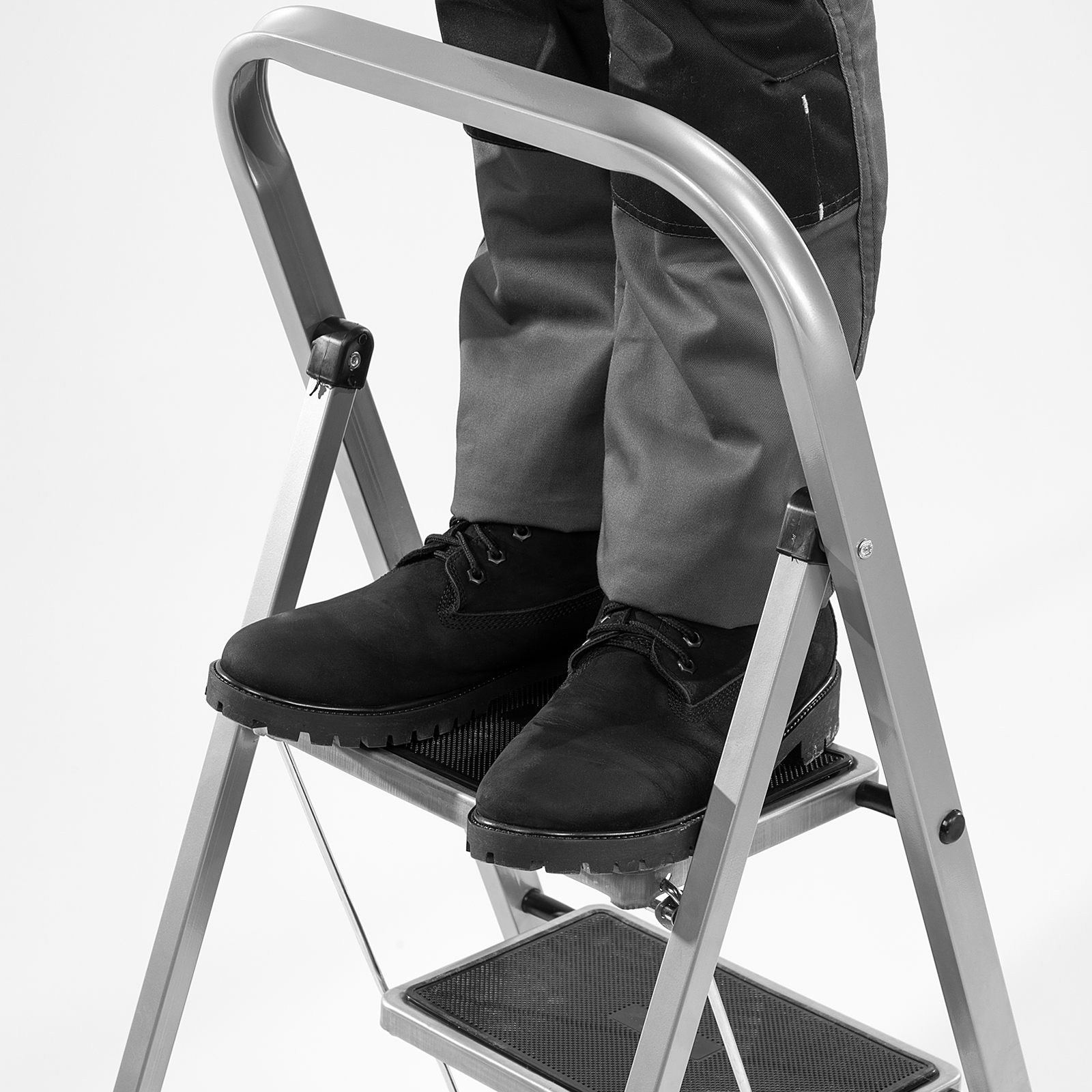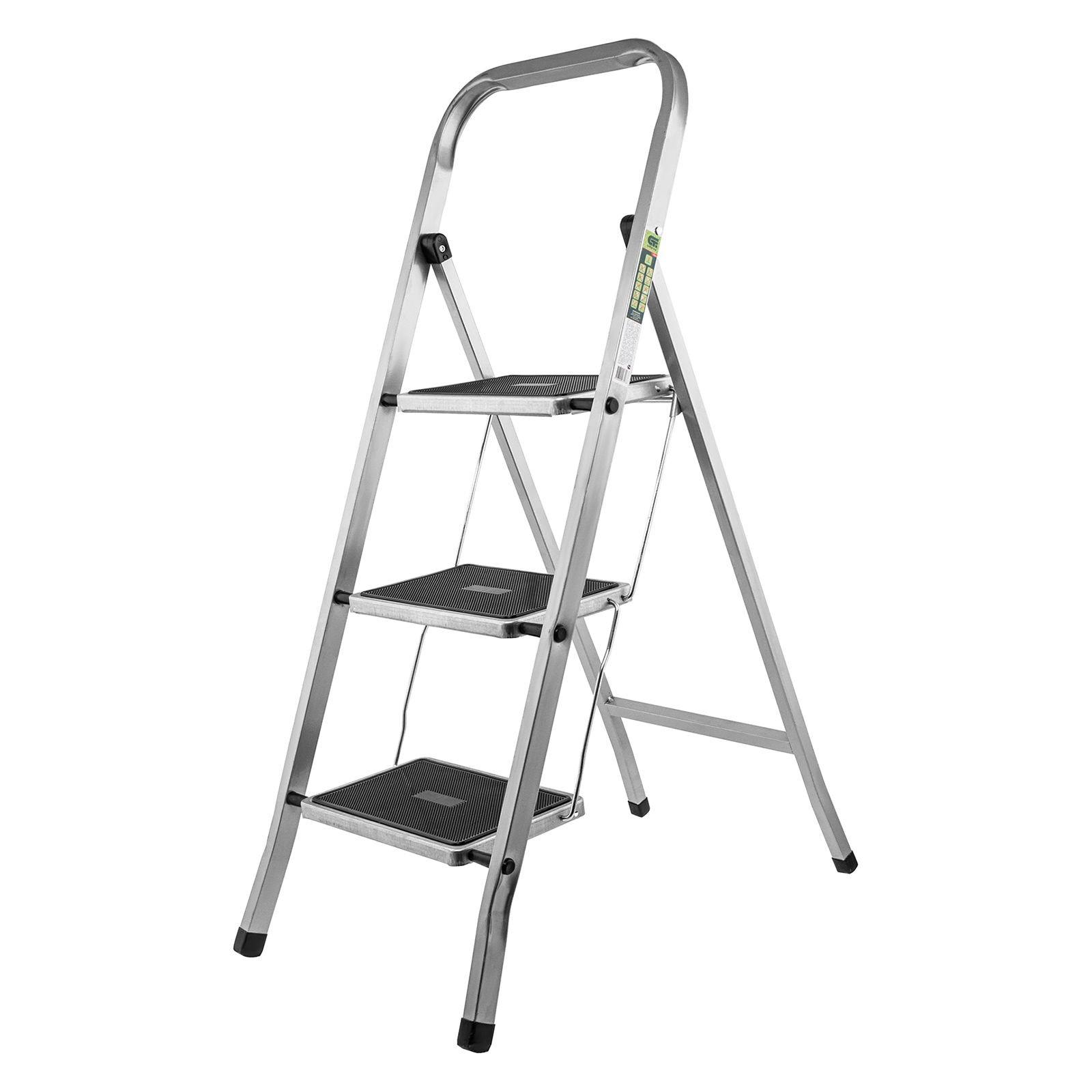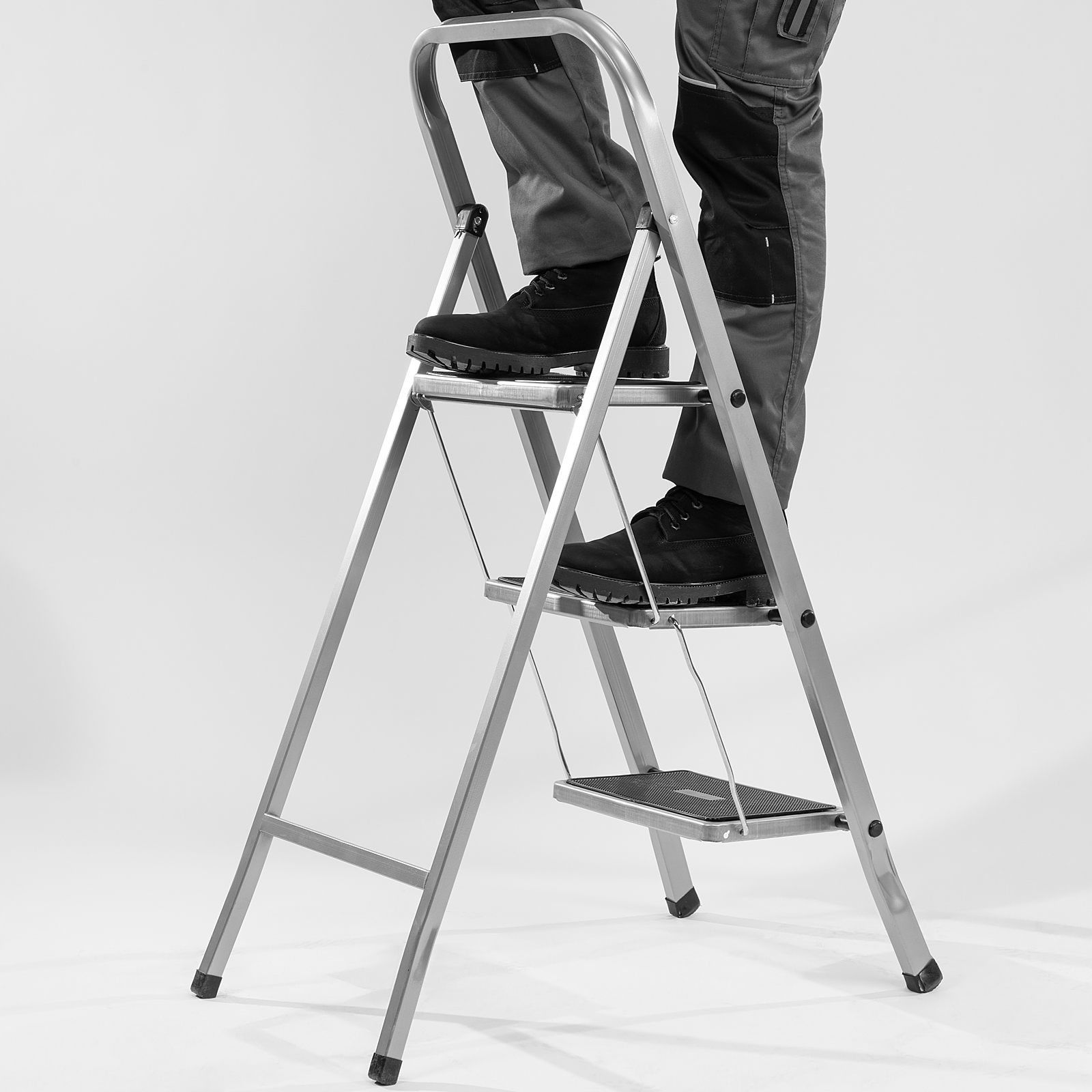 Прочность — рама и ступени изготовлены из стали, поэтому стремянка выдерживает нагрузку 120 кг.