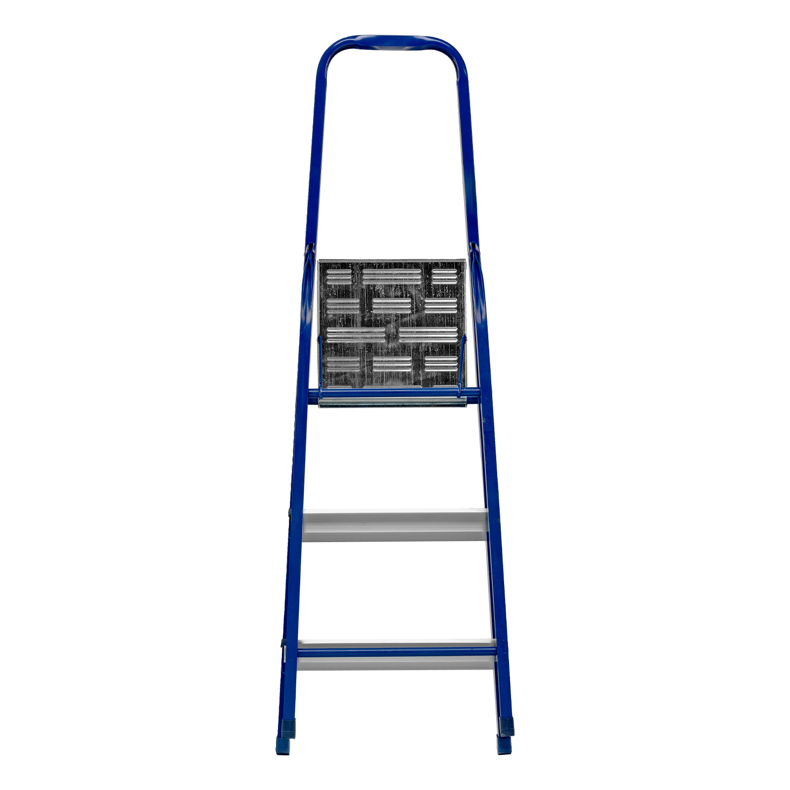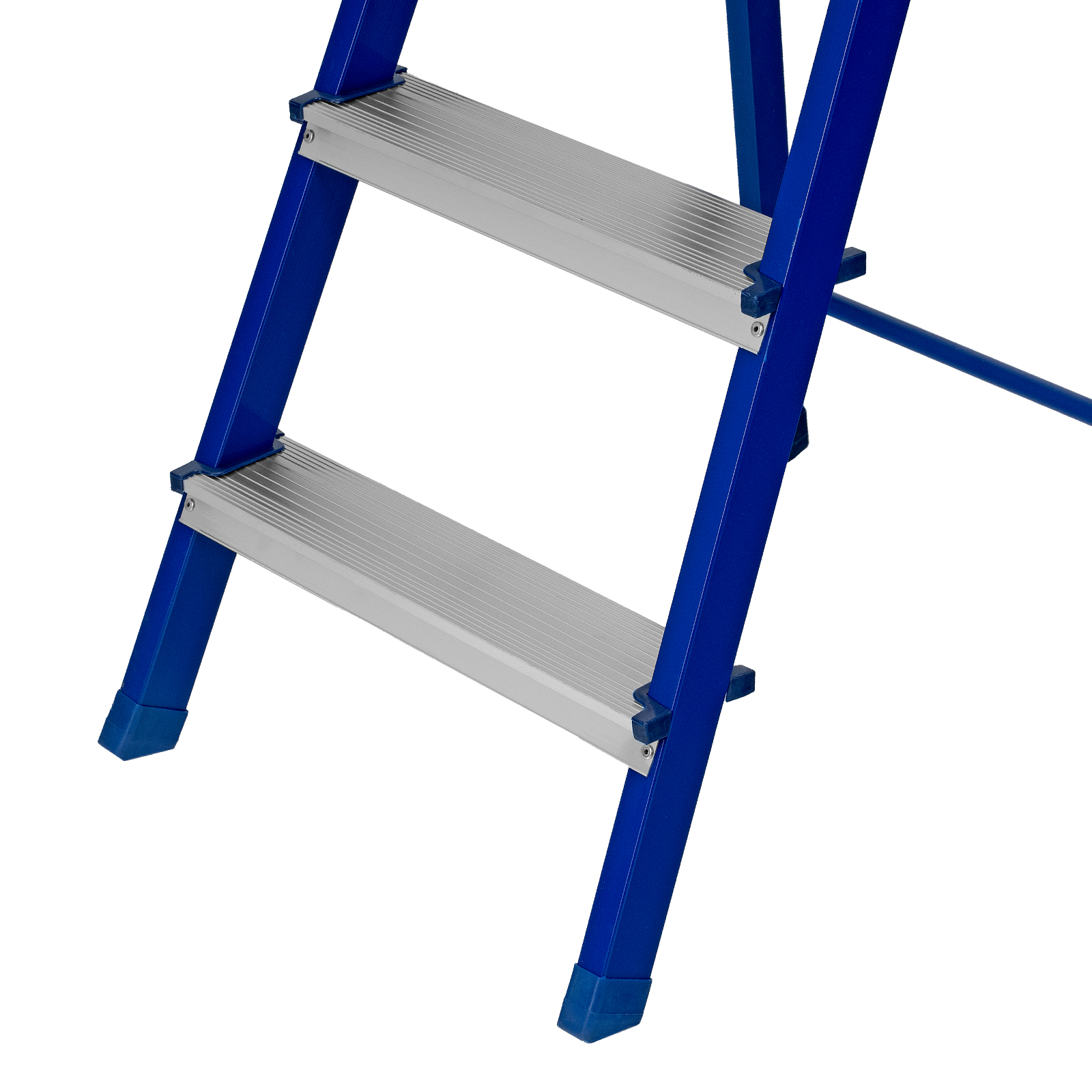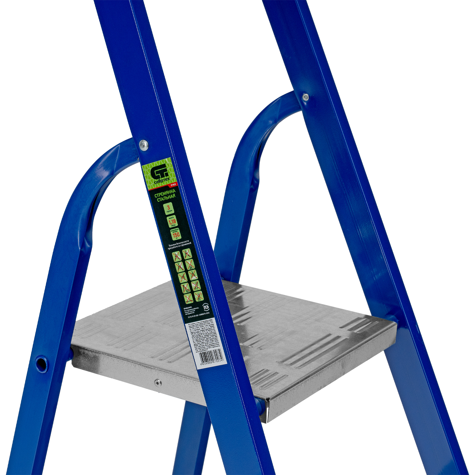 Надежная конструкция — рама изготовлена из профилированной стали, стальная верхняя площадка с зацепами прочно фиксирует стремянку в рабочем положении.