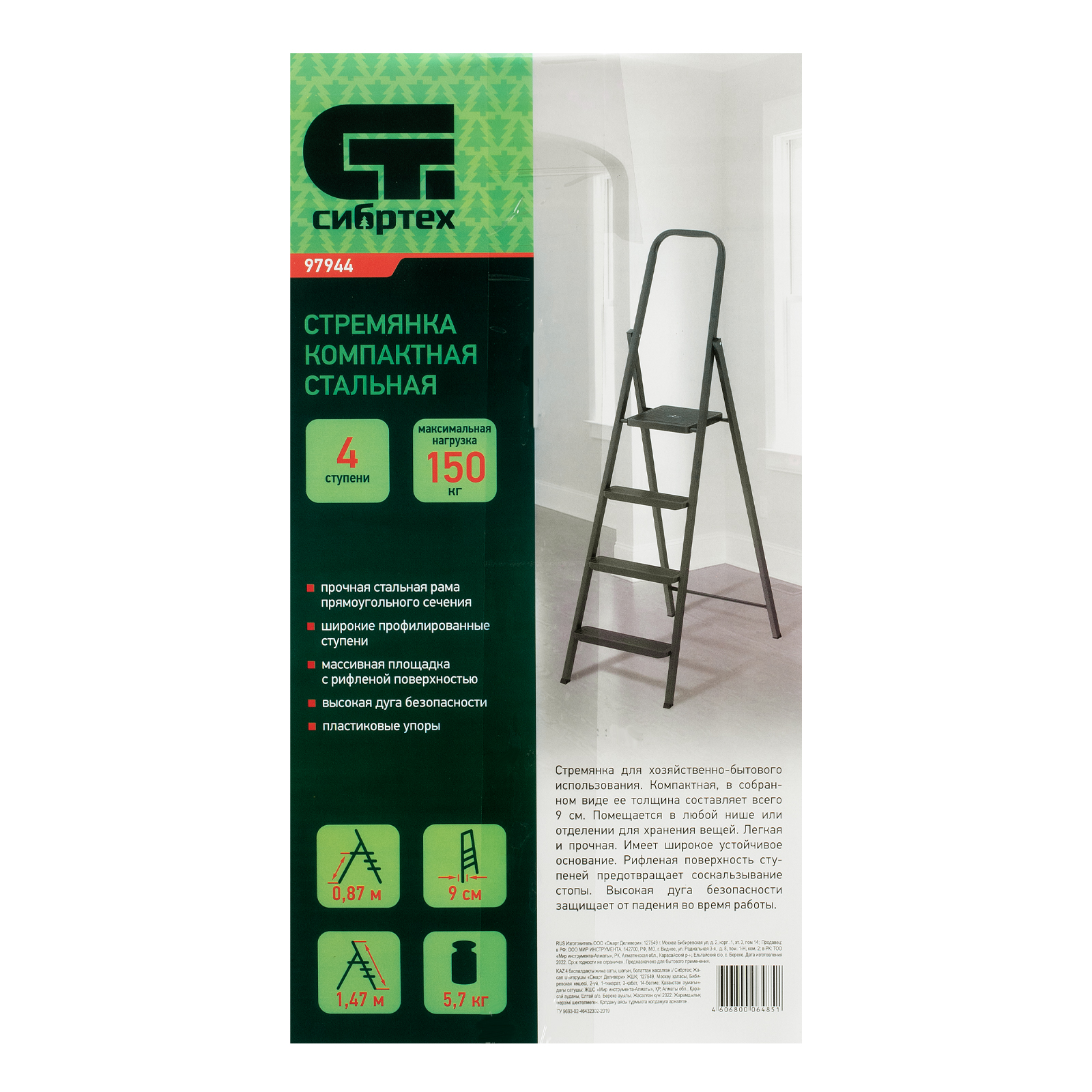 Стремянка компактная стальная Сибртех 97944 с 4 ступенями служит для проведения работ на высоте, превышающей человеческий рост. Стальные профилированные рама и ступени рассчитаны на нагрузку до 150 кг. Площадка находится на высоте 87 см от опорной поверхности, рабочая высота стремянки составляет 287 см (при среднем росте пользователя 170 см). Использовать стремянку можно дома, на даче или в гараже, а также во время строительства и ремонта.