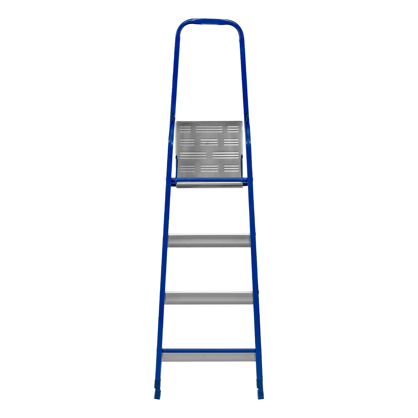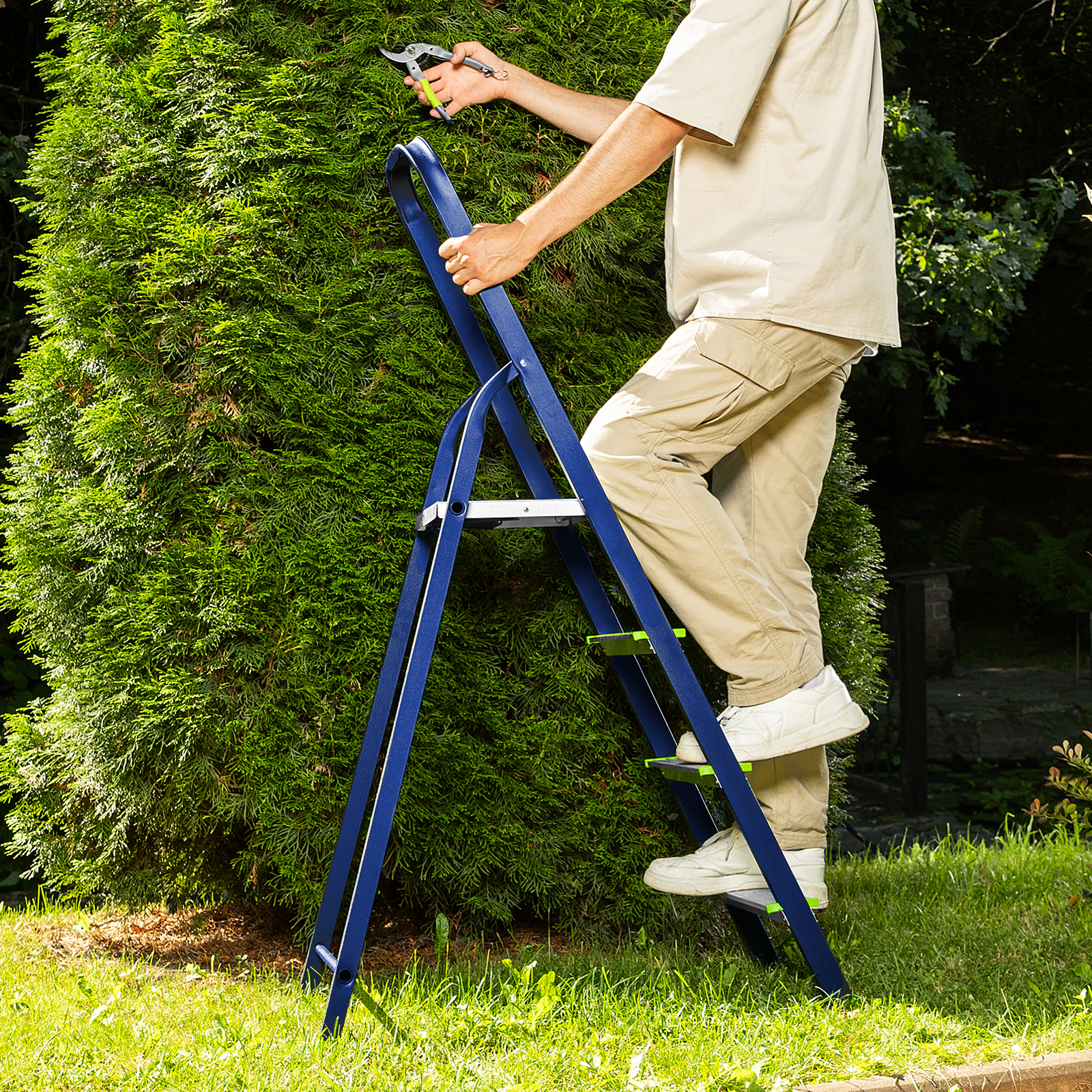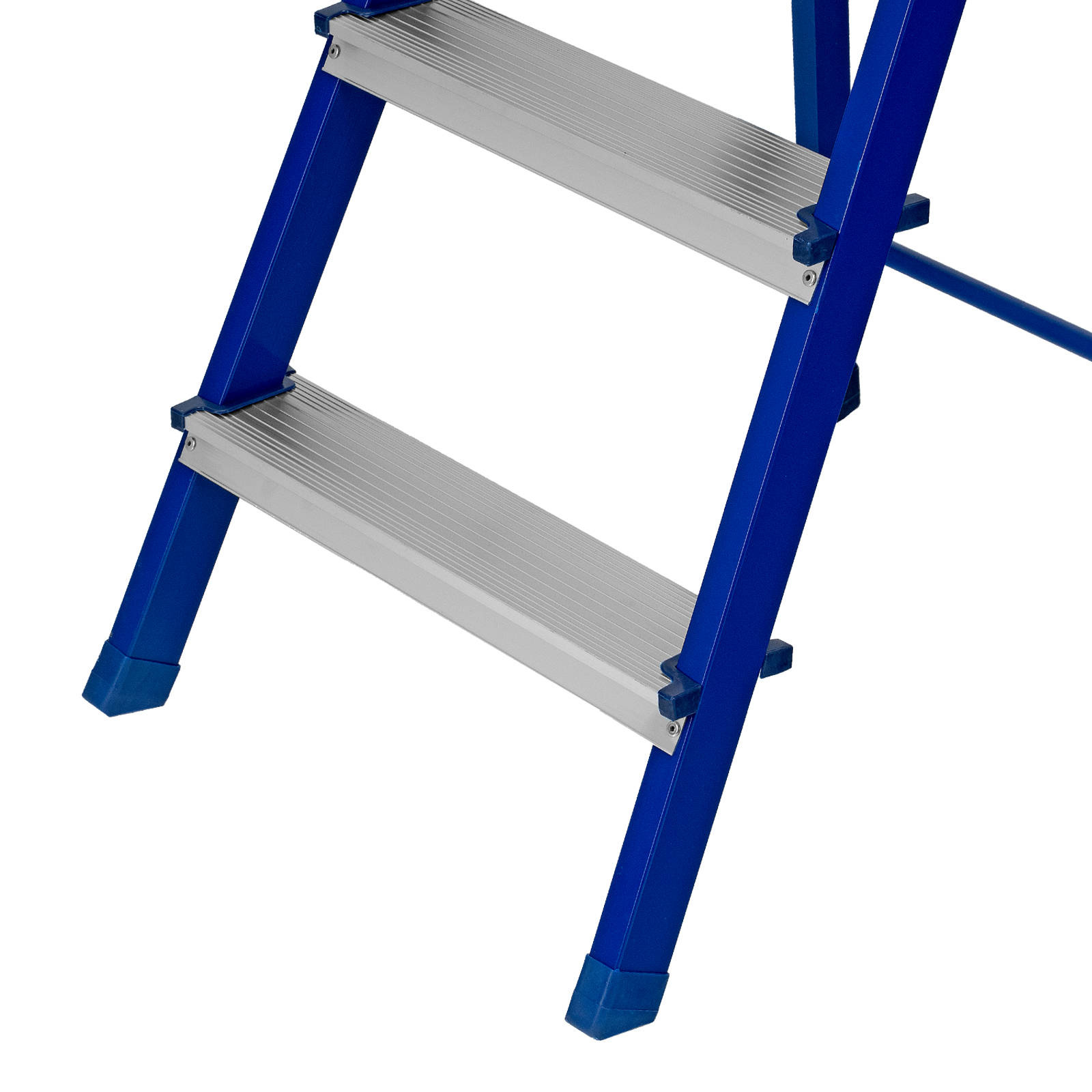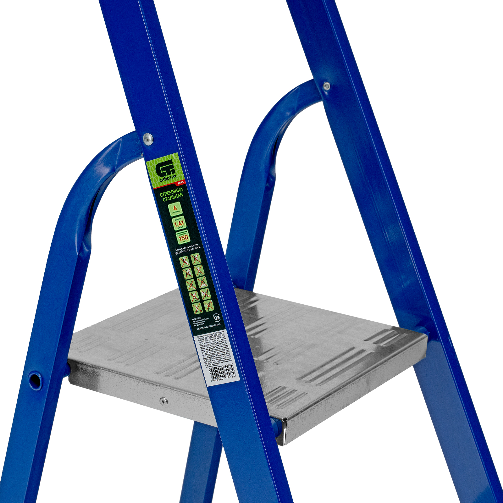 Надежная конструкция — рама изготовлена из профилированной стали, стальная верхняя площадка с зацепами прочно фиксирует стремянку в рабочем положении.