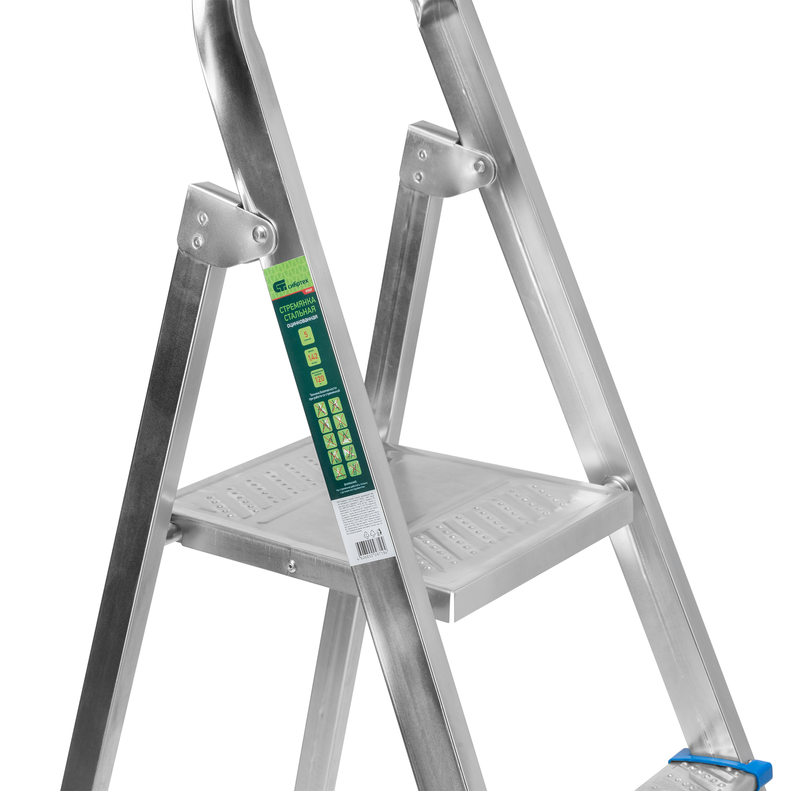Стальная оцинкованная стремянка Сибртех 97837 с 5 ступенями позволяет повесить полку, картину или шкафчик, достать нужный предмет и решить другие задачи, для которых требуется доступ к предметам на высоте. Рама и ступени из стального профиля выдерживают вес до 120 кг. Расстояние от опорной поверхности до площадки составляет 99 см, при среднем росте пользователя 170 см рабочая высота лестницы — 299 см. Необходимо соблюдать технику безопасности: размещать стремянку только на ровной плоскости и не использовать ее для работы с дрелью, шуруповертом и другим электроинструментом.