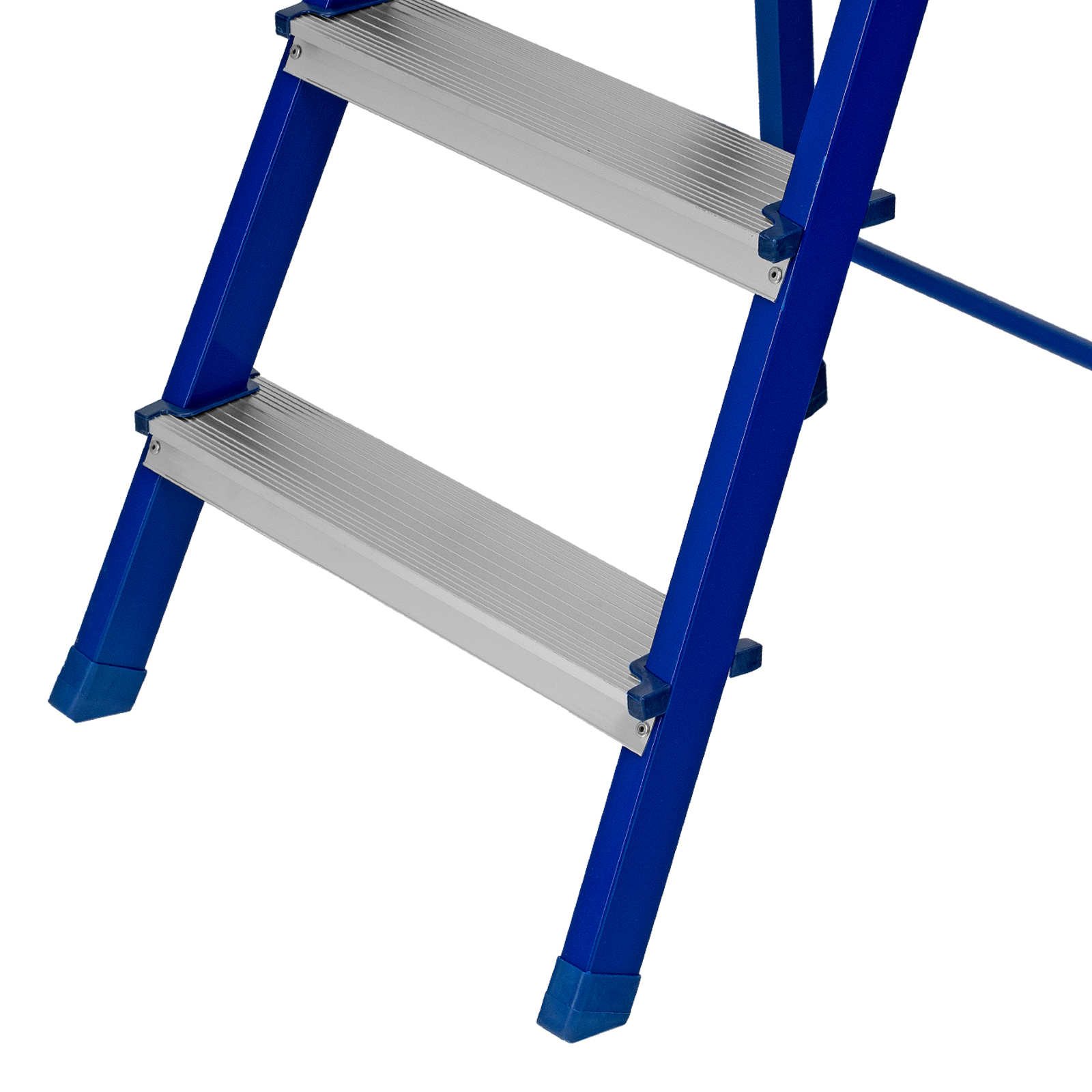 - Надежность — рама изготовлена из профилированной стали, стальная верхняя площадка с зацепами прочно фиксирует стремянку в рабочем положении, страховочные ленты придают дополнительную прочность конструкции.