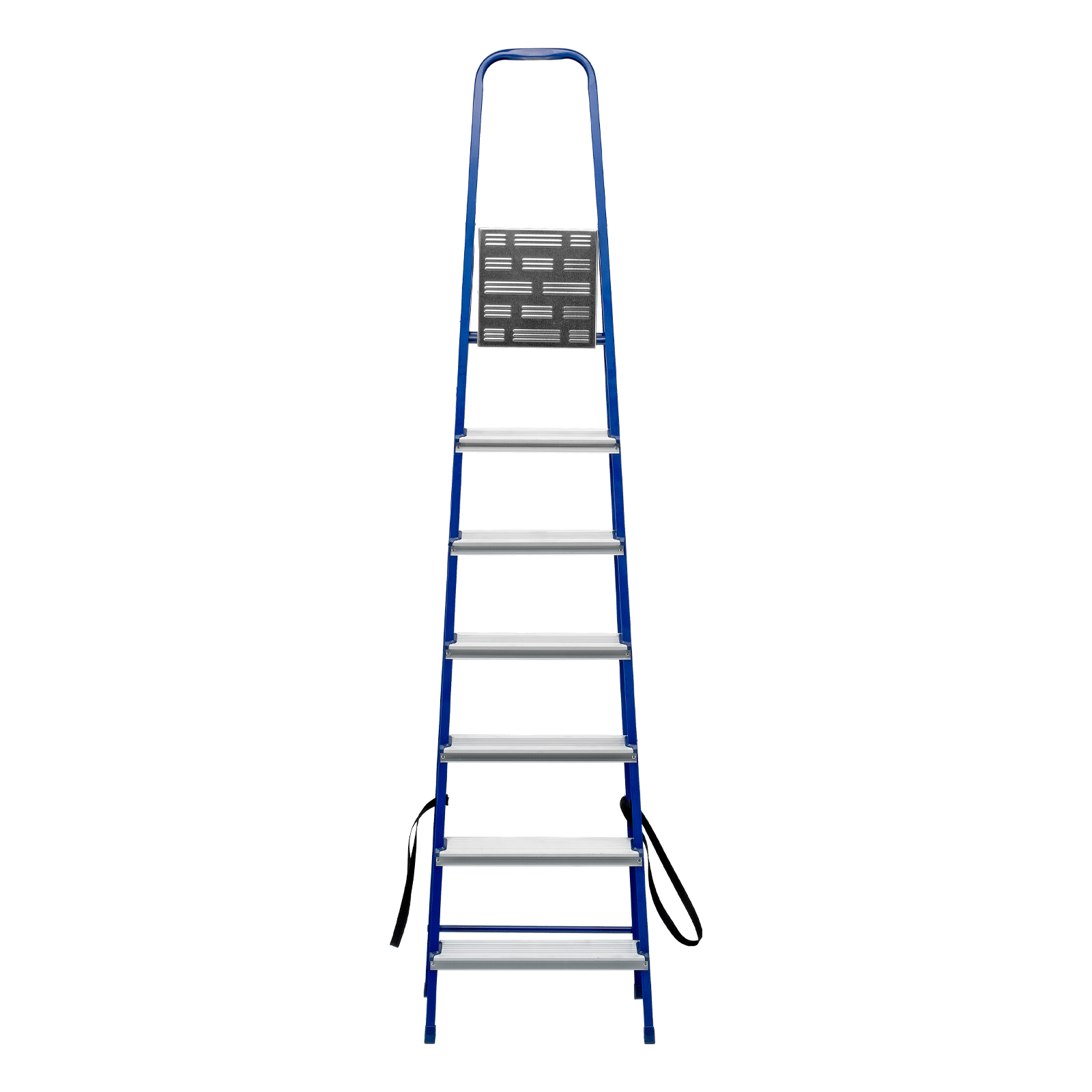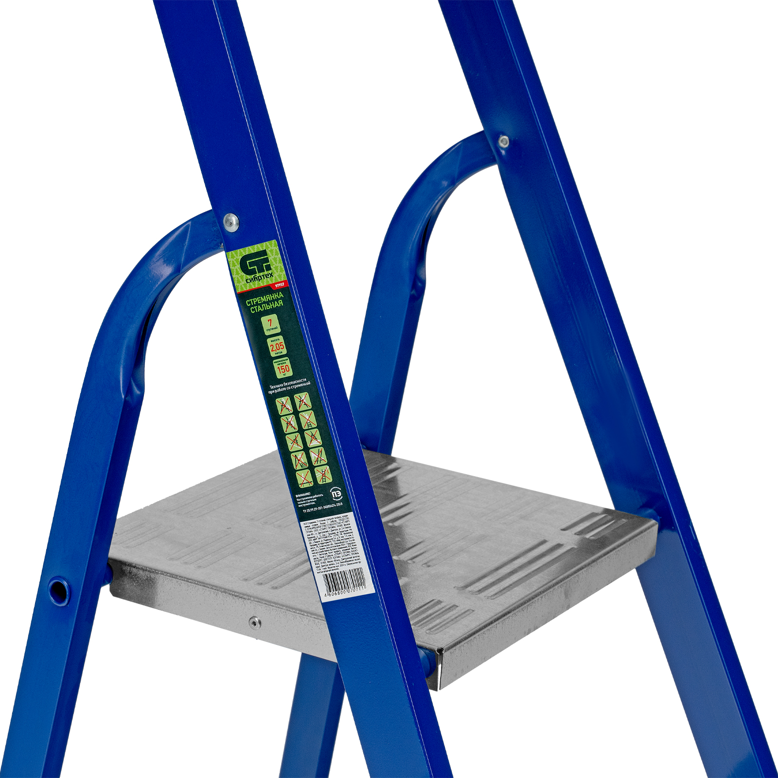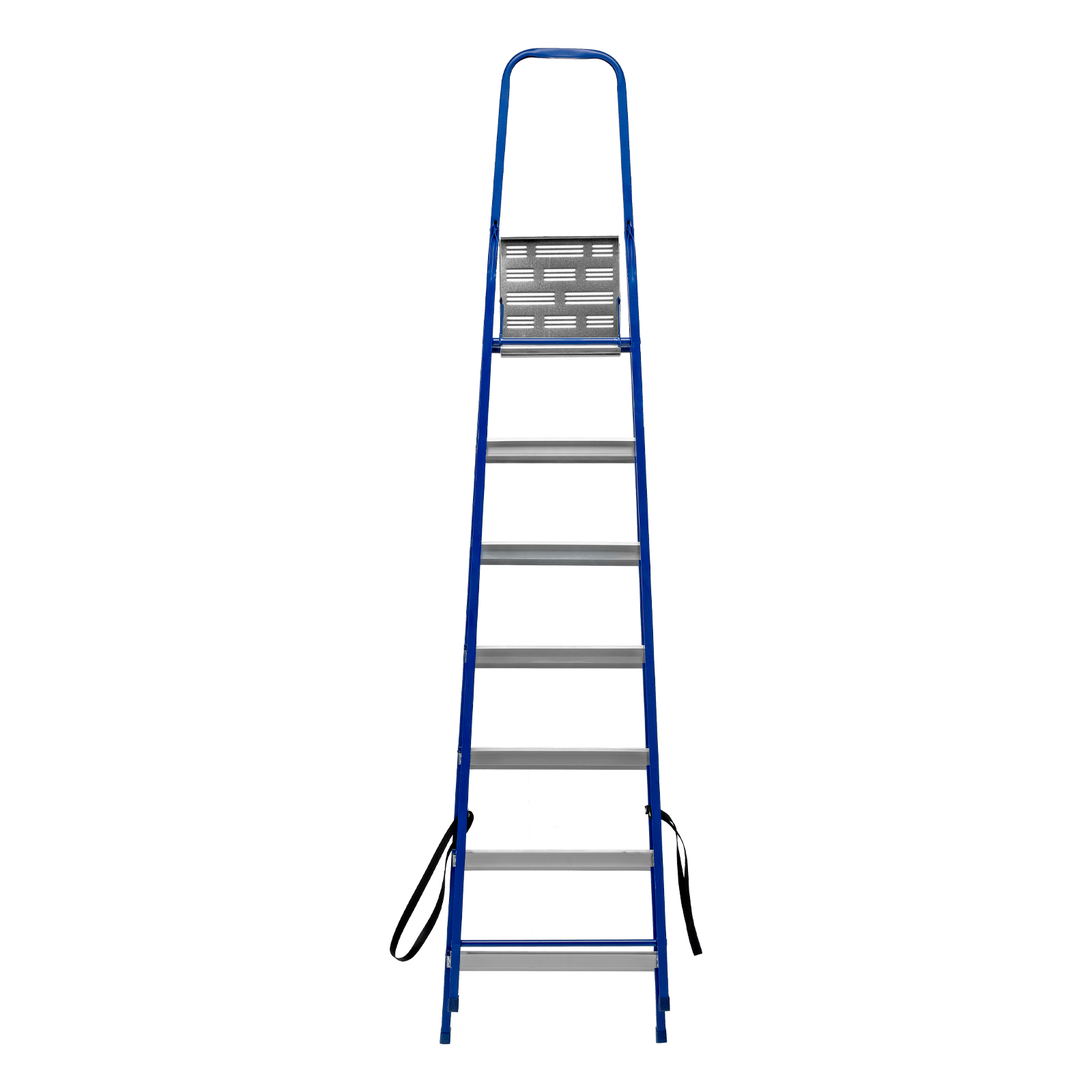 Надежность — рама изготовлена из профилированной стали, стальная верхняя площадка с зацепами прочно фиксирует стремянку в рабочем положении, страховочные ленты придают дополнительную прочность конструкции.