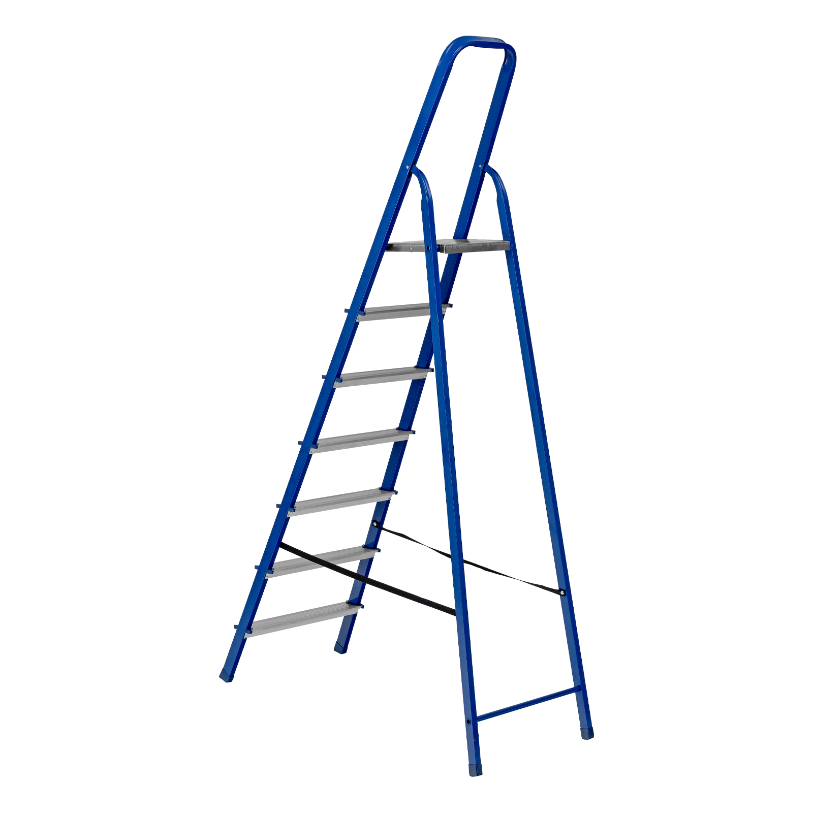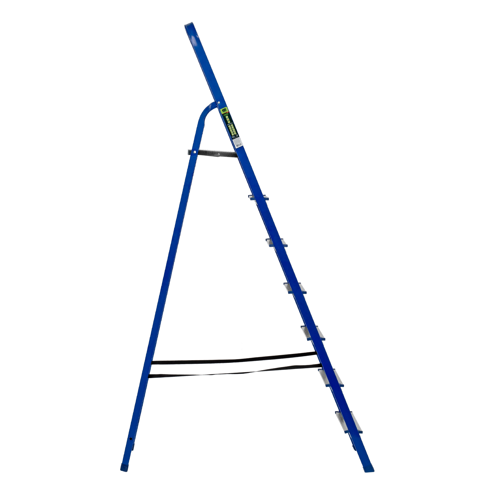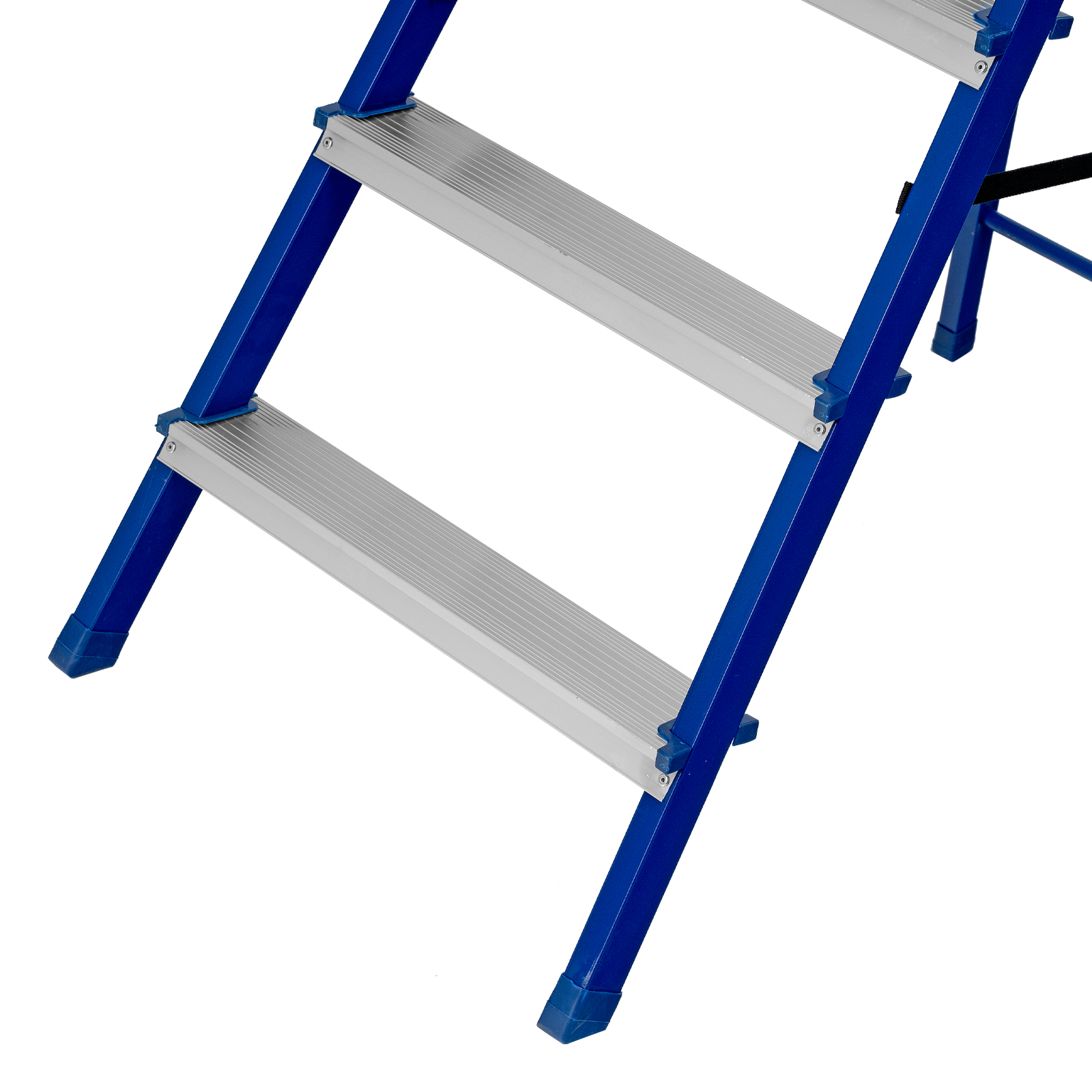 Надежность — рама изготовлена из профилированной стали, стальная верхняя площадка с зацепами прочно фиксирует стремянку в рабочем положении, страховочные ленты придают дополнительную прочность конструкции.