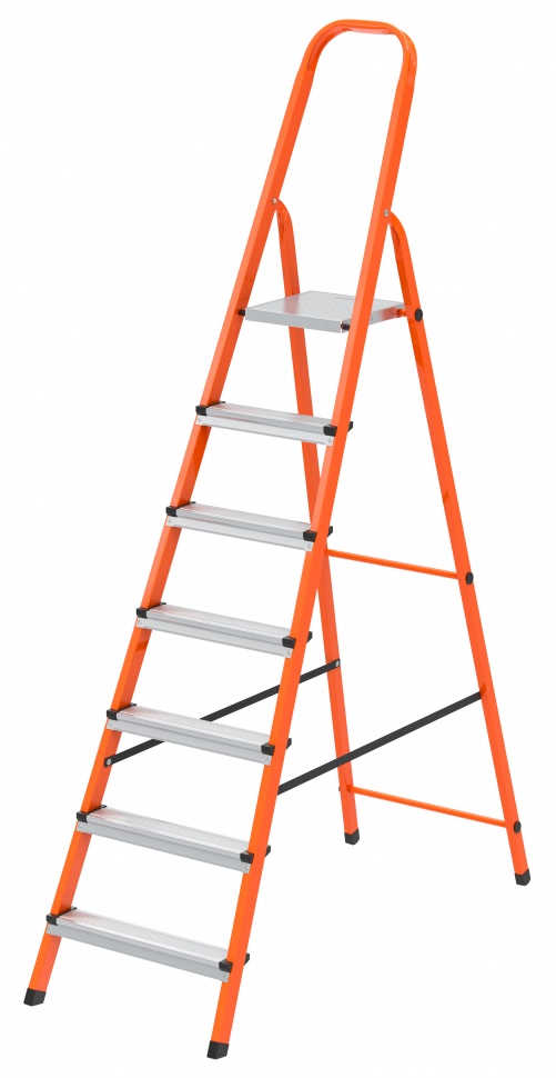 Стремянка оранжевая Сибртех 97967 со стальным профилем и 7 ступенями из стали используется, чтобы достать нужный предмет с антресолей или высокой полки, вытереть пыль на шкафу, заменить лампочку в люстре, а также решить другие бытовые вопросы. Также будет полезна для выполнения малярных и монтажных работ. Лестница рассчитана на нагрузку до 150 кг. Площадка находится на высоте 142,5 см от опорной поверхности, рабочая высота стремянки составляет 342,5 см (при среднем росте пользователя 170 см). Стремянка имеет широкое основание и характеризуется устойчивостью.
